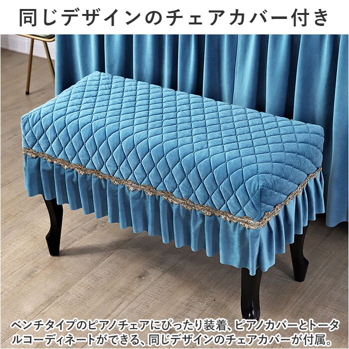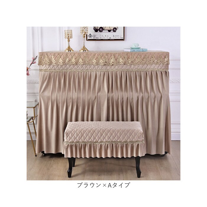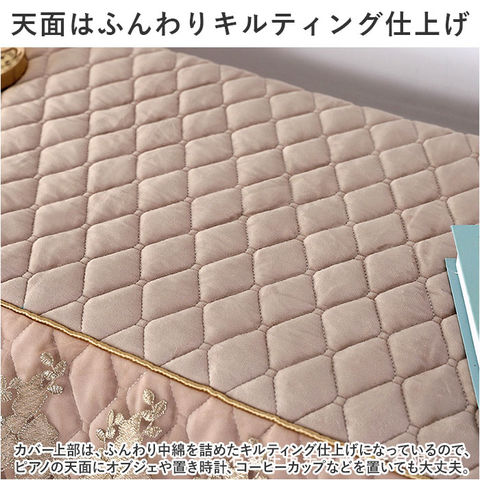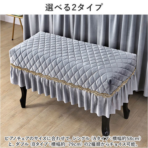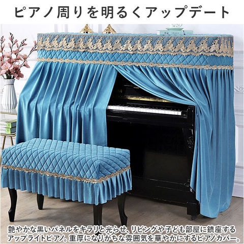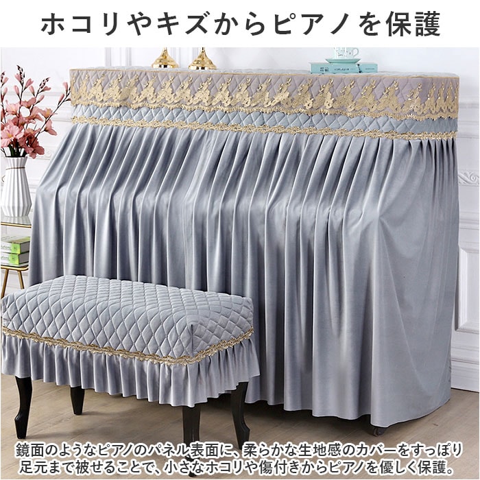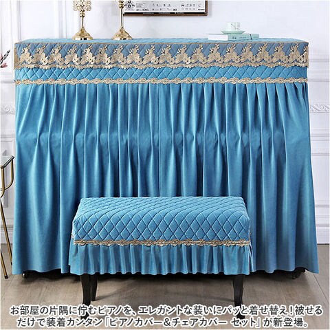 | 商品説明 | お部屋の片隅に佇むピアノを、エレガントな装いにパッと着せ替え!ふわっと被せるだけで装着カンタン「ピアノカバー&チェアカバー セット」が新登場。【ピアノ周りを明るくアップデート】艶やかな黒いパネルをキラリと光らせ、リビングや子ども部屋に鎮座するアップライトピアノ。重厚になりがちな雰囲気を華やかにアップデートするピアノカバー。【ホコリやキズからピアノを保護】鏡面のようなピアノのパネル表面に、柔らかな生地感のカバーをすっぽり足元まで被せることで、降り積もる小さなホコリや傷付きからピアノを優しく保護。【カバーを外さず、そのまま弾ける】指触り滑らかでほのかな光沢が美しいベルベット調生地をゆったりとドレープさせ、贅沢なボリューム感を演出。中央のスリット部分を左右に開けば、カバーを外さずにピアノ演奏が可能。【天面はふんわりキルティング仕上げ】カバー上部は、ふんわり中綿を詰めたキルティング仕上げになっているので、ピアノの天面にオブジェや置き時計、コーヒーカップなどを置いても大丈夫。【同じデザインのチェアカバー付き】ベンチタイプのピアノチェアにぴったり装着、ピアノカバーとトータルコーディネートができる、同じデザインのチェアカバーが付属。【選べる2タイプ】お手持ちのピアノチェアのサイズに合わせて、シングルチェアカバー(Aタイプ:横幅約58cm)と、ダブルチェアカバー(Bタイプ:横幅約:79cm)の2種類からお好みのタイプがチョイス可能。【ご家庭でカンタンお洗濯】ピアノカバーもチェアカバーも、手軽にお手入れができる簡単ウォッシャブル仕様。いつでも清潔に使えて、小さなお子様がいるご家庭でも安心。(※洗濯ネットをご使用ください。)【リッチな風合いで気持ち華やぐ】ピアノルームをちょっぴり贅沢に彩る、上品で深みのあるカラーバリエーション。はかなげなチュールにゴールド色の刺繍糸を繊細に編み込んだ、アンティーク風レースが華やかなアクセント。 |