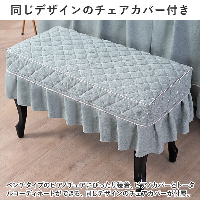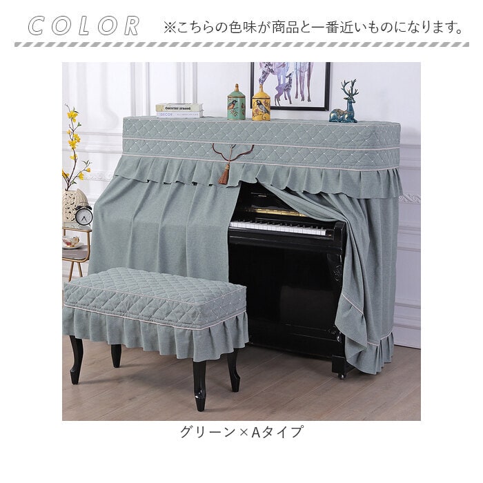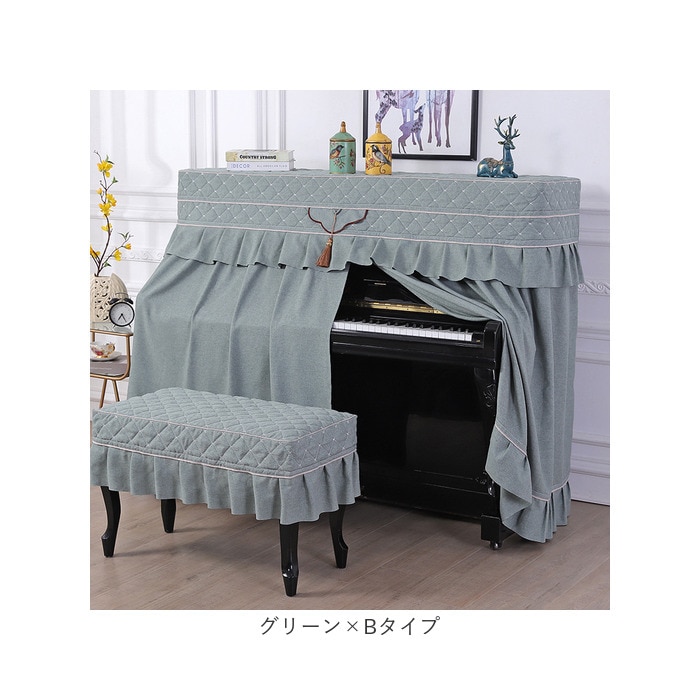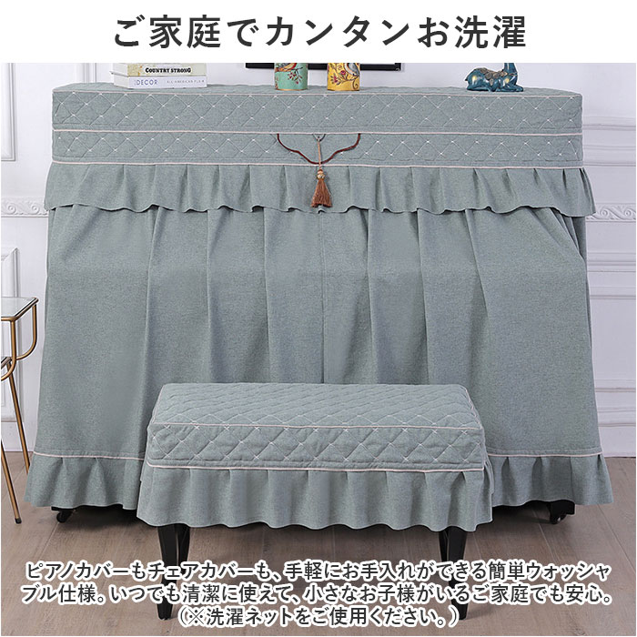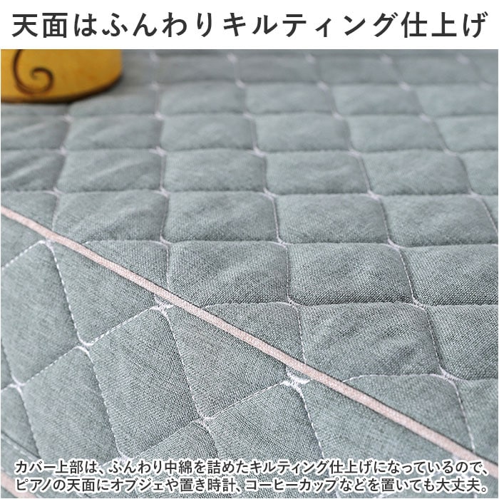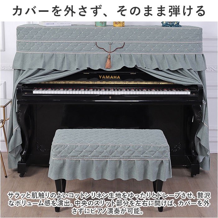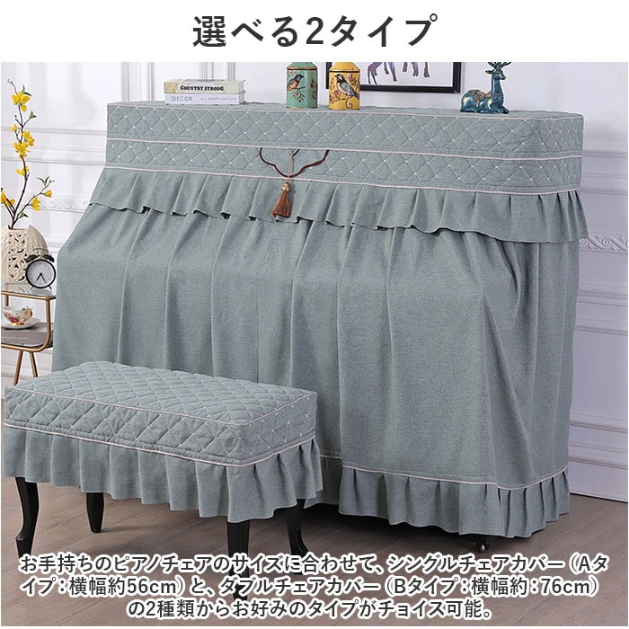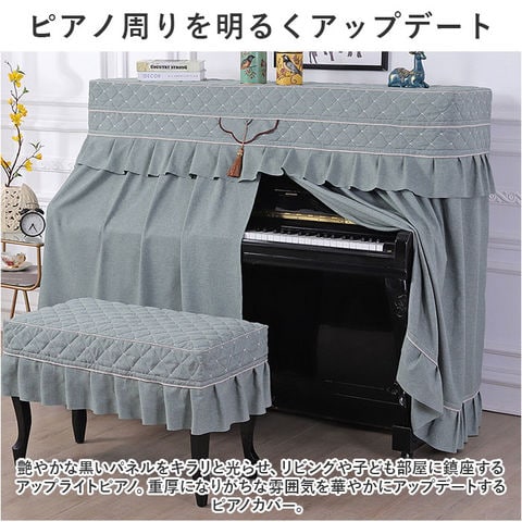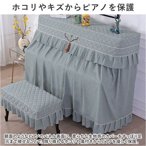 | 商品説明 | お部屋の片隅に佇むピアノを、エレガントな装いにパッと着せ替え!ふわっと被せるだけで装着カンタン「ピアノカバー&チェアカバー セット」が新登場。【ピアノ周りを明るくアップデート】艶やかな黒いパネルをキラリと光らせ、リビングや子ども部屋に鎮座するアップライトピアノ。重厚になりがちな雰囲気を華やかにアップデートするピアノカバー。【ホコリやキズからピアノを保護】鏡面のようなピアノのパネル表面に、柔らかな生地感のカバーをすっぽり足元まで被せることで、降り積もる小さなホコリや傷付きからピアノを優しく保護。【カバーを外さず、そのまま弾ける】サラッと肌触りのよいコットンリネン生地をゆったりとドレープさせ、贅沢なボリューム感を演出。中央のスリット部分を左右に開けば、カバーを外さずにピアノ演奏が可能。【天面はふんわりキルティング仕上げ】カバー上部は、ふんわり中綿を詰めたキルティング仕上げになっているので、ピアノの天面にオブジェや置き時計、コーヒーカップなどを置いても大丈夫。【同じデザインのチェアカバー付き】ベンチタイプのピアノチェアにぴったり装着、ピアノカバーとトータルコーディネートができる、同じデザインのチェアカバーが付属。【選べる2タイプ】お手持ちのピアノチェアのサイズに合わせて、シングルチェアカバー(Aタイプ:横幅約56cm)と、ダブルチェアカバー(Bタイプ:横幅約:76cm)の2種類からお好みのタイプがチョイス可能。【ご家庭でカンタンお洗濯】ピアノカバーもチェアカバーも、手軽にお手入れができる簡単ウォッシャブル仕様。いつでも清潔に使えて、小さなお子様がいるご家庭でも安心。(※洗濯ネットをご使用ください。)【お部屋に馴染むソフトなカラー】お部屋の雰囲気にすっきり調和する、柔らかく落ち着いた雰囲気のカラーバリエーション。艶やかな糸を束ねた、オリエンタル調のタッセルがさりげないワンポイント。 |