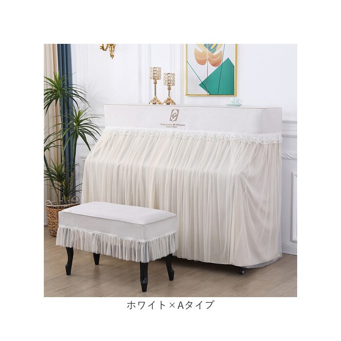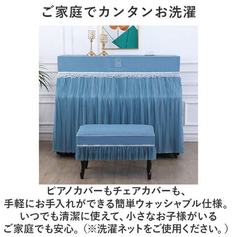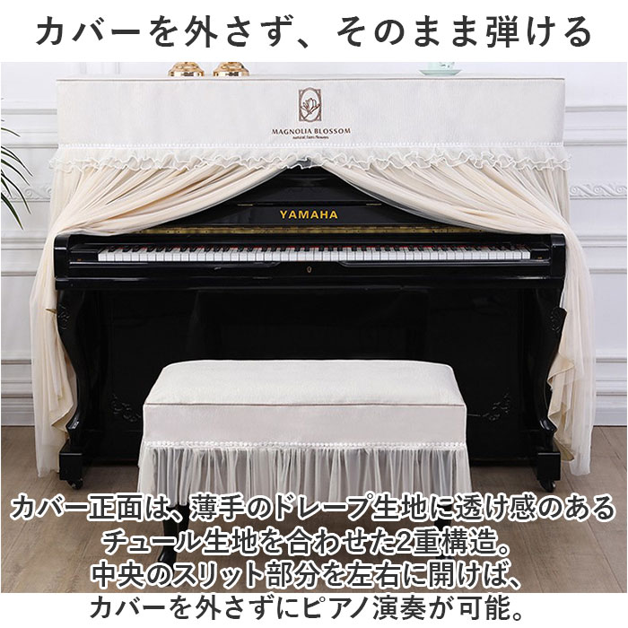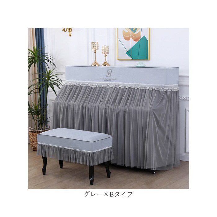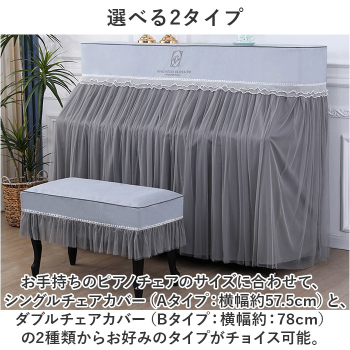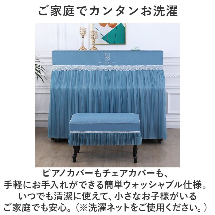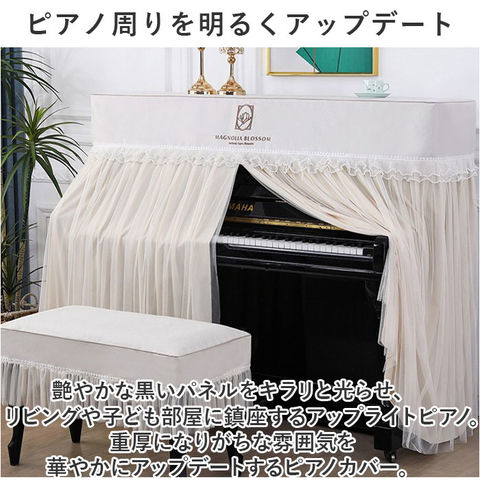 | 商品説明 | お部屋の片隅に佇むピアノを、エレガントな装いにパッと着せ替え!ふわっと被せるだけで装着カンタン「ピアノカバー&チェアカバー セット」が新登場。【ピアノ周りを明るくアップデート】艶やかな黒いパネルをキラリと光らせ、リビングや子ども部屋に鎮座するアップライトピアノ。重厚になりがちな雰囲気を華やかにアップデートするピアノカバー。【ホコリやキズからピアノを保護】鏡面のようなピアノのパネル表面に、柔らかな生地感のカバーをすっぽり足元まで被せることで、降り積もる小さなホコリや傷付きからピアノを優しく保護。【カバーを外さず、そのまま弾ける】カバー正面は、薄手のドレープ生地に透け感のあるチュール生地を合わせた2重構造。中央のスリット部分を左右に開けば、カバーを外さずにピアノ演奏が可能。【同じデザインのチェアカバー付き】ベンチタイプのピアノチェアにぴったり装着、ピアノカバーとトータルコーディネートができる、同じデザインのチェアカバーが付属。【選べる2タイプ】お手持ちのピアノチェアのサイズに合わせて、シングルチェアカバー(Aタイプ:横幅約57.5cm)と、ダブルチェアカバー(Bタイプ:横幅約:78cm)の2種類からお好みのタイプがチョイス可能。【ご家庭でカンタンお洗濯】ピアノカバーもチェアカバーも、手軽にお手入れができる簡単ウォッシャブル仕様。いつでも清潔に使えて、小さなお子様がいるご家庭でも安心。(※洗濯ネットをご使用ください。)【お部屋に馴染むシックなカラー】インテリアにすっきり調和する、柔らかく落ち着いた雰囲気のカラーバリエーション。気品を感じさせる「MAGNOLIA BLOSSOM」のロゴ刺繍とチュールを縁取るフェイクパールで、お部屋がグッと優雅な雰囲気に。 |