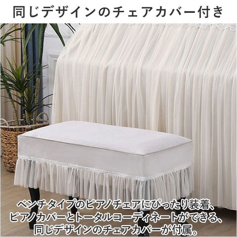 | サイズ | 【ピアノカバー(AB共通)】 [縦]約124cm/[横]約153cm/[奥行]約36cm 【チェアカバーAタイプ】 [縦(レース含む)]約24cm/[横]約57.5cm/[奥行]約36.5cm 【チェアカバーBタイプ】 [縦(レース含む)]約24cm/[横]約78cm/[奥行]約37cm ※サイズは当店計測の実寸サイズです。実際の商品ならびにメーカー表記サイズとは多少の誤差が生じる場合がございます。あらかじめご了承ください。 |