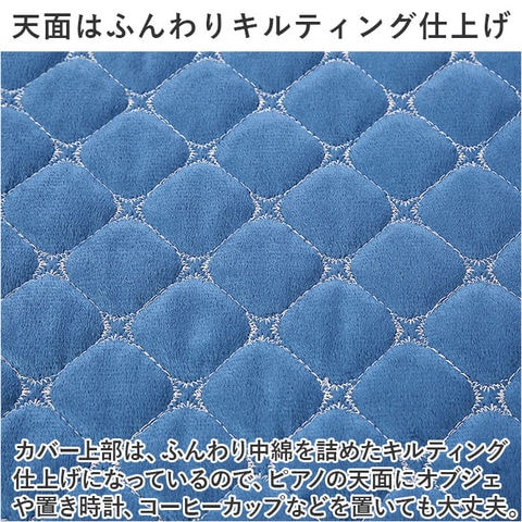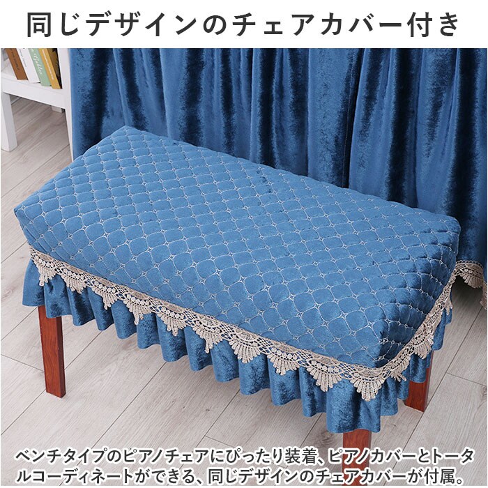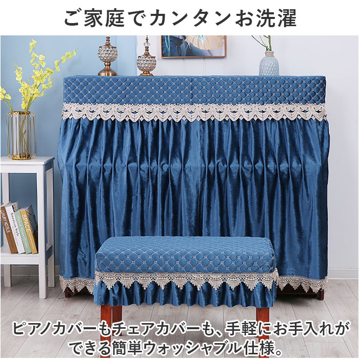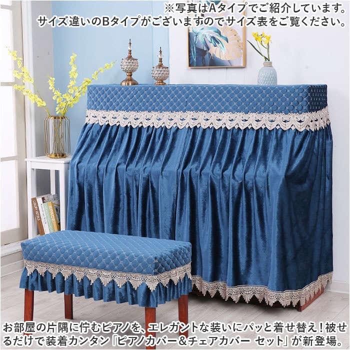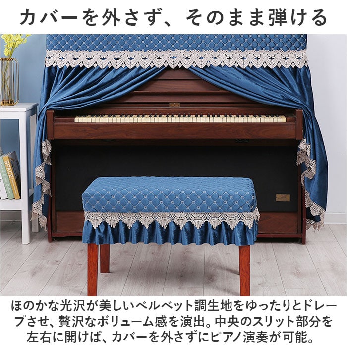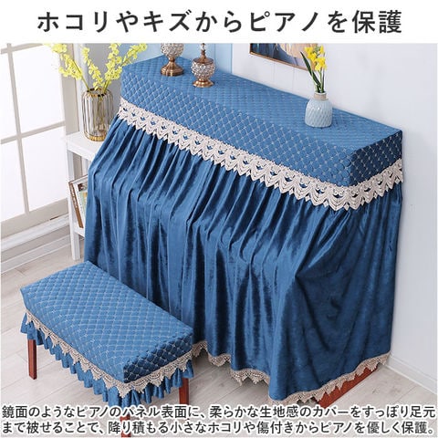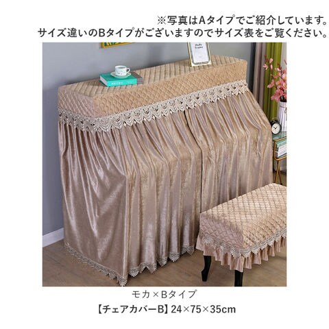 | 商品説明 | お部屋の片隅に佇むピアノを、エレガントな装いにパッと着せ替え!ふわっと被せるだけで装着カンタン「ピアノカバー&チェアカバー セット」が新登場。【ピアノ周りを明るくアップデート】艶やかな黒いパネルをキラリと光らせ、リビングや子ども部屋に鎮座するアップライトピアノ。重厚になりがちな雰囲気を華やかにアップデートするピアノカバー。【ホコリやキズからピアノを保護】鏡面のようなピアノのパネル表面に、柔らかな生地感のカバーをすっぽり足元まで被せることで、降り積もる小さなホコリや傷付きからピアノを優しく保護。【カバーを外さず、そのまま弾ける】ほのかな光沢が美しいベルベット調生地をゆったりとドレープさせ、贅沢なボリューム感を演出。中央のスリット部分を左右に開けば、カバーを外さずにピアノ演奏が可能。【天面はふんわりキルティング仕上げ】カバー上部は、ふんわり中綿を詰めたキルティング仕上げになっているので、ピアノの天面にオブジェや置き時計、コーヒーカップなどを置いても大丈夫。【同じデザインのチェアカバー付き】ベンチタイプのピアノチェアにぴったり装着、ピアノカバーとトータルコーディネートができる、同じデザインのチェアカバーが付属。【選べる2タイプ】お手持ちのピアノチェアのサイズに合わせて、シングルチェアカバー(Aタイプ:横幅約55cm)と、ダブルチェアカバー(Bタイプ:横幅約:75cm)の2種類からお好みのタイプがチョイス可能。【ご家庭でカンタンお洗濯】ピアノカバーもチェアカバーも、手軽にお手入れができる簡単ウォッシャブル仕様。いつでも清潔に使えて、小さなお子様がいるご家庭でも安心。(※洗濯ネットをご使用ください。)【リッチな風合いで気持ち華やぐ】ピアノルームをちょっぴり贅沢に彩る、上品で深みのあるカラーバリエーション。ゴールドブラウンの糸を繊細に編み込んだ、カバー裾のアンティーク風レースが艶やかなアクセント。 |