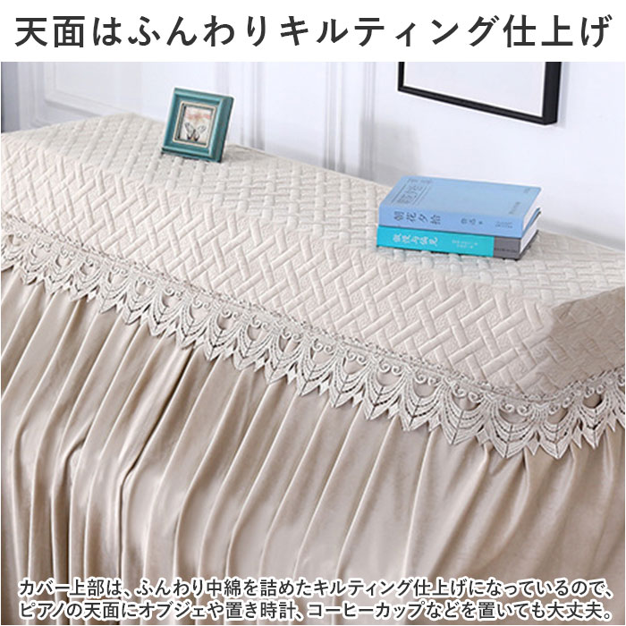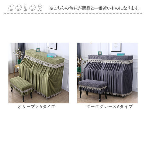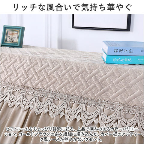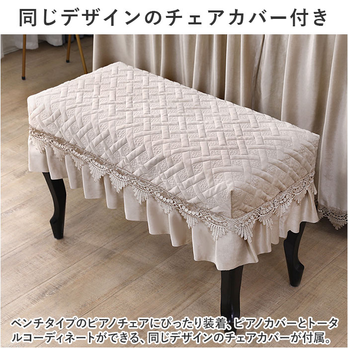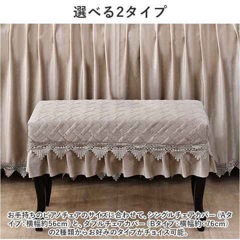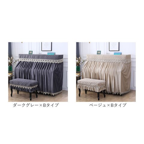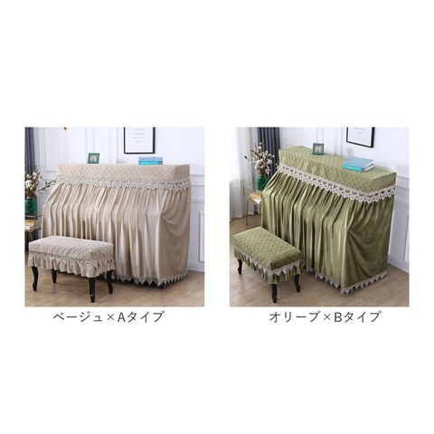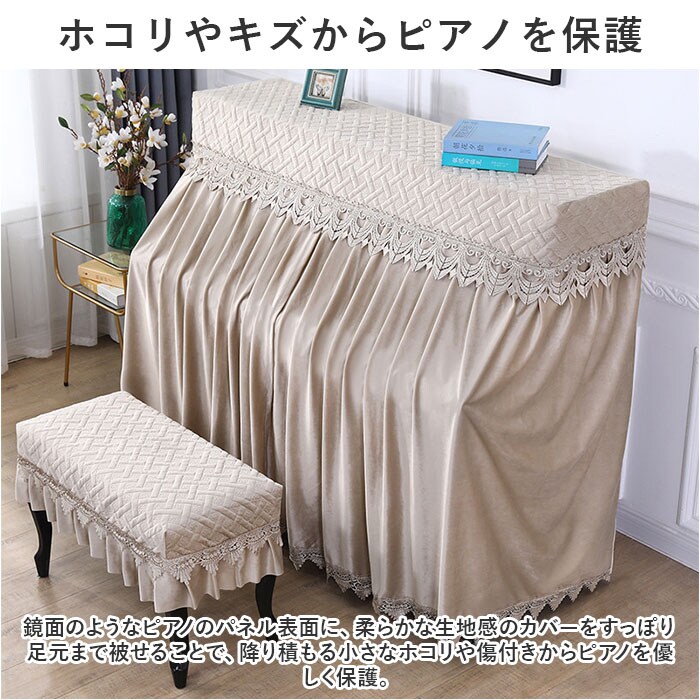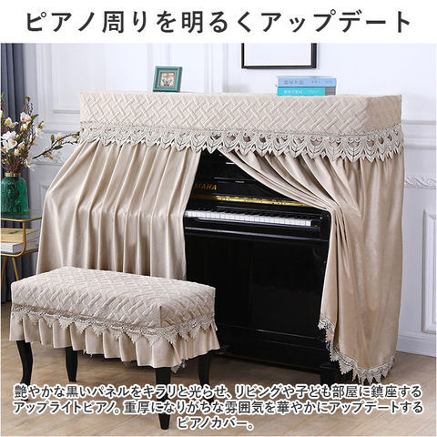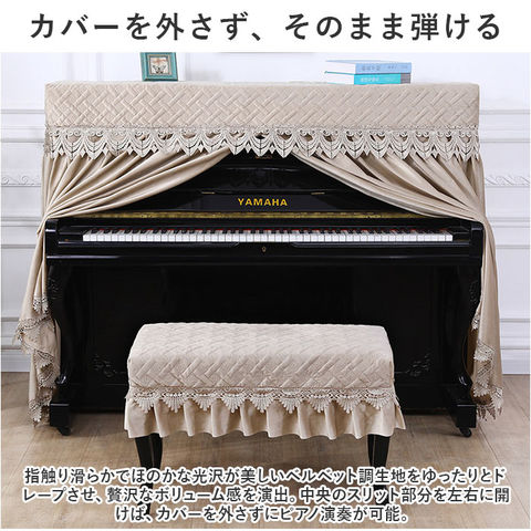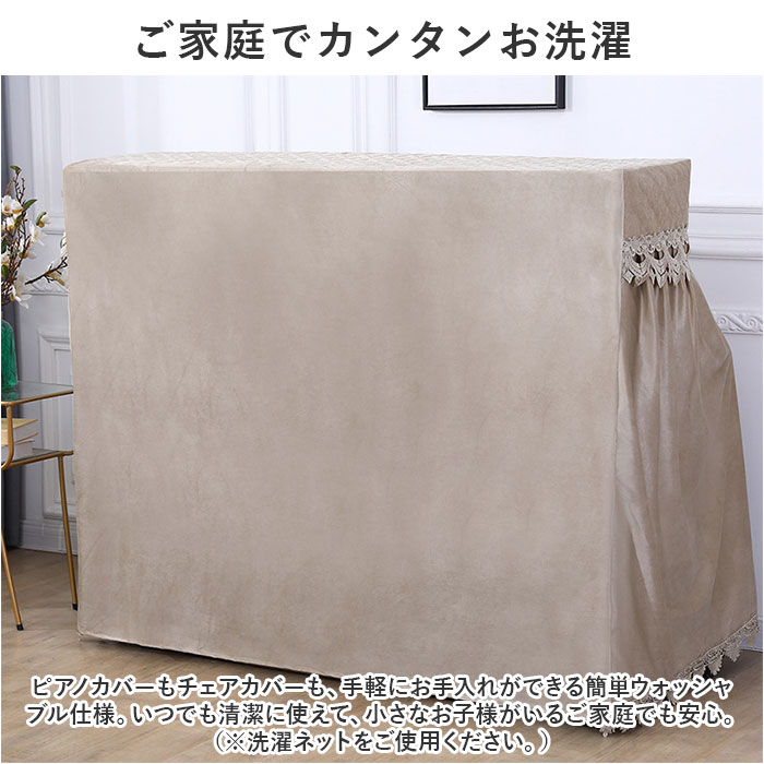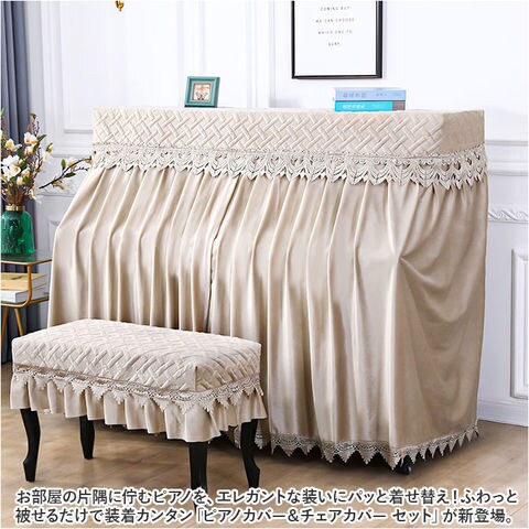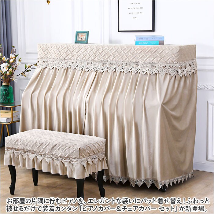 | 商品説明 | お部屋の片隅に佇むピアノを、エレガントな装いにパッと着せ替え!ふわっと被せるだけで装着カンタン「ピアノカバー&チェアカバー セット」が新登場。【ピアノ周りを明るくアップデート】艶やかな黒いパネルをキラリと光らせ、リビングや子ども部屋に鎮座するアップライトピアノ。重厚になりがちな雰囲気を華やかにアップデートするピアノカバー。【ホコリやキズからピアノを保護】鏡面のようなピアノのパネル表面に、柔らかな生地感のカバーをすっぽり足元まで被せることで、降り積もる小さなホコリや傷付きからピアノを優しく保護。【カバーを外さず、そのまま弾ける】指触り滑らかでほのかな光沢が美しいベルベット調生地をゆったりとドレープさせ、贅沢なボリューム感を演出。中央のスリット部分を左右に開けば、カバーを外さずにピアノ演奏が可能。【天面はふんわりキルティング仕上げ】カバー上部は、ふんわり中綿を詰めたキルティング仕上げになっているので、ピアノの天面にオブジェや置き時計、コーヒーカップなどを置いても大丈夫。【同じデザインのチェアカバー付き】ベンチタイプのピアノチェアにぴったり装着、ピアノカバーとトータルコーディネートができる、同じデザインのチェアカバーが付属。【選べる2タイプ】お手持ちのピアノチェアのサイズに合わせて、シングルチェアカバー(Aタイプ:横幅約56cm)と、ダブルチェアカバー(Bタイプ:横幅約:76cm)の2種類からお好みのタイプがチョイス可能。【ご家庭でカンタンお洗濯】ピアノカバーもチェアカバーも、手軽にお手入れができる簡単ウォッシャブル仕様。いつでも清潔に使えて、小さなお子様がいるご家庭でも安心。(※洗濯ネットをご使用ください。)【リッチな風合いで気持ち華やぐ】ピアノルームをちょっぴり贅沢に彩る、上品で深みのあるカラーバリエーション。ゴールドブラウンの糸を繊細に編み込んだ、カバー裾のアンティーク風レースが艶やかなアクセント。 |