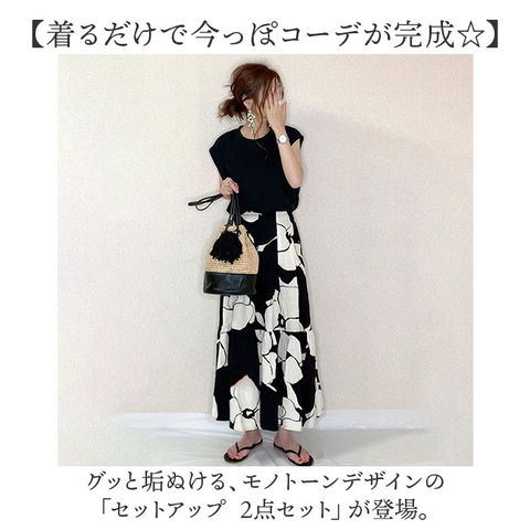 | 商品説明 | 【着るだけで今っぽコーデが完成☆】グッと垢ぬける、モノトーンデザインの「セットアップ 2点セット」が登場。【もうコーデに悩まない◎】毎日のコーデにお悩みの方へ!着るだけで垢ぬけコーデに仕上がる、嬉しいセットアップ服。【大人リラクシーがお気に入り♪】カジュアルだけどちゃんと女性らしい、上品な雰囲気。頑張りすぎないおしゃれさがGOOD◎【ゆるっと風通しの良い着心地】二の腕をカバーする、ゆるっと広めの袖口がポイント。風を通すから涼しい着心地で快適に。【締め付けフリーのロングスカート】幅広ゴムのウエストだから、とにかくラクチン!大ぶりな花柄でコーデにアクセントをON♪【着回し力が自慢のアイテム】セットアップだけでなく、単品で着るのも◎シンプルだから合わせやすく、着回し力バツグン! |