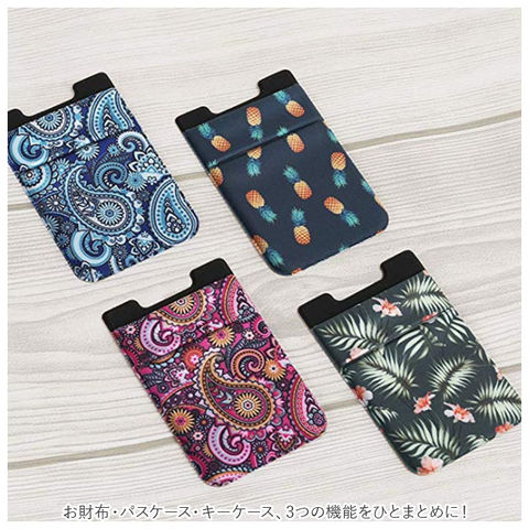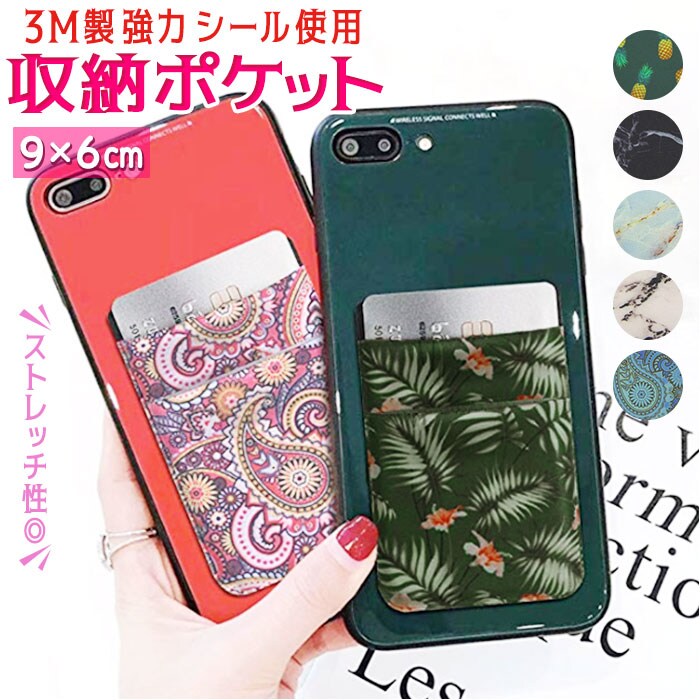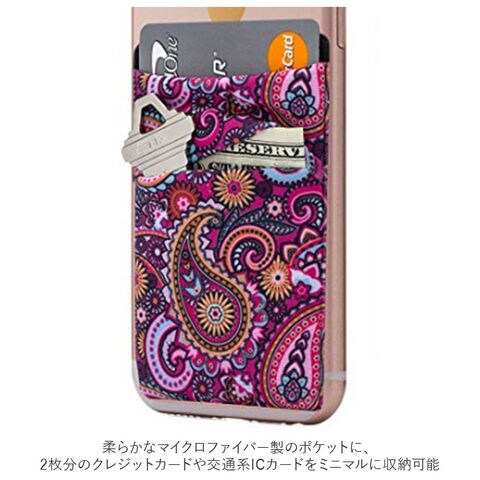 | 商品説明 | 貼るだけで簡単!スリムでかさばらない「スマートフォン用カード収納ポケット」が新登場。オシャレなプリントファブリックが目を惹く♪スマホ背面に貼り付けるタイプの簡単スマホポケット。柔らかなマイクロファイバー製のポケットに、2枚分のクレジットカードや交通系ICカードをミニマルに収納可能。カードポケット裏側の保護シールを剥がして、お使いのスマホケース背面に貼り付けるだけですぐに使えるのも嬉しいポイント。(※3M製の強力な粘着シールを使用しています。スマホケース表面に貼り付けてご使用ください。)ストレッチの効いた生地を使用しているので、カードの他にも折りたたんだ紙幣や鍵、束ねたイヤホンケーブルなどを収納してもOK!このポケットをスマホに貼りつけるだけで、キャッシュレス決済用のお財布、パスケースにキーケース、3つの機能をひとまとめに!大理石風プリントやペーズリー模様など、スタイリッシュでハイセンスなカラーバリエーションも魅力のひとつ。 |