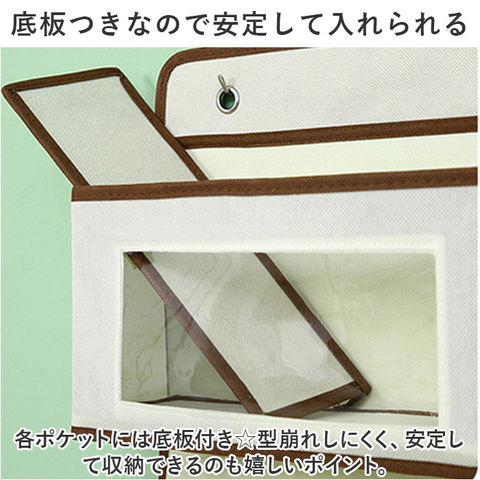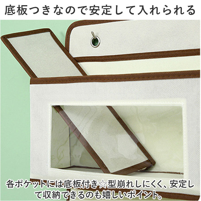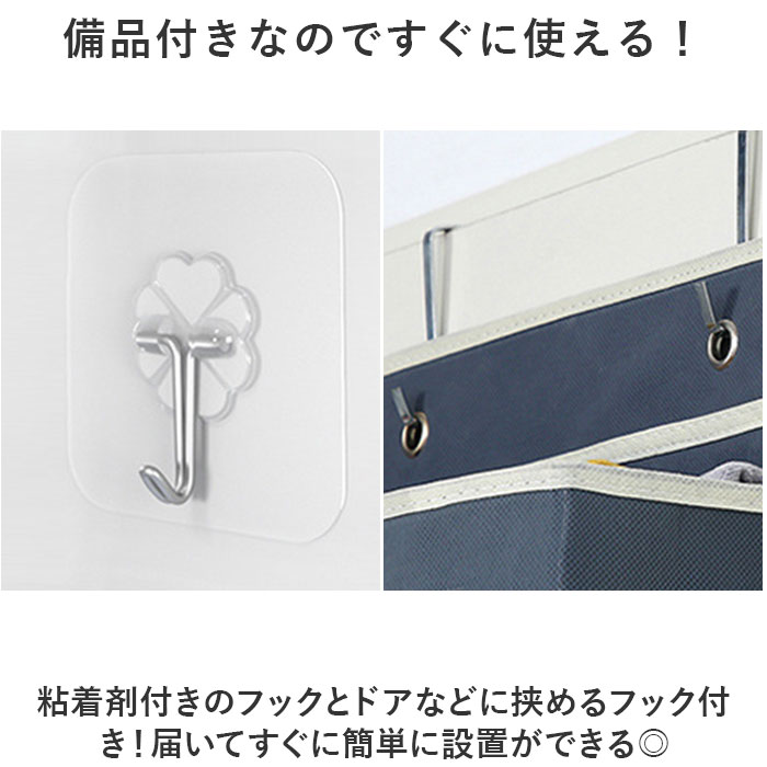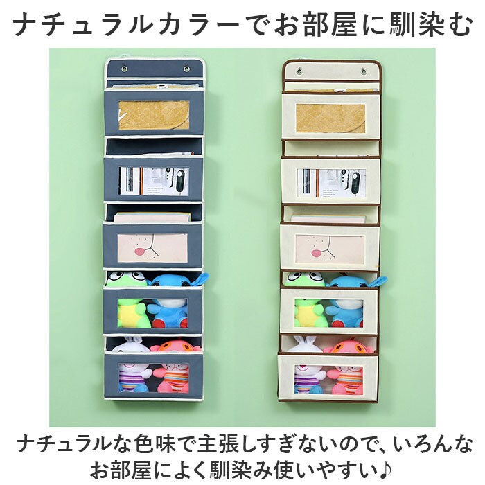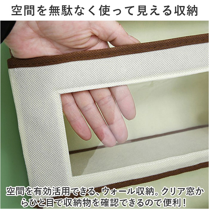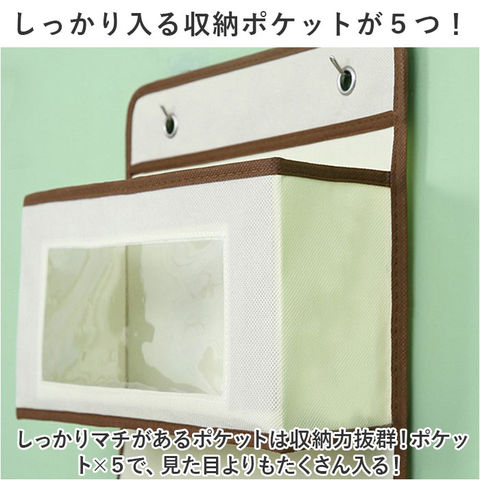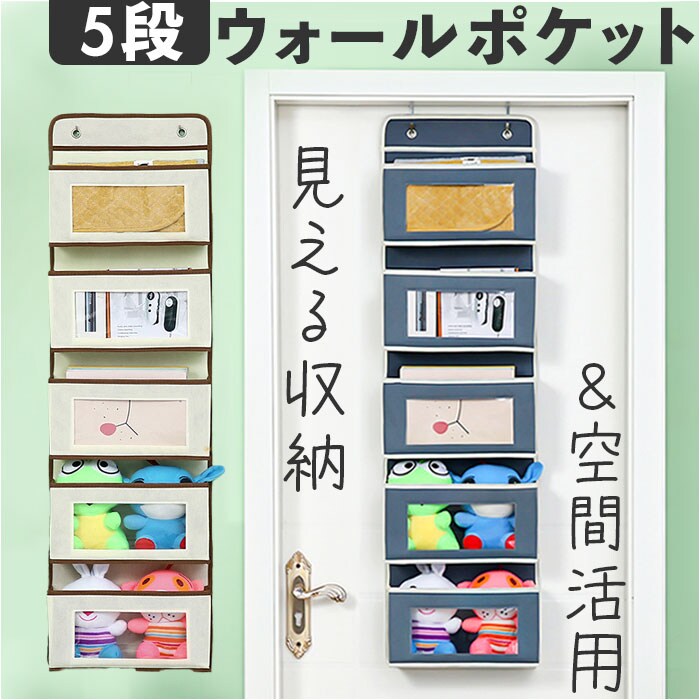 商品説明見える収納&空間活用ができる優れモノ!「ウォールポケット」が登場!【空間を無駄なく使って見える収納】空間を有効活用できる、ウォール収納。クリア窓からひと目で収納物を確認できるので便利!【しっかり入る収納ポケットが5つ!】しっかりマチがあるポケットは収納力抜群!ポケット×5で、見た目よりもたくさん入る!【底板つきなので安定して入れられる】各ポケットには底板付き☆型崩れしにくく、安定して収納できるのも嬉しいポイント。【備品付きなのですぐに使える!】粘着剤付きのフックとドアなどに挟めるフック付き!届いてすぐに簡単に設置ができる◎【使わない時はコンパクトにしまえる】使わない時は折りたたむことができるので、場所を取らずにコンパクトにしまうことができる!【ナチュラルカラーでお部屋に馴染む】ナチュラルな色味で主張しすぎないので、いろんなお部屋によく馴染み使いやすい♪