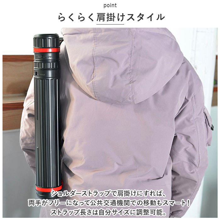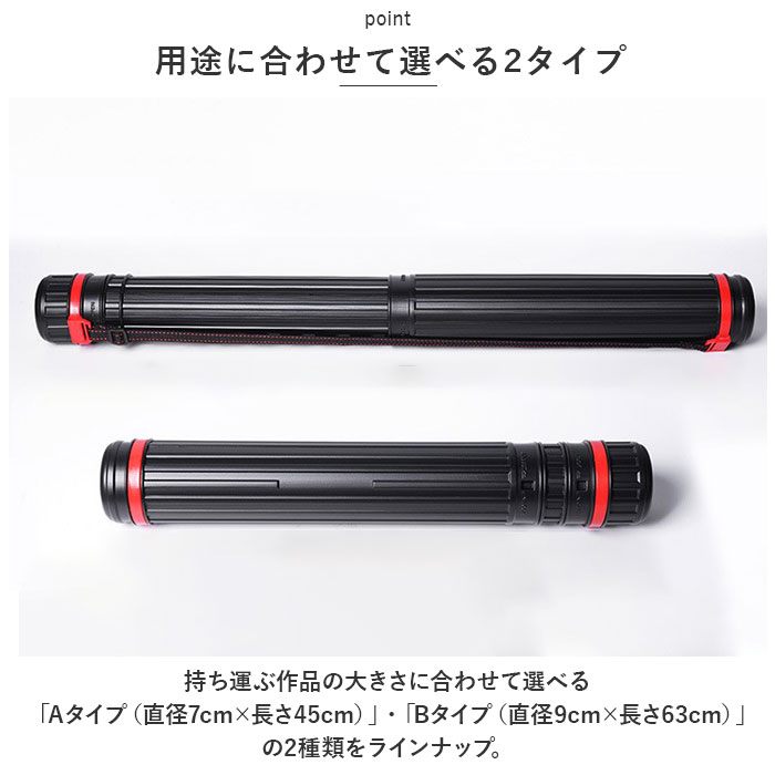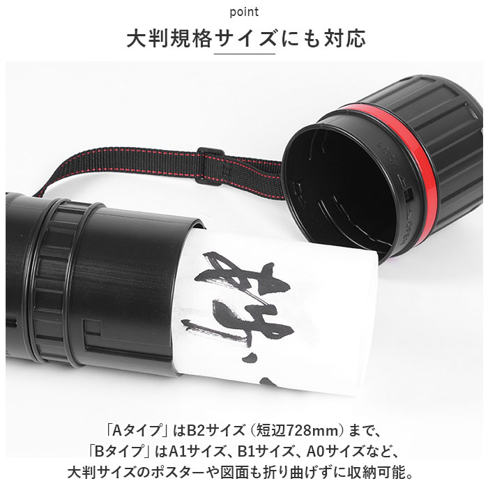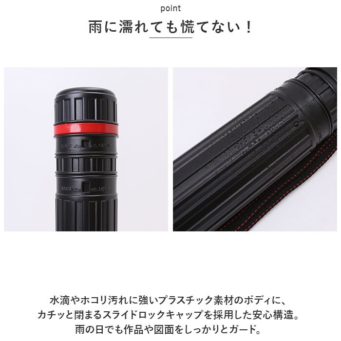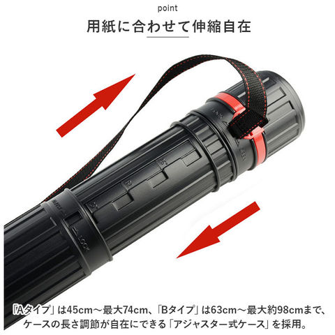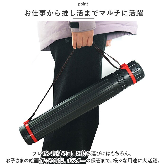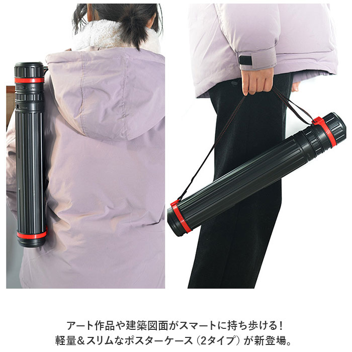 | 商品説明 | アート作品や建築図面がスマートに持ち歩ける!軽量&スリムなポスターケース(2タイプ)が新登場。【用途に合わせて選べる2タイプ】持ち運ぶ作品の大きさに合わせて選べる「Aタイプ(直径7cm×長さ45cm)」・「Bタイプ(直径9cm×長さ63cm)」の2種類をラインナップ。【用紙に合わせて伸縮自在】・「Aタイプ」は45cm~最大74cm、「Bタイプ」は63cm~最大約98cmまで、ケースの長さ調節が自在にできる「アジャスター式ケース」を採用。【大判規格サイズにも対応】・「Aタイプ」はB2サイズ(短辺728mm)まで、「Bタイプ」はA1サイズ、B1サイズ、A0サイズなど、大判サイズのポスターや図面も折り曲げずに収納可能。【雨に濡れても慌てない!】水滴やホコリ汚れに強いプラスチック素材のボディに、カチッと閉まるスライドロックキャップを採用した安心構造。雨の日でも作品や図面をしっかりとガード。【キャップ+本体一体構造】キャップはショルダーストラップで筒状のケース本体と一体となっているので、キャップが紛失する心配ナシ!【らくらく肩掛けスタイル】ショルダーストラップで肩掛けにすれば、両手がフリーになって公共交通機関での移動もスマート!ストラップ長さは自分サイズに調整可能。【お仕事から推し活までマルチに活躍】プレゼン資料や図面の持ち運びにはもちろん、お子さまの絵画作品や賞状、推しアイドルのポスターの保管まで、様々な用途に大活躍。 |