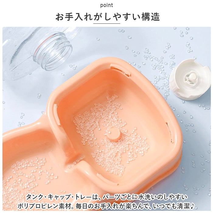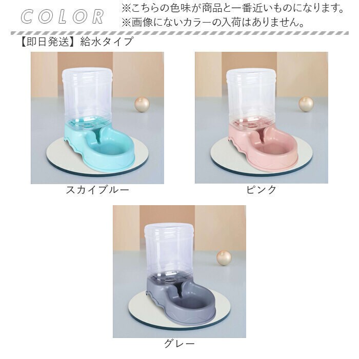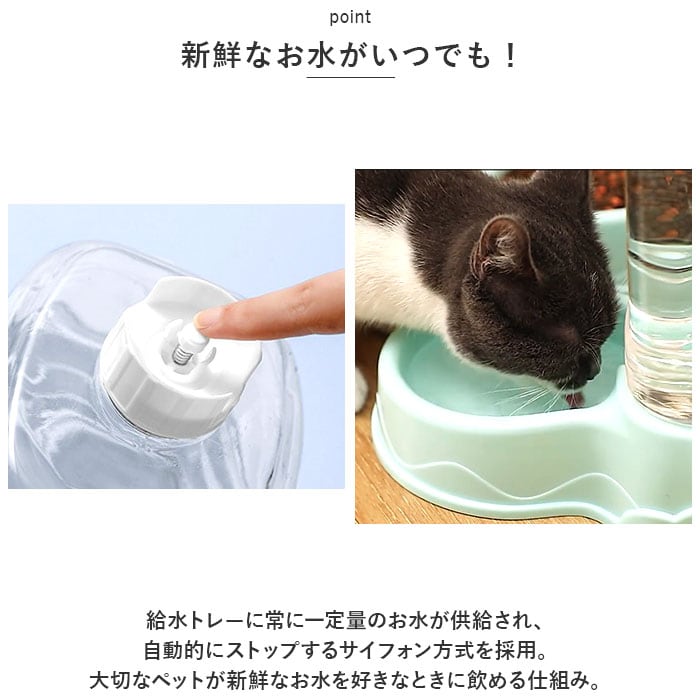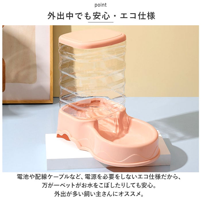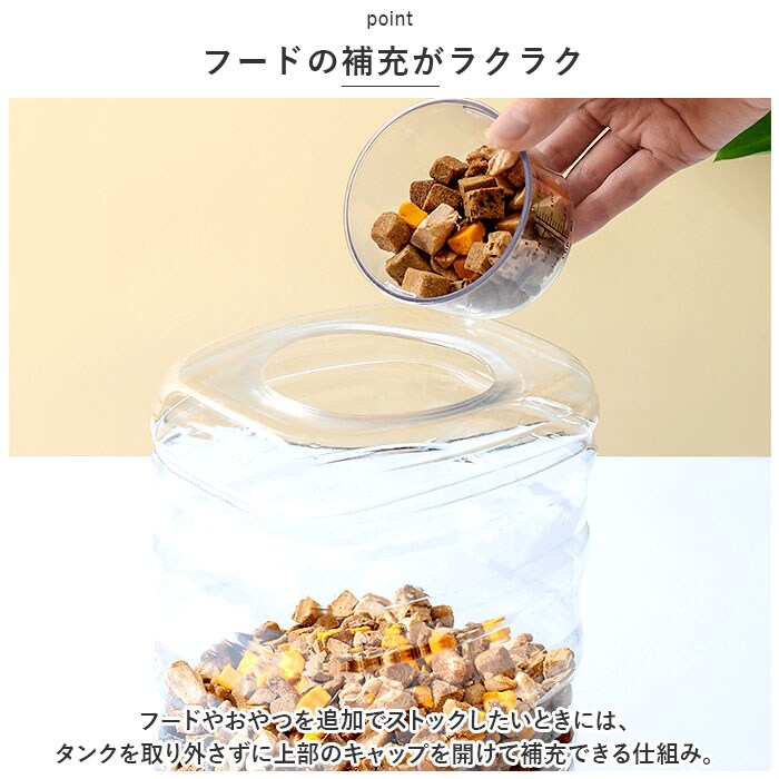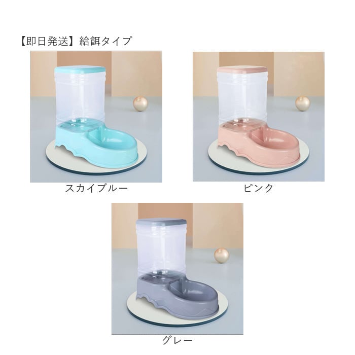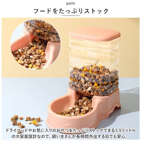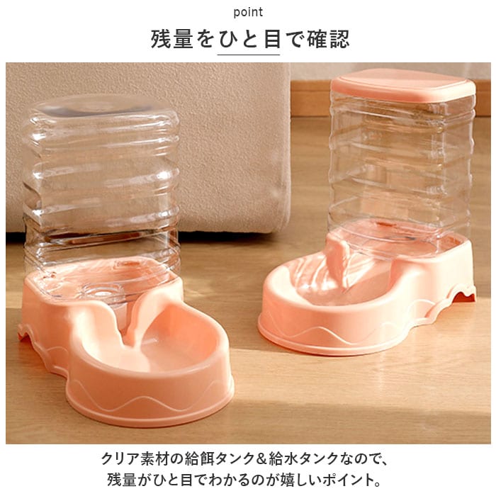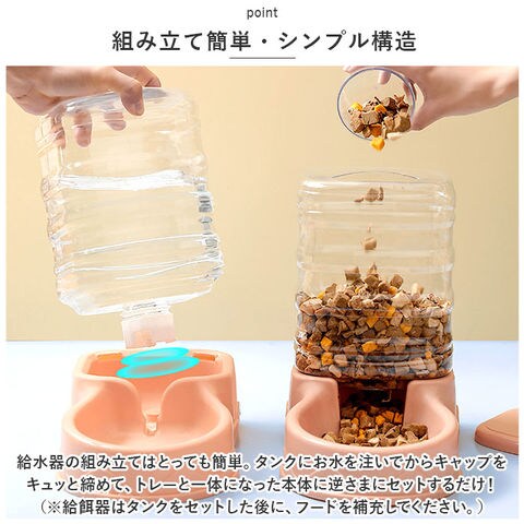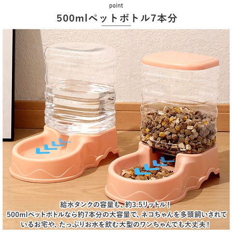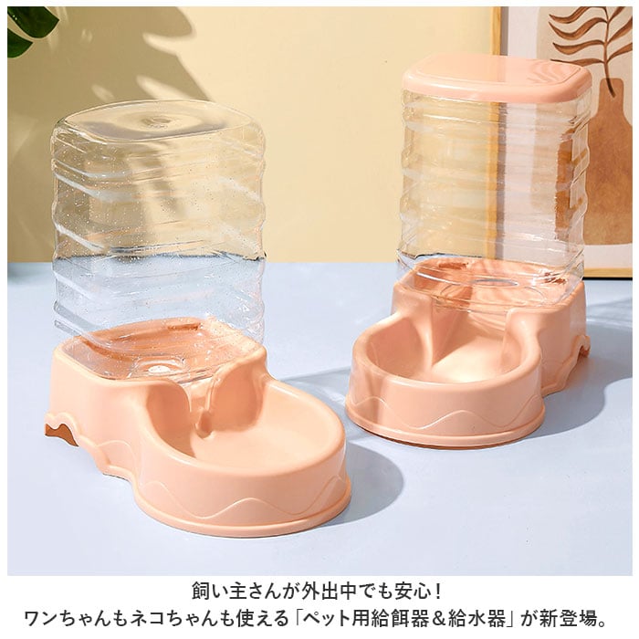 | 商品説明 | 飼い主さんが外出中でも安心!ワンちゃんもネコちゃんも使える「ペット用給餌器&給水器」が新登場。『ペット用給餌器』【フードをたっぷりストック】ドライフードやお気に入りのおやつをたっぷりストックできる3.5リットルの大容量設計なので、飼い主さんが長時間外出する日でも安心。【フードの補充がラクラク】フードやおやつを追加でストックしたいときには、タンクを取り外さずに上部のキャップを開けて補充できる仕組み。『ペット用給水器』【500mlペットボトル7本分】給水タンクの容量も、約3.5リットル!500mlペットボトルなら約7本分の大容量で、ネコちゃんを多頭飼いされているお宅や、たっぷりお水を飲む大型のワンちゃんでも大丈夫!【新鮮なお水がいつでも!】給水トレーに常に一定量のお水が供給され、自動的にストップするサイフォン方式を採用。大切なペットが新鮮なお水を好きなときに飲める仕組み。【組み立て簡単・シンプル構造】給水器の組み立てはとっても簡単。タンクにお水を注いでからキャップをキュッと締めて、トレーと一体になった本体に逆さまにセットするだけ!(※給餌器はあらかじめタンクをセットした後に、フードを補充してください。)【残量をひと目で確認】クリア素材の給餌タンク&給水タンクなので、残量がひと目でわかるのが嬉しいポイント。【お手入れがしやすい構造】タンク・キャップ・トレーは、パーツごとに水洗いのしやすいポリプロピレン素材。毎日のお手入れが楽ちんで、いつでも清潔♪【外出中でも安心・エコ仕様】電池や配線ケーブルなど、電源を必要をしないエコ仕様だから、万が一ペットがお水をこぼしたりしても安心。外出が多い飼い主さんにオススメ。【イヌ・ネコ共用タイプ】ワンちゃん・ネコちゃんをはじめ、フェレットやチンチラのような小動物にも使えて便利!(※給餌器、給水器別々の販売です。セット品販売ではございませんので、ご注意ください。) |