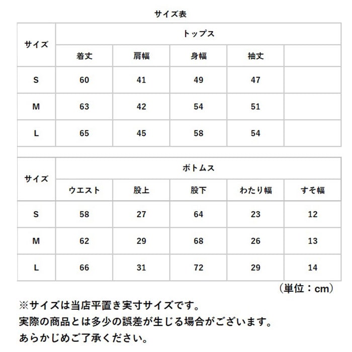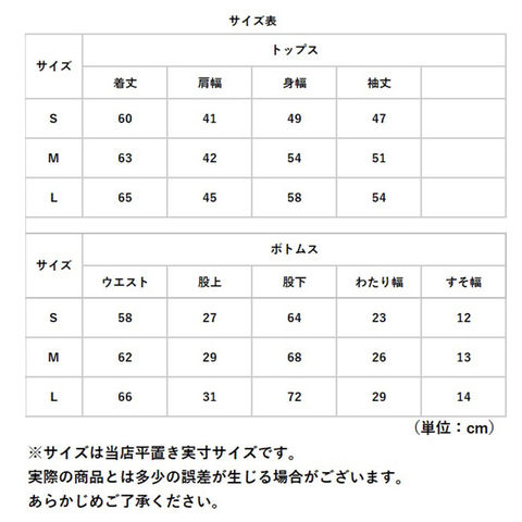| 重量 | 【トップス】約186g 【ボトムス】約148g (※Mサイズの商品の重量です。) |