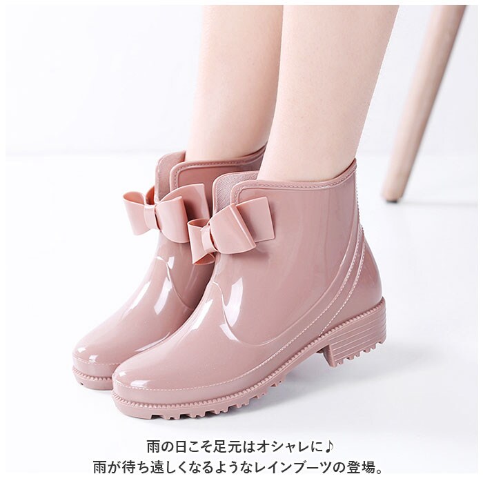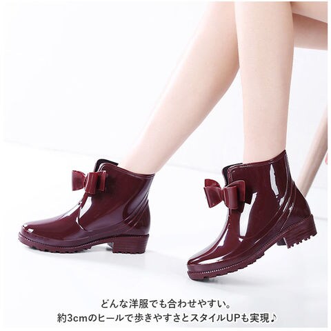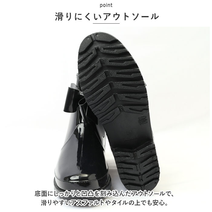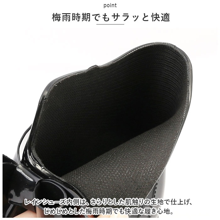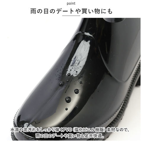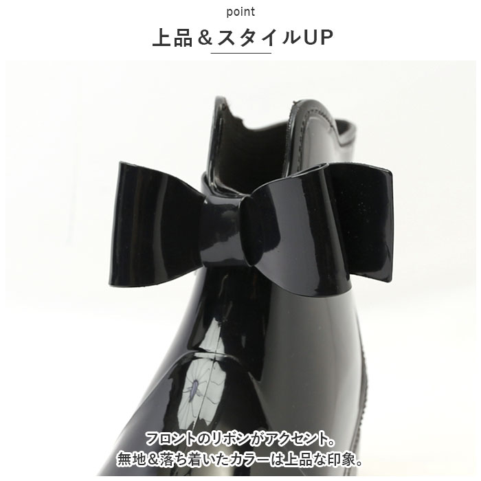 | 商品説明 | 雨の日こそ足元はオシャレに♪雨が待ち遠しくなるようなレインブーツの登場。【上品&スタイルUP】フロントのリボンがアクセント。無地&落ち着いたカラーは上品な印象。どんな洋服でも合わせやすい。約3cmのヒールで歩きやすさとスタイルUPも実現♪【雨の日のデートや買い物にも】水滴や泥汚れをしっかり弾くPVC(塩化ビニル樹脂)素材なので、雨の日のデートや買い物も足元快適。【滑りにくいアウトソール】底面にしっかりと凹凸を刻み込んだアウトソールで、滑りやすいアスファルトやタイルの上でも安心。【梅雨時期でもサラッと快適】レインシューズ内側は、さらりとした肌触りの生地で仕上げ、じめじめとした梅雨時期でも快適な履き心地。【雨の日が待ち遠しくなる!】上品なカラートーンでフォーマルシーンでも活躍。好きなカラーで憂鬱な雨の日もハッピーに! |