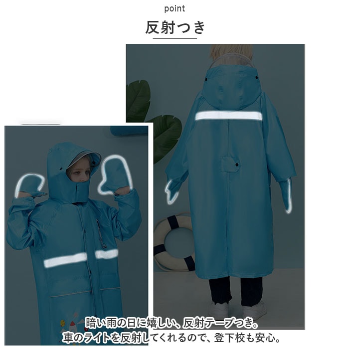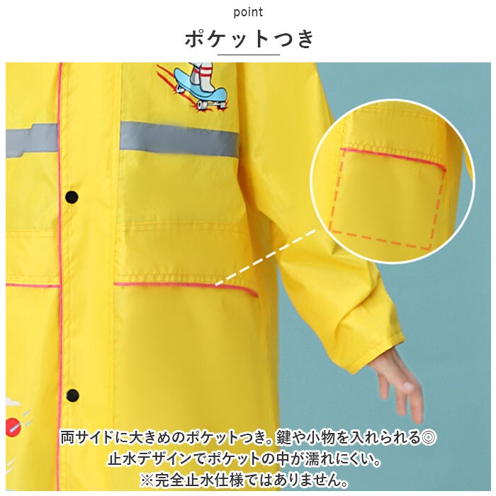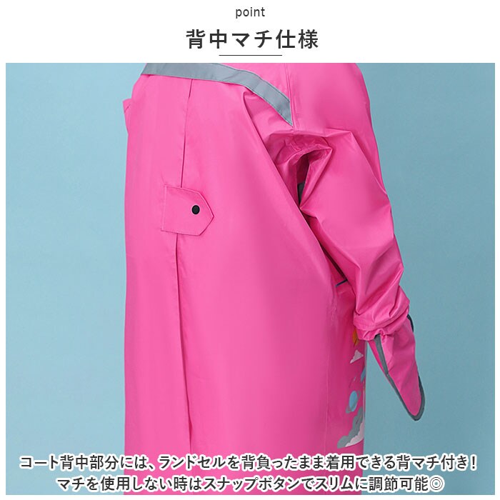 | 商品説明 | ランドセルの上から羽織れる◎収納袋とクリアバイザーつきの、レインコートが登場。【背中マチ仕様】コート背中部分には、ランドセルを背負ったまま着用できる背マチ付き!マチを使用しない時はスナップボタンでスリムに調節可能◎【収納袋つき】レインコートをたたんで収納できる専用の収納袋つき!濡れたレインコートを収納したり、通学などの持ち運びに便利。【クリアバイザー】クリアバイザー2枚つき!スナップボタンで簡単装着できるので、雨の強さ合わせて1枚~2枚に調節可能。視界を遮らないクリア仕様なのも嬉しいポイント。【撥水加工】水をはじきやすい撥水加工を施した生地。雨のしずくからお子さまの身体をしっかりガード!※完全防水仕様ではありません。【袖口ゴム仕様】めくれ上がりと水の侵入を防ぐ、ゴム仕様の袖口。手首でキチンととまるので動きやすさも◎ミトンつき!【しっかりファスナー】フロント部分はファスナーとスナップボタンのダブル仕様で、濡れにくい◎しっかりした作りで安心。【フードアジャスター】後頭部には面ファスナーのフードアジャスターを採用。 フードの長さを調節することで視界を確保◎【反射つき】暗い雨の日に嬉しい、反射テープつき。車のライトを反射してくれるので、登下校も安心。【ポケットつき】両サイドに大きめのポケットつき。鍵や小物を入れられる◎止水デザインでポケットの中が濡れにくい。※完全止水仕様ではありません。【男女兼用】可愛いイラスト入り&性別を問わないカラー。男女兼用で使える! |