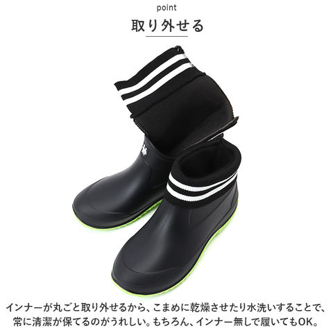 | 商品説明 | いつも清潔で快適。インナーが丸ごと取り外せる「レディースレインブーツ 取り外しできるインナー付き」の登場。【取り外せる】インナーが丸ごと取り外せるから、こまめに乾燥させたり水洗いすることで、常に清潔が保てるのがうれしい。もちろん、インナー無しで履いてもOK。【まるでソール付きの靴下】ショート丈のレインブーツから、インナーのストライプ柄が見えてまるでソール付きの靴下。【水や汚れに強い】水や汚れに強いPVC素材を採用。雨の日も雪の日も足元を気にすることなく安心して履ける。【履き心地も快適♪】屈曲性に優れた柔らかな素材なので、履き心地も快適♪【脱ぎ履きがスムーズ】スポンと履けるショート丈タイプ。履き口は柔らかく、脱ぎ履きがスムーズにできるプルストラップ付き。【滑りにくい】靴底には特殊形状の溝があり、濡れた場所でも滑りにくい。【雨の日も気分をUP】フロントのロゴとミッドソールのカラーがさりげないアクセントに。コーデのポイントになるカラーが憂鬱な雨の日の気分をUP!【ガーデニングやアウトドアにも】雨の日のお出かけ用に。ガーデニングやアウトドアにも大活躍。 |