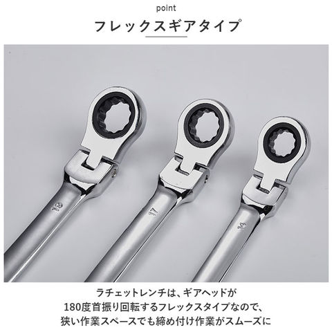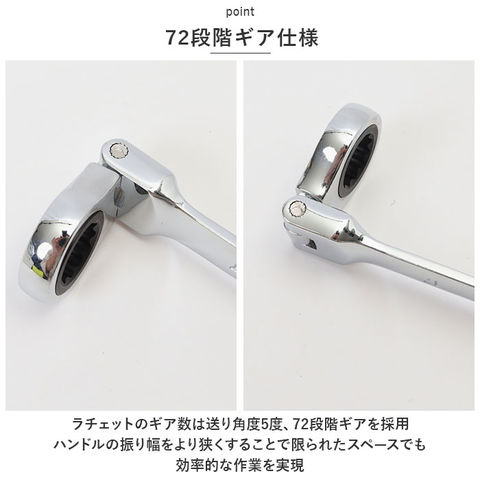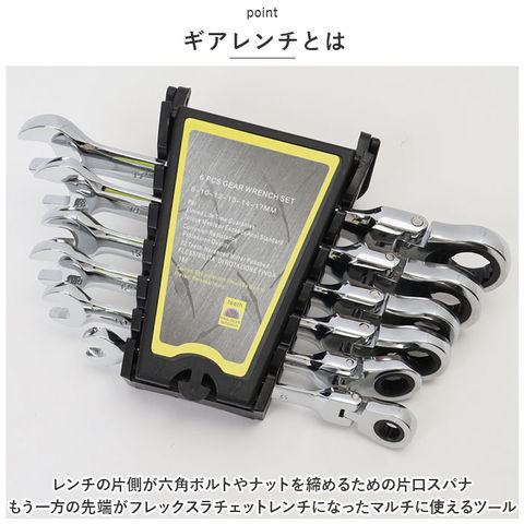 | 商品説明 | 自動車やバイクの修理や、電気設備や配管のメンテナンスに!「ギアレンチ・6ピースセット」が新登場。【ギアレンチとは】レンチの片側が六角ボルトやナットを締めるための片口スパナ。もう一方の先端がフレックスラチェットレンチになったマルチに使えるツール。【各種ボルトサイズに対応】・「8mm」・「10mm」・「12mm」・「13mm」・「14mm」・「17mm」の6種類のボルトサイズに対応。各種作業で頻繁に使用するサイズを取り揃えた6ピースセット。【フレックスギアタイプ】ラチェットレンチは、ギアヘッドが180度首振り回転するフレックスタイプなので、狭い作業スペースでも締め付け作業がスムーズに。【72段階ギア仕様】ラチェットのギア数は送り角度5度、72段階ギアを採用。ハンドルの振り幅をより狭くすることで限られたスペースでも効率的な作業を実現。【丈夫で錆びにくい合金素材】レンチ本体素材は、丈夫かつ軽量なクロムバナジウム鋼合金素材製。鏡面のような光沢のある表面にはサビにくく耐久性の高いニッケルクロムメッキ加工済み。【持ち運びラクラク】作業場所まで軽いフットワークで持ち運びができる、6本全てのレンチをコンパクトに収納できるハンドル付き専用ホルダーが付属。【DIYから現場まで幅広く活躍】自動車やバイクのメンテナンスや、自宅でのDIY作業はもちろん、現場の職人さんでもすぐに活用できるプロ仕様。 |