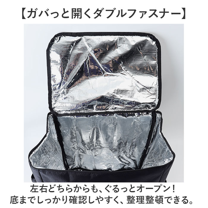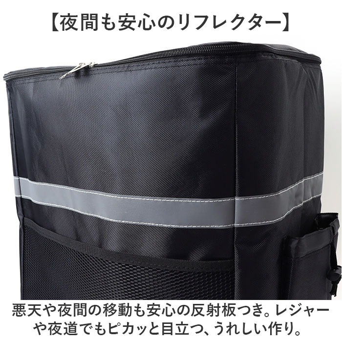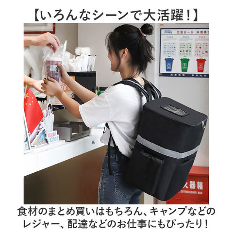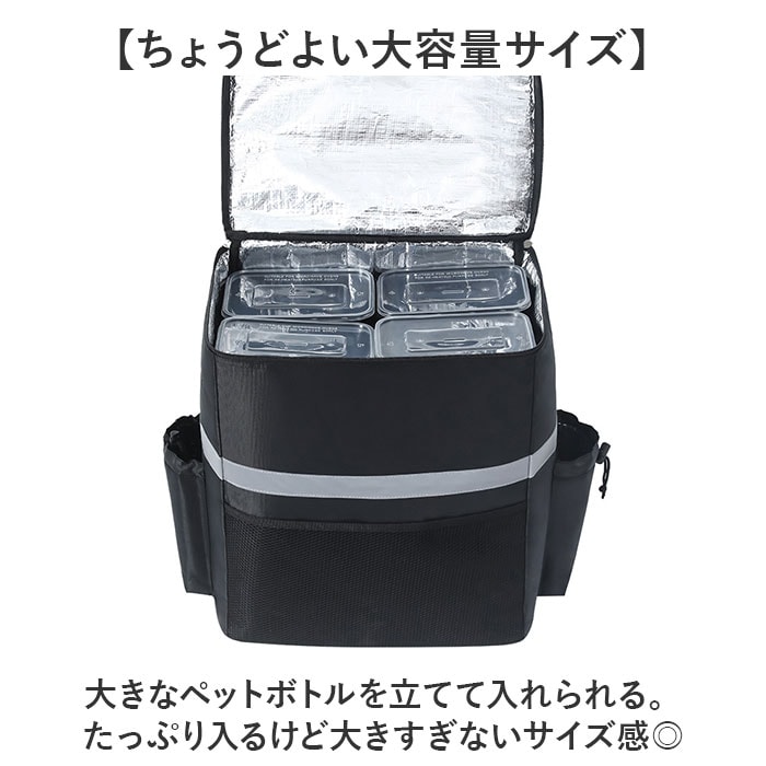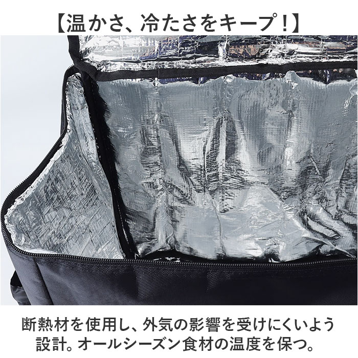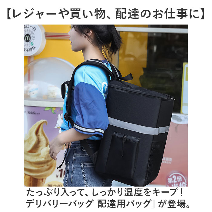 | 商品説明 | 【レジャーや買い物、配達のお仕事に】たっぷり入って、しっかり温度をキープ!「デリバリーバッグ 配達用バッグ」が登場。【温かさ、冷たさをキープ!】断熱材を使用し、外気の影響を受けにくいよう設計。オールシーズン食材の温度を保つ。【雨にも負けない撥水生地】水滴をはじく、撥水生地を採用。突然の雨でも慌てなくてOK!※完全防水ではありません。【ガバっと開くダブルファスナー】左右どちらからも、ぐるっとオープン!底までしっかり確認しやすく、整理整頓できる。【ちょうどよい大容量サイズ】大きなペットボトルを立てて入れられる。たっぷり入るけど大きすぎないサイズ感◎【夜間も安心のリフレクター】悪天や夜間の移動も安心の反射板つき。レジャーや夜道でもピカッと目立つ、うれしい作り。【ポケット充実で使いやすい】外側のファスナーポケットとサイドポケットで、小物の収納もラクラク。ミニ栓抜きを搭載!【持ち歩きも快適に】背面と肩ストラップに、メッシュ素材とクッションをIN。長時間の持ち歩きの負担を軽減する。【いろんなシーンで大活躍!】食材のまとめ買いはもちろん、キャンプなどのレジャー、配達などのお仕事にもぴったり!【ポケット仕様】前面:オープンポケット×1サイド:オープンポケット×2(アジャスターつき)フタ部分:クリアポケット×1 |