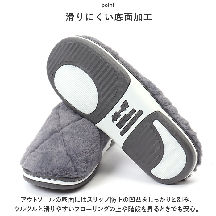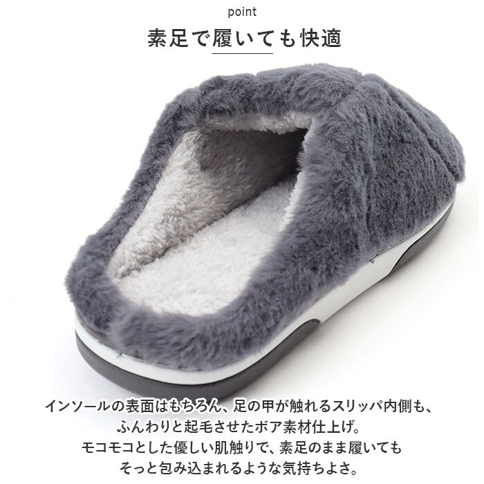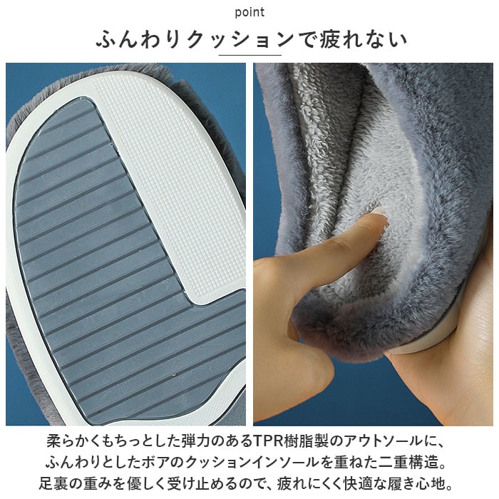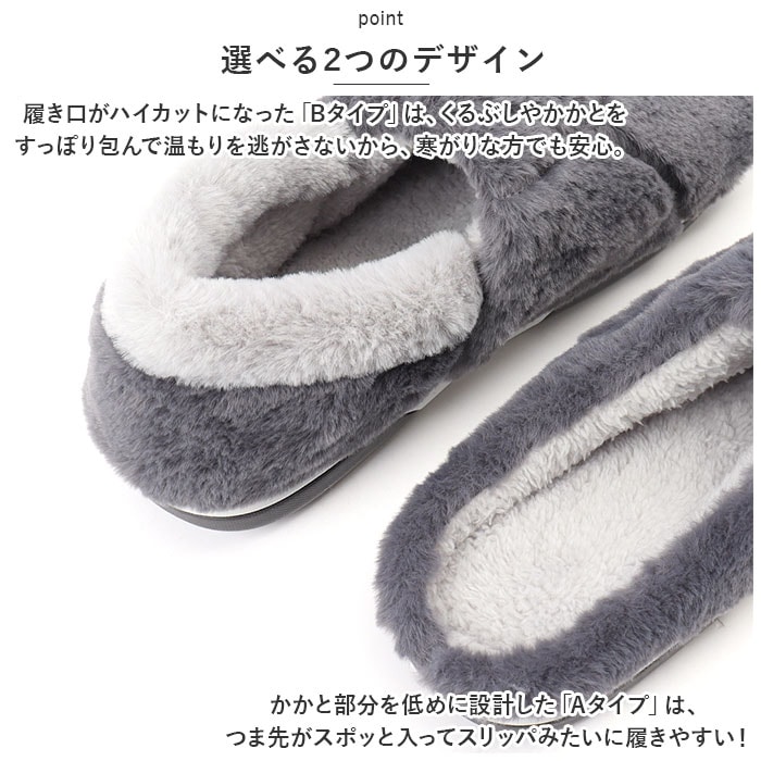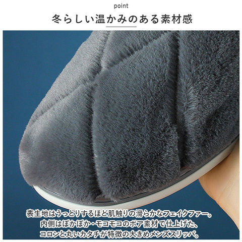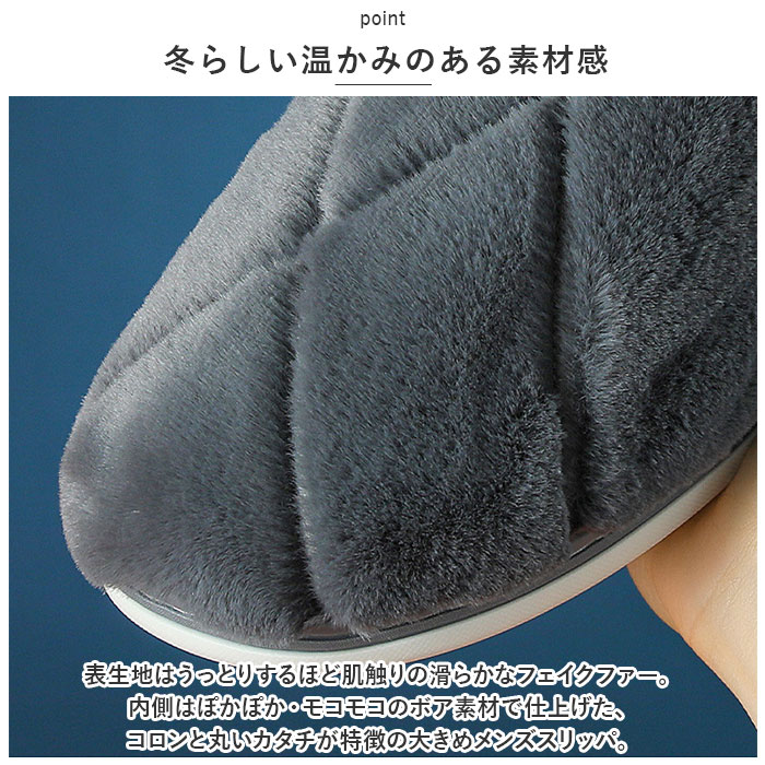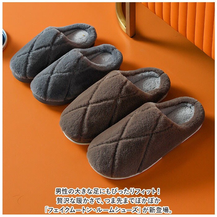 | 商品説明 | 男性の大きな足にもぴったりフィット!贅沢な暖かさで、つま先までぽかぽか「フェイクムートン・ルームシューズ」が新登場。【冬らしい温かみのある素材感】表生地はうっとりするほど肌触りの滑らかなフェイクファー。内側はぽかぽか・モコモコのボア素材で仕上げた、コロンと丸いカタチが特徴の大きめメンズスリッパ。【ふんわりクッションで疲れない】柔らかくもちっとした弾力のあるTPR樹脂製のアウトソールに、ふんわりとしたボアのクッションインソールを重ねた二重構造。足裏の重みを優しく受け止めるので、疲れにくく快適な履き心地。【素足で履いても快適】インソールの表面はもちろん、足の甲が触れるスリッパ内側も、ふんわりと起毛させたボア素材仕上げ。モコモコとした優しい肌触りで、素足のまま履いてもそっと包み込まれるような気持ちよさ。【選べる2つのデザイン】かかと部分を低めに設計した「Aタイプ」は、つま先がスポッと入ってスリッパみたいに履きやすい!履き口がハイカットになった「Bタイプ」は、くるぶしやかかとをすっぽり包んで温もりを逃がさないから、寒がりな方でも安心。【滑りにくい底面加工】アウトソールの底面にはスリップ防止の凹凸をしっかりと刻み、ツルツルと滑りやすいフローリングの上や階段を昇るときでも安心。【ゆったり履けるメンズサイズ】学校や部活で忙しいティーンのボーイズから、休日はリラックスして過ごしたいパパさんまでゆったりと履ける♪身体の大きな男性でもぴったりサイズが見つかる「26cm~31cm」までのビッグサイズをラインナップ。【冬のおうち時間の必須アイテム】シックな色合いとラグジュアリー感のあるフェイクムートンの素材感が、セーターやニットなど秋冬の装いにベストフィット!滑らかな肌触りとぽかぽかの暖かさで、快適なおうち時間を♪ |