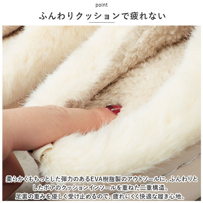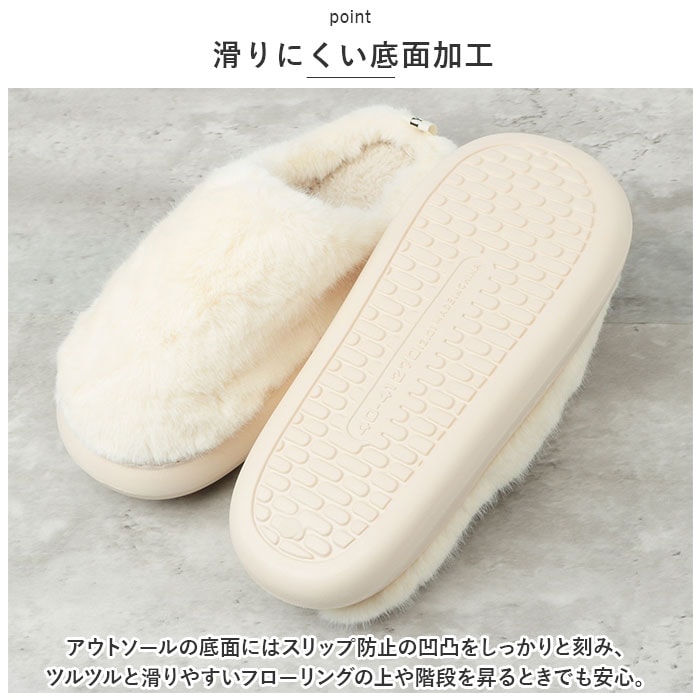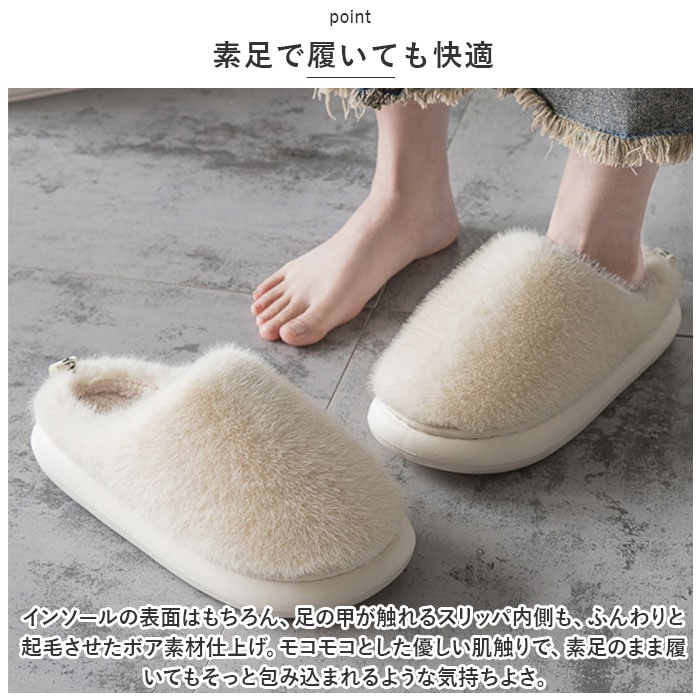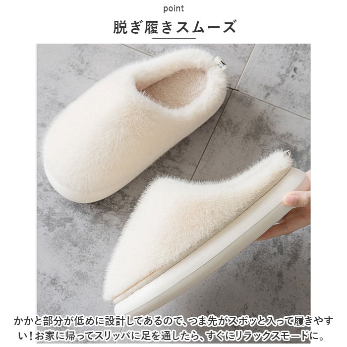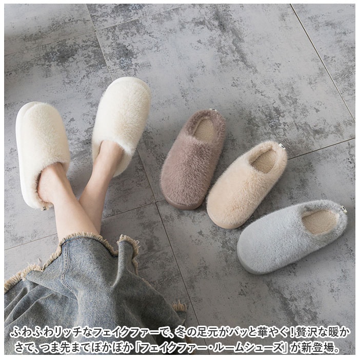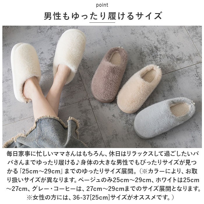 | 商品説明 | ふわふわリッチなフェイクファーで、冬の足元がパッと華やぐ!贅沢な暖かさで、つま先までぽかぽか「フェイクファー・ルームシューズ」が新登場。【冬らしい温かみのある素材感】表生地はうっとりするほど肌触りの滑らかなフェイクファー。内側はぽかぽか・モコモコのボア素材で仕上げた、コロンと丸いカタチが特徴の大きめファースリッパ。【ふんわりクッションで疲れない】柔らかくもちっとした弾力のあるEVA樹脂製のアウトソールに、ふんわりとしたボアのクッションインソールを重ねた二重構造。足裏の重みを優しく受け止めるので、疲れにくく快適な履き心地。【素足で履いても快適】インソールの表面はもちろん、足の甲が触れるスリッパ内側も、ふんわりと起毛させたボア素材仕上げ。モコモコとした優しい肌触りで、素足のまま履いてもそっと包み込まれるような気持ちよさ。【脱ぎ履きスムーズ】かかと部分が低めに設計してあるので、つま先がスポッと入って履きやすい!お家に帰ってスリッパに足を通したら、すぐにリラックスモードに。【滑りにくい底面加工】アウトソールの底面にはスリップ防止の凹凸をしっかりと刻み、ツルツルと滑りやすいフローリングの上や階段を昇るときでも安心。【男性もゆったり履けるサイズ】毎日家事に忙しいママさんはもちろん、休日はリラックスして過ごしたいパパさんまでゆったり履ける♪身体の大きな男性でもぴったりサイズが見つかる「25cm~29cm」までのゆったりサイズ展開。(※カラーにより、お取り扱いサイズが異なります。ベージュのみ25cm~29cm、ホワイトは25cm~27cm、グレー・コーヒーは、27cm~29cmまでのサイズ展開となります。※女性の方には、36-37[25cm]サイズがオススメです。)【冬のおうち時間の必須アイテム】くすみ感のある優しい色合いとラグジュアリー感のあるフェイクファーの素材感が、セーターやニットなど秋冬の装いにベストフィット!滑らかな肌触りとぽかぽかの暖かさで、快適なおうち時間を♪ |