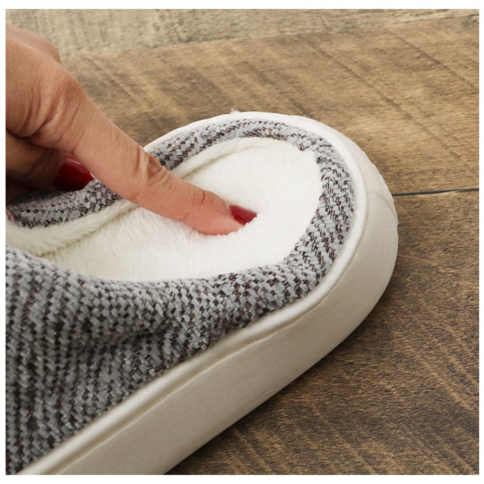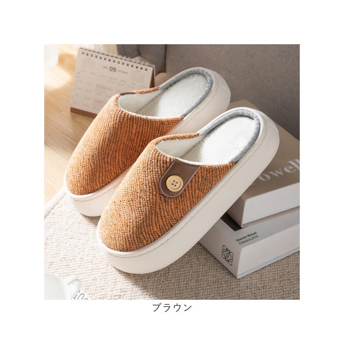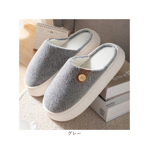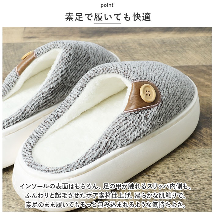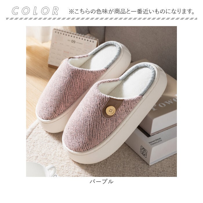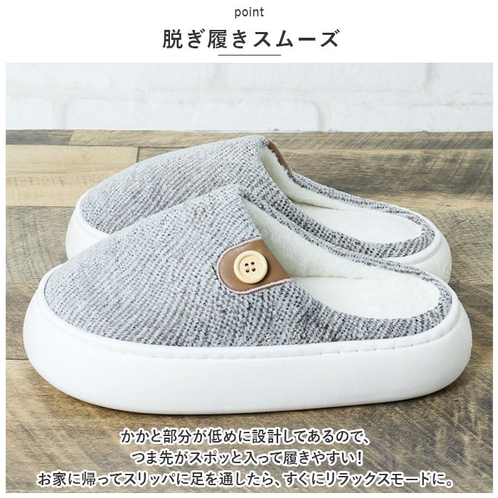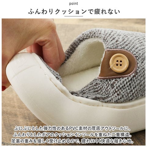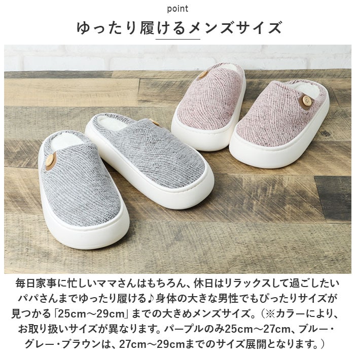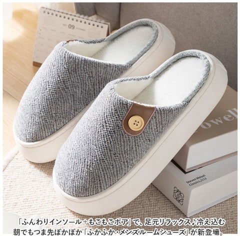 | 商品説明 | 「ふんわりインソール+もこもこボア」で、足元リラックス♪冷え込む朝でもつま先ぽかぽか「ふかふか・メンズルームシューズ」が新登場。【秋冬らしい温かみのある素材感】表生地は、光沢感のある糸を波状に織り交ぜた温かみのある杢調生地。内側はぬくぬくのボア素材で仕上げた、コロンと丸いカタチが特徴の大きめメンズスリッパ。【ふんわりクッションで疲れない】ぷにぷにとした弾力性のあるPVC素材の厚底アウトソールに、ふんわりとしたボアのクッションインソールを重ねた二重構造。足裏の重みを優しく受け止めるので、疲れにくく快適な履き心地。【素足で履いても快適】インソールの表面はもちろん、足の甲が触れるスリッパ内側も、ふんわりと起毛させたボア素材仕上げ。滑らかな肌触りで、素足のまま履いてもそっと包み込まれるような気持ちよさ。【脱ぎ履きスムーズ】かかと部分が低めに設計してあるので、つま先がスポッと入って履きやすい!お家に帰ってスリッパに足を通したら、すぐにリラックスモードに。【滑りにくい底面加工】ソールの底面にはくさび形状の凹凸を刻み、ツルツルと滑りやすいフローリングの上や階段を昇るときでも安心。【ゆったり履けるメンズサイズ】毎日家事に忙しいママさんはもちろん、休日はリラックスして過ごしたいパパさんまでゆったり履ける♪身体の大きな男性でもぴったりサイズが見つかる「25cm~29cm」までの大きめメンズサイズ。(※カラーにより、お取り扱いサイズが異なります。パープルのみ25cm~27cm、ブルー・グレー・ブラウンは、27cm~29cmまでのサイズ展開となります。)【冬のおうち時間の必須アイテム】味わい深い杢調生地にホワイトのソールが明るく映える爽やかなカラーに、履き口のボタンがさりげないアクセント。滑らかな肌触りとぽかぽかの暖かさで、快適なおうち時間を♪ |