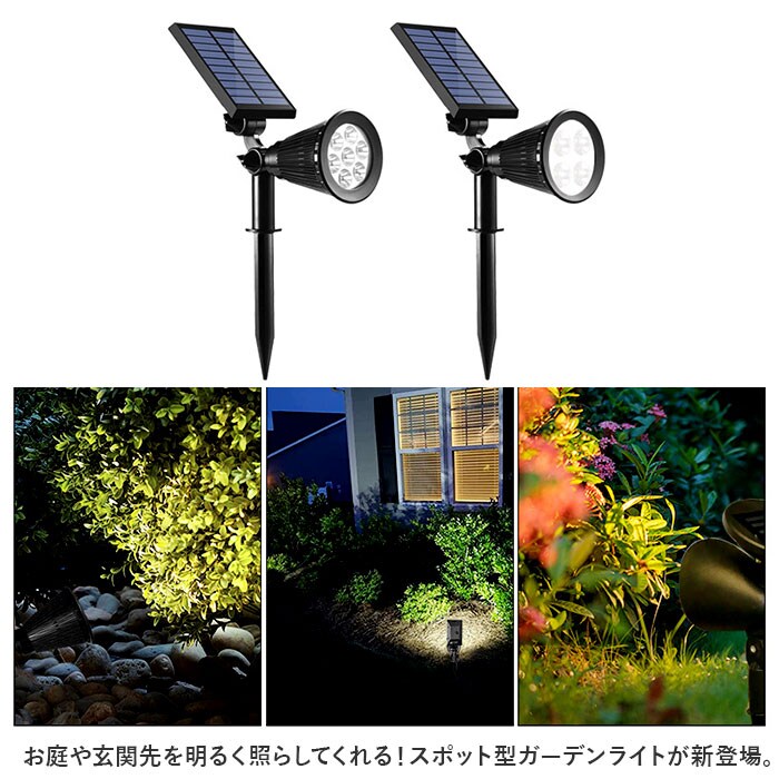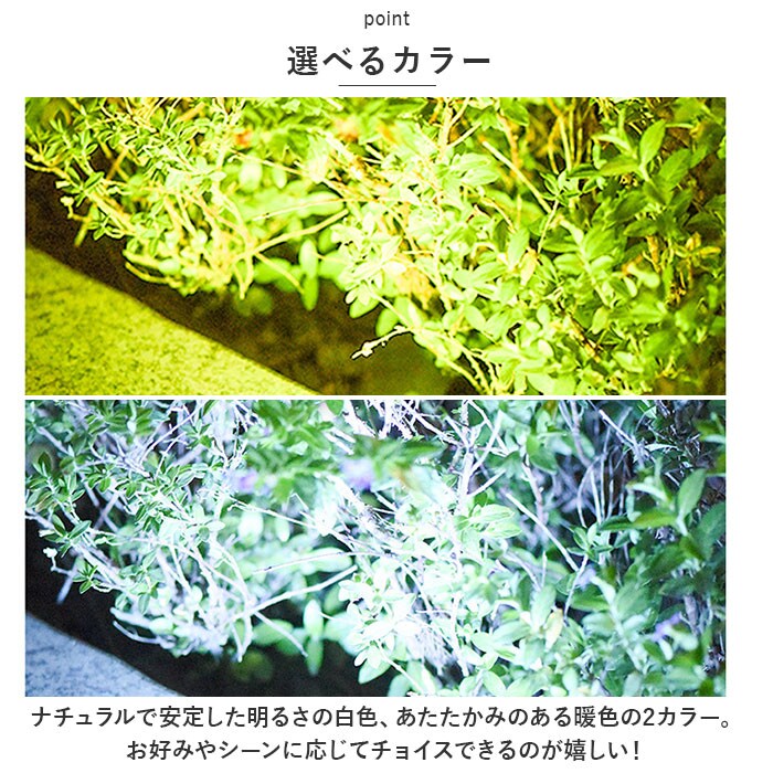 | 商品説明 | お庭や玄関先を明るく照らしてくれる!スポット型ガーデンライトが新登場。【ソーラー充電式】ソーラーパネルに太陽光を当てるだけで、日中に自動充電。電池交換の手間を省け、電気代0円でとってもエコ◎【ボタン1つで操作】ソーラーパネル裏のON/OFFスイッチボタンを、数秒長押しで点灯。もう1度押すと光を弱くでき、さらにもう1度押すと消灯。【自由に角度調節】ライトは60度、ソーラーパネルは180度角度調節可能。光を照らす位置や、太陽が当たりやすい位置を自在に調節できて便利。【設置方法は2通り】ポールをセットして地面に差し込むも良し、付属のネジとプラグを使って壁面に取り付けもできる!設置場所に応じて使い分け。【屋外でも安心】本体は防水仕様なので、屋外でも使用OK。(※台風などの強い雨風の際は使用をお避けください。)【様々な場所で活躍】自宅やお店の入り口前に設置するアプローチライト、BBQやキャンプなどで辺りを照らすライトとして。防犯対策にも役立ち、色んな場面で重宝◎【選べるカラー】ナチュラルで安定した明るさの白色、あたたかみのある暖色の2カラー。お好みやシーンに応じてチョイスできるのが嬉しい! |
