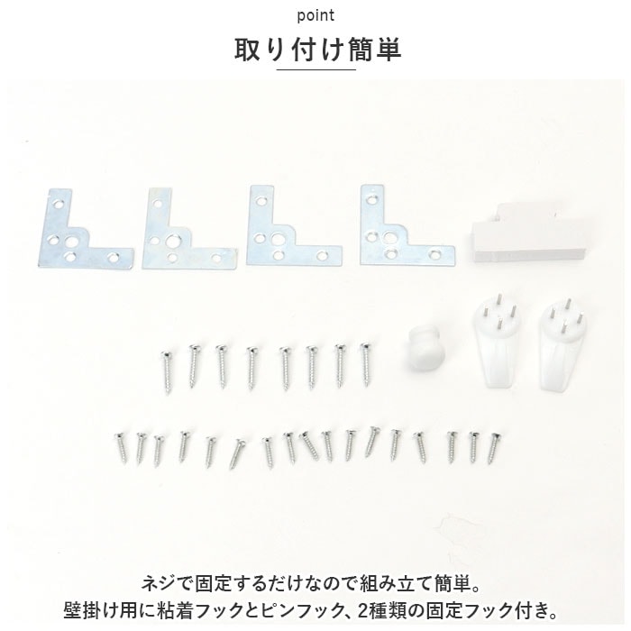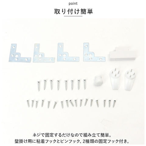 | 注意点 | [付属品]・粘着フック x 2個・ピンフック x 2個・ネジ大 x 8個・ネジ小 x 17個・連結金具 x4個海外輸入品のため、商品によってはパッケージや説明書が、英語や中国語表記となっている場合があります。商品を安価でご提供させていただくため、輸入時のパッケージのままでのお届けとなります。予めご了承くださいませ。海外輸入品のため、パッケージに破れ、傷やへこみがある場合がございます。本体には問題ございませんので、予めご了承くださいませ。商品の写真はできる限り実物のお色に近づけるように加工しておりますが、お使いのモニター設定、お部屋の照明などにより、実際の商品と異なる場合がございます。商品の生産時期などにより、付属品(ボタン、ファスナー、タグ、パッケージなど)のデザインや仕様の一部が変更になる場合がございますが、予めご了承くださいませ。採寸方法の違いにより、多少の誤差がある場合がございます。 |