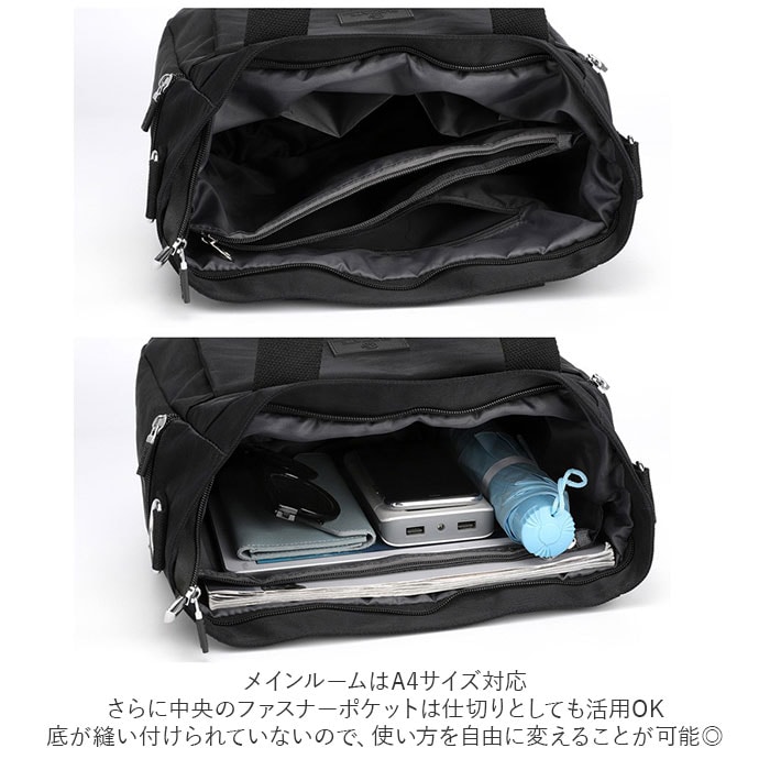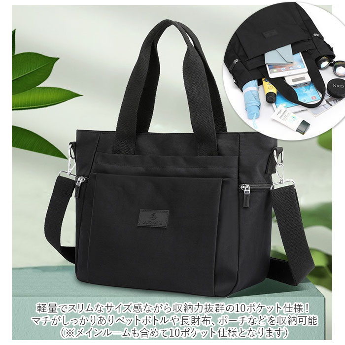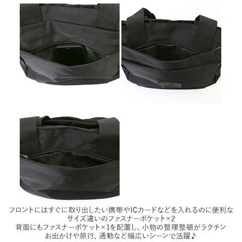 | 商品説明 | 手持ちのバッグとしてはもちろん、付属のショルダーベルトを取り付けてショルダーバッグとしても使える!2wayタイプのトートバッグ。軽量でスリムなサイズ感ながら収納力抜群の10ポケット仕様!(※メインルームも含めて10ポケット仕様となります。)表面生地に水滴や汚れをサッと弾くはっ水加工が施されているから、急な雨でも安心。(※完全防水仕様ではありません。)メインルームはA4サイズ対応。マチがしっかりありペットボトルや長財布、ポーチなどを収納可能。オープンポケット×2とファスナーポケット×2を装備。さらに中央のファスナーポケットは仕切りとしても活用OK。底が縫い付けられていないので、使い方を自由に変えることが可能◎フロントにはすぐに取り出したい携帯やICカードなどを入れるのに便利な、サイズ違いのファスナーポケット×2。両サイドにもファスナーポケット×2。背面にもファスナーポケット×1を配置し、小物の整理整頓がラクチン。お出かけや旅行、通勤など幅広いシーンで活躍♪ |