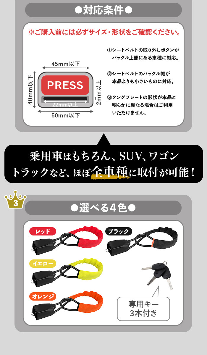 | 商品説明 | 【愛車の盗難防止対策に!】ハンドルをがっちりロックして盗難防止!「ハンドルロック」が新登場。【切断に強い特殊金属】切断に強い頑丈でタフなワイヤーを採用!車の外からでも見える抜群の存在感で盗難抑止効果◎【コンパクトに収納可能】柔軟性のあるワイヤーなので、使わない時は車内のダッシュボードなどに保管できて便利。【取り付けも簡単】ハンドルに引っかけてループを通したら、シートベルトにカチッと装着するだけ!(※)車種によっては取り付けできない場合もございます。【様々な車種に取り付けOK】シートベルトに装着するので、軽自動車からSUV車まで幅広い車種に対応!左ハンドルにも取り付けOK。(※)サイズをご確認ください。 |
