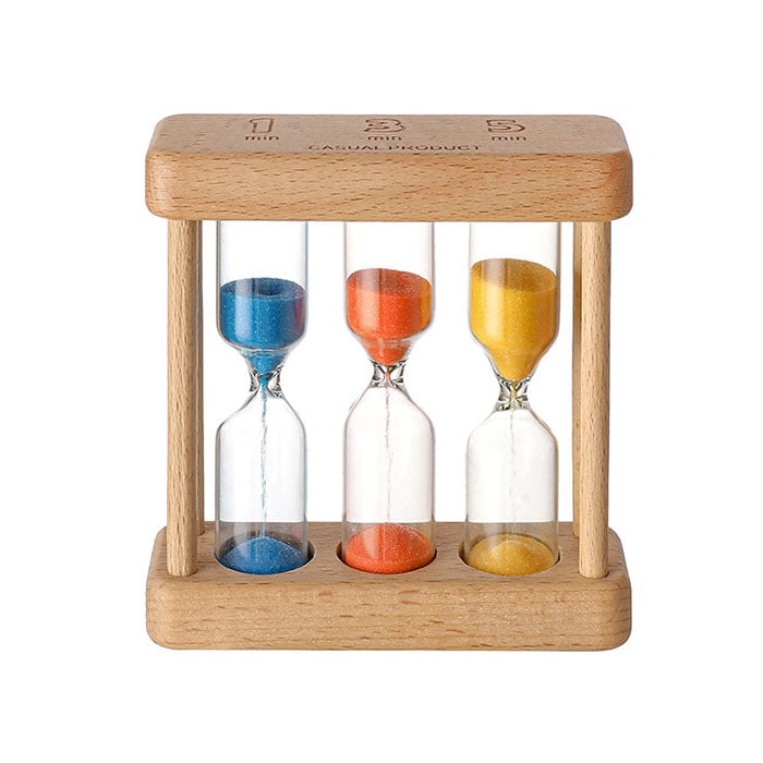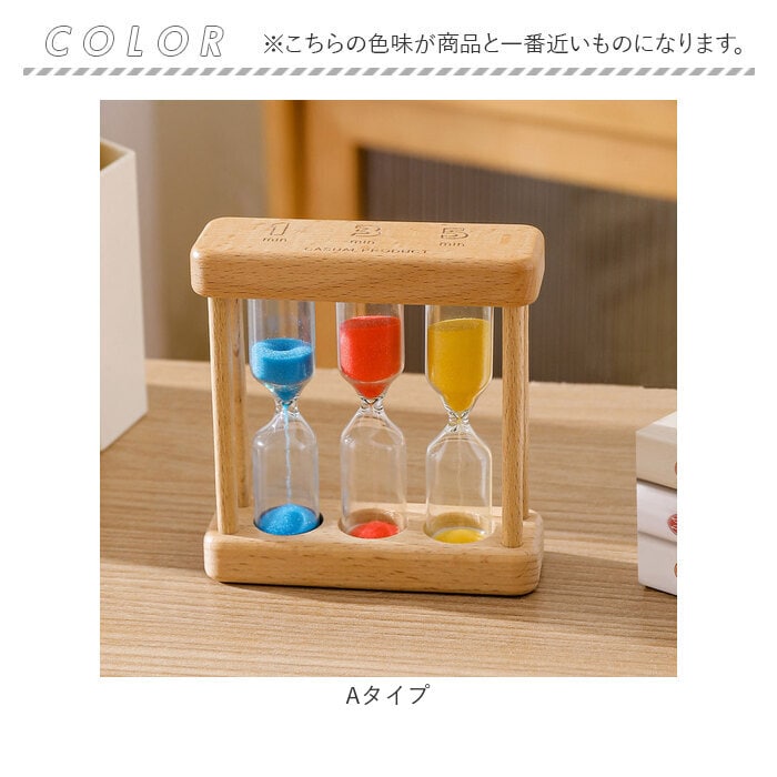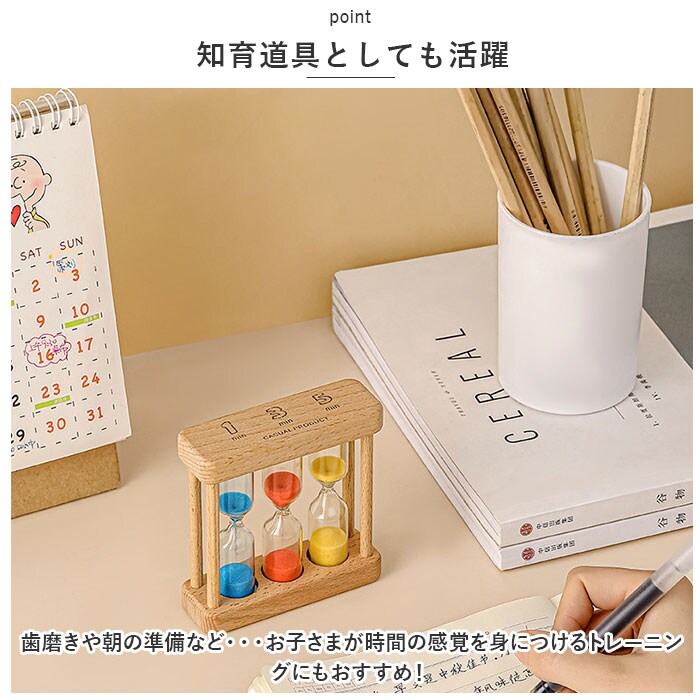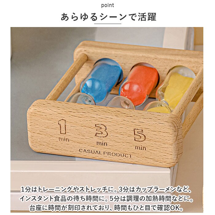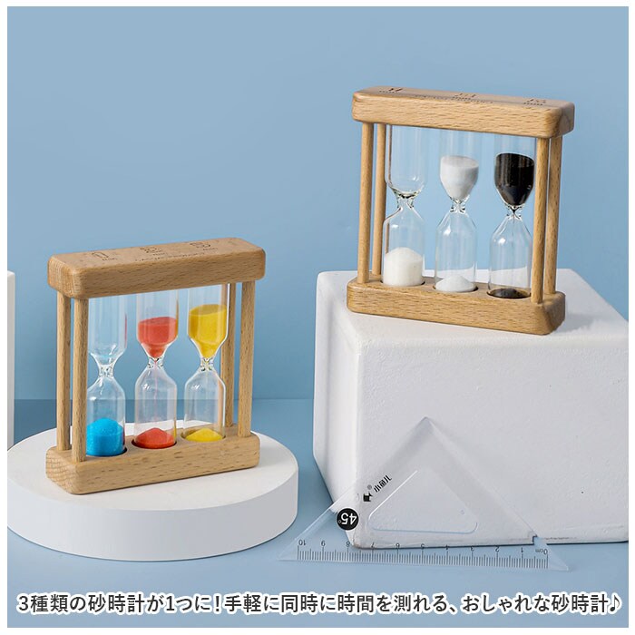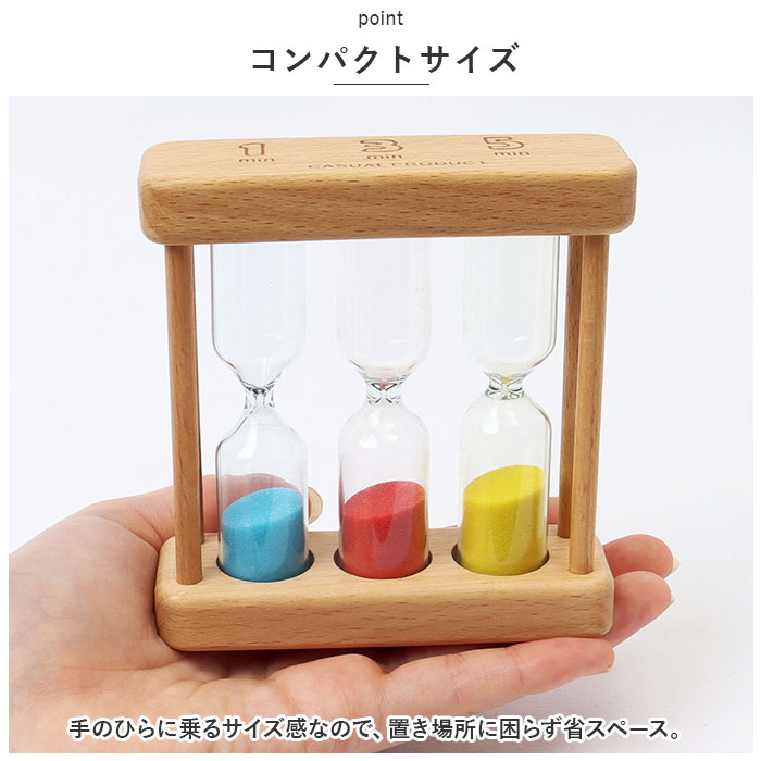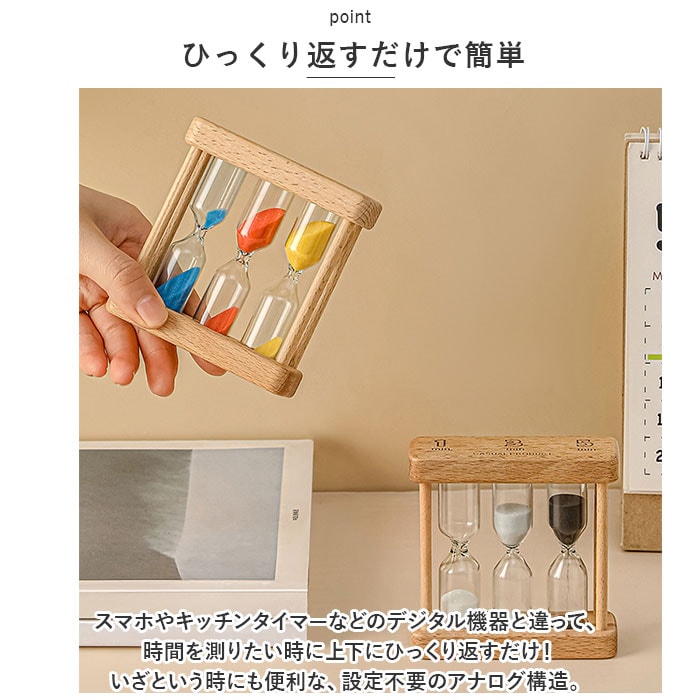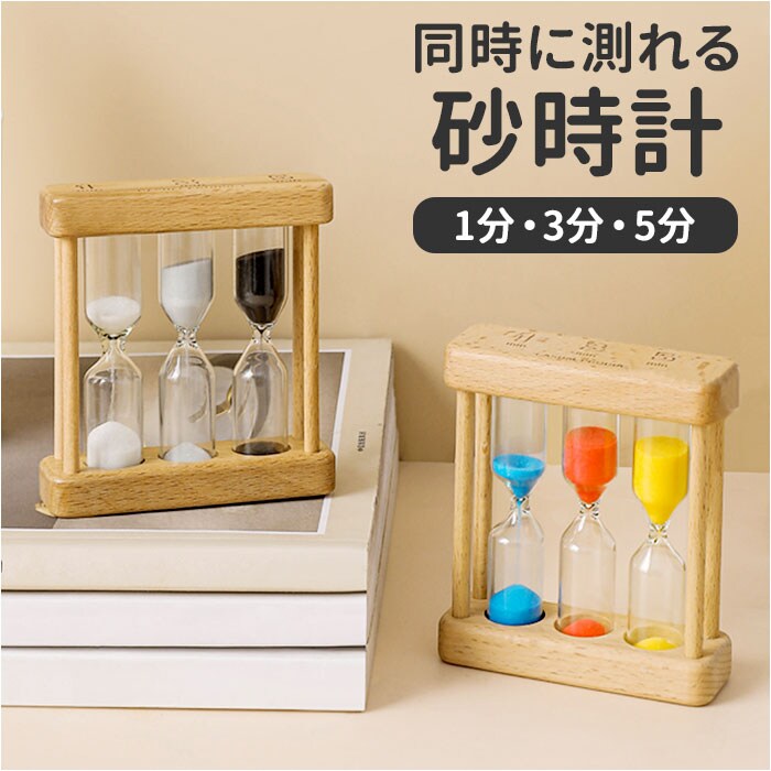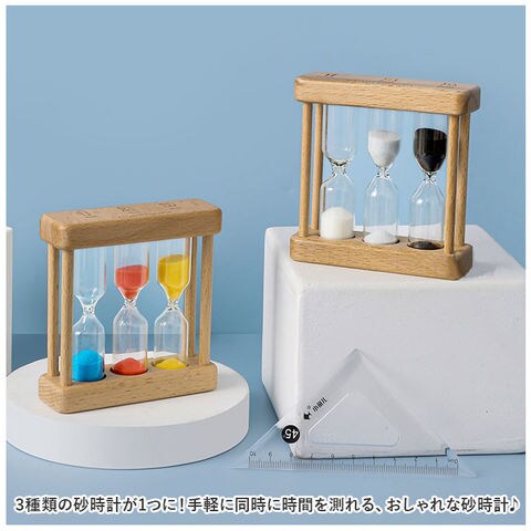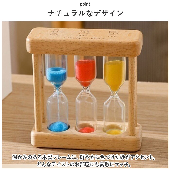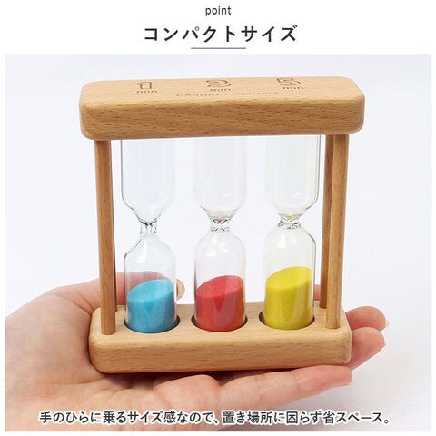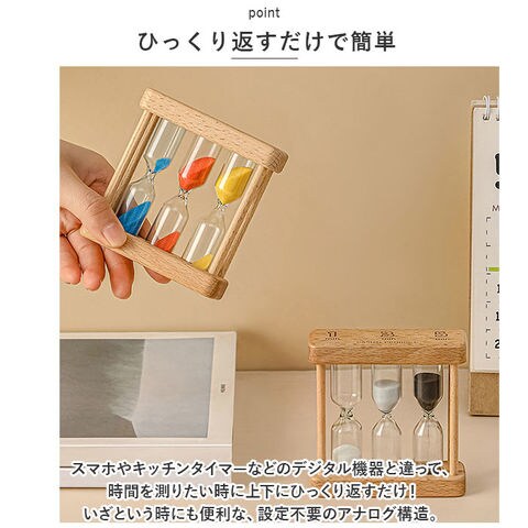 | 商品説明 | ・3種類の砂時計が1つに!手軽に同時に時間を測れる、おしゃれな砂時計♪【ひっくり返すだけで簡単】スマホやキッチンタイマーなどのデジタル機器と違って、時間を測りたい時に上下にひっくり返すだけ!いざという時にも便利な、設定不要のアナログ構造。【あらゆるシーンで活躍】・1分はトレーニングやストレッチに。3分はカップラーメンなど、インスタント食品の待ち時間に。5分は調理の加熱時間などに。台座に時間が刻印されており、時間もひと目で確認OK。【コンパクトサイズ】手のひらに乗るサイズ感なので、置き場所に困らず省スペース。【ナチュラルなデザイン】温かみのある木製フレームに、鮮やかに色づけた砂がアクセント。どんなテイストのお部屋にも素敵にマッチ。【リラックスタイムのお供に】ぼーっと眺めているだけで、ゆったりとした時間を感じさせてくれる!忙しい毎日の中に癒やしの時間を♪【知育道具としても活躍】歯磨きや朝の準備など・・・お子さまが時間の感覚を身につけるトレーニングにもおすすめ! |