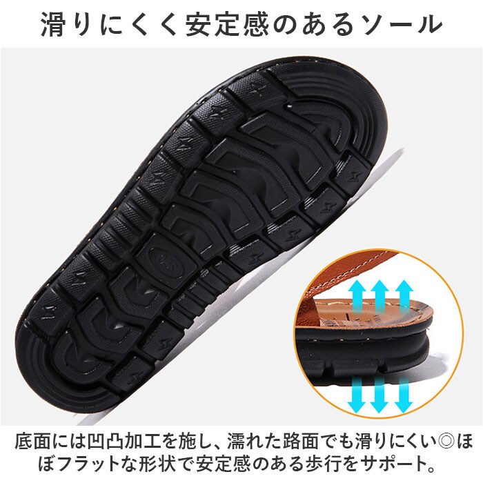 | 商品説明 | 色んなシーンで活躍。おしゃれに履けるサンダルが新登場。【落ち着きのある大人な雰囲気を演出】アッパーは滑らかな質感で程よいツヤのあるスプリットレザー素材。スティッチや金具使いなど、スタイリッシュで大人な仕上がり。【脱げにくく心地よいフィット感】可動式のバックストラップ付き。お好みの位置でかかとを優しくホールドできるので、履き方はお好みでアレンジ。【汗ばむ季節もサラッと快適】つま先のあいたオープントゥデザイン。アッパーやバックも開放感があり、通気性が良く暑い季節に最適。【屈曲性があり、歩きやすさが向上】つま先部分が足の動きに合わせて柔軟に曲がり、やや上を向いたつくり。つまづきにくく蹴り上げやすい◎【滑りにくく安定感のあるソール】底面には凹凸加工を施し、濡れた路面でも滑りにくい◎ほぼフラットな形状で安定感のある歩行をサポート。【アクティブに動けて疲れ知らず】軽やかな履き心地で、長時間履いても大丈夫◎買い物や旅行などに!【お出かけにはもちろんオフィスでも】素足でも靴下を履いたままでもOK。プライベートシーンだけでなく、オフィスサンダルとしても重宝。 |