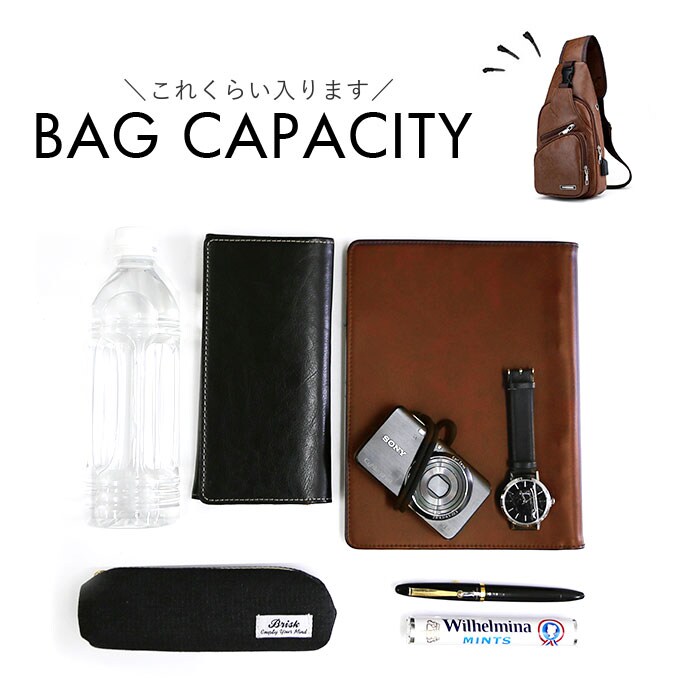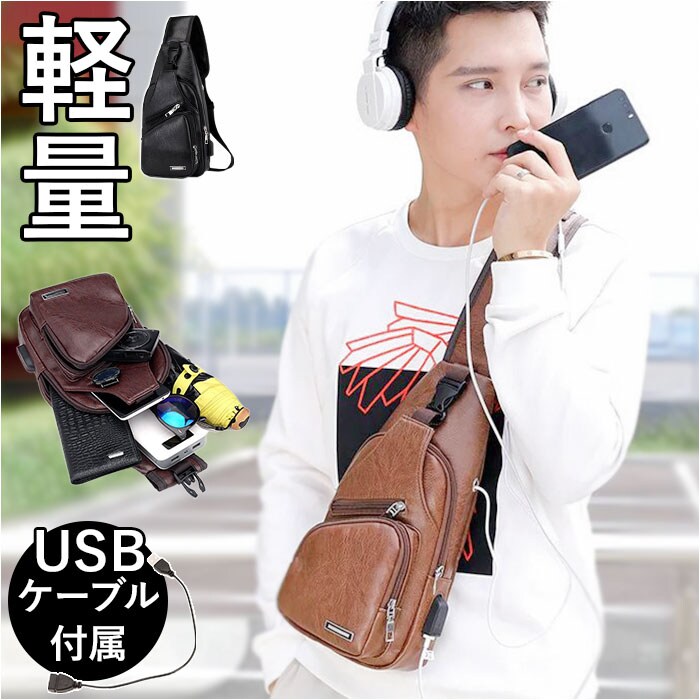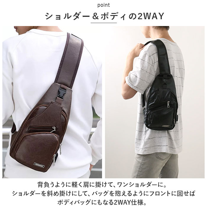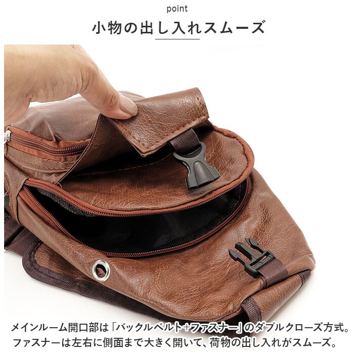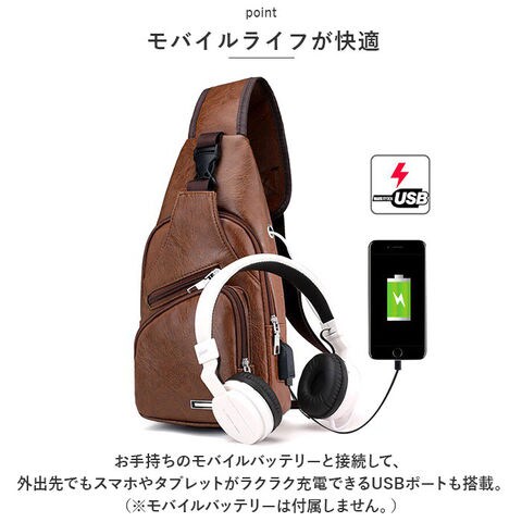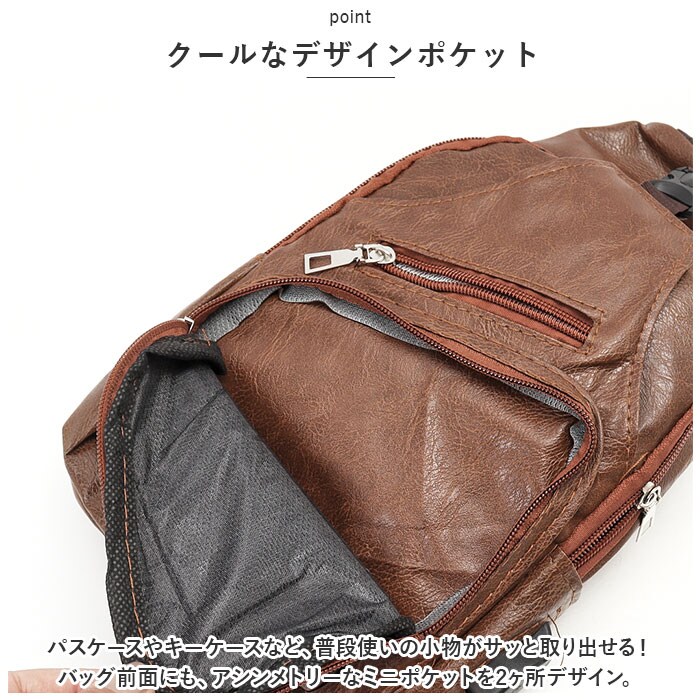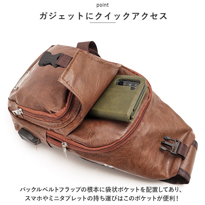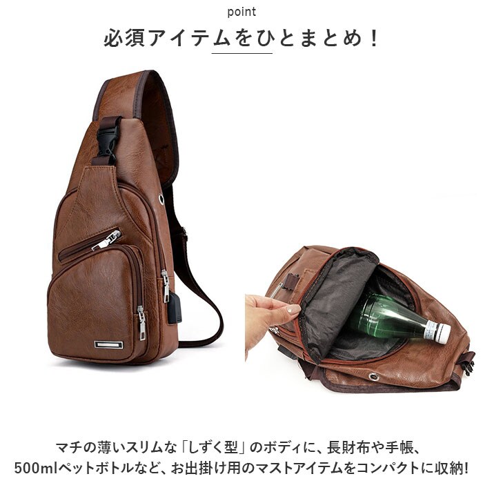 商品説明ミニマル派男子のスタイリッシュなお出掛けを応援!軽量&コンパクトな「メンズ ショルダーバッグ」が新登場。【必須アイテムをひとまとめ!】マチの薄いスリムな「しずく型」のボディに、長財布や手帳、500mlペットボトルなど、お出掛け用のマストアイテムをコンパクトに収納可能。【小物の出し入れスムーズ】メインルーム開口部は「バックルベルト+ファスナー」のダブルクローズ方式。ファスナーは左右に側面まで大きく開いて、荷物の出し入れがスムーズ。【ガジェットにクイックアクセス】バックルベルトフラップの根本に袋状ポケットを配置してあり、スマホやミニタブレットの持ち運びはこのポケットが便利!【クールなデザインポケット】パスケースやキーケースなど、普段使いの小物がサッと取り出せる!バッグ前面にも、アシンメトリーなミニポケットを2ヶ所デザイン。【モバイルライフが快適】お手持ちのモバイルバッテリーと接続して、外出先でもスマホやタブレットがラクラク充電できるUSBポートも搭載。(※モバイルバッテリーは付属しません。)【ショルダー&ボディの2WAY】背負うように軽く肩に掛けて、ワンショルダーに。ショルダーを斜め掛けにして、バッグを抱えるようにフロントに回せばボディバッグにもなる2WAY仕様。【シンプル&シックなカラー】街歩きやアウトドアに、身軽な足取りで出掛けられる軽量フェイクレザー仕上げ。ビンテージ感のある風合いとコーディネートしやすいシックなカラーも魅力のひとつ。