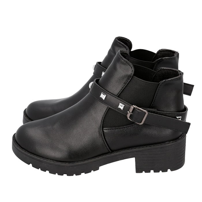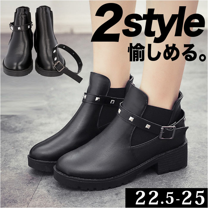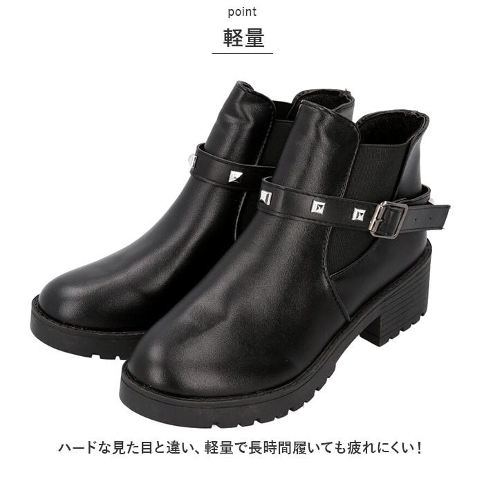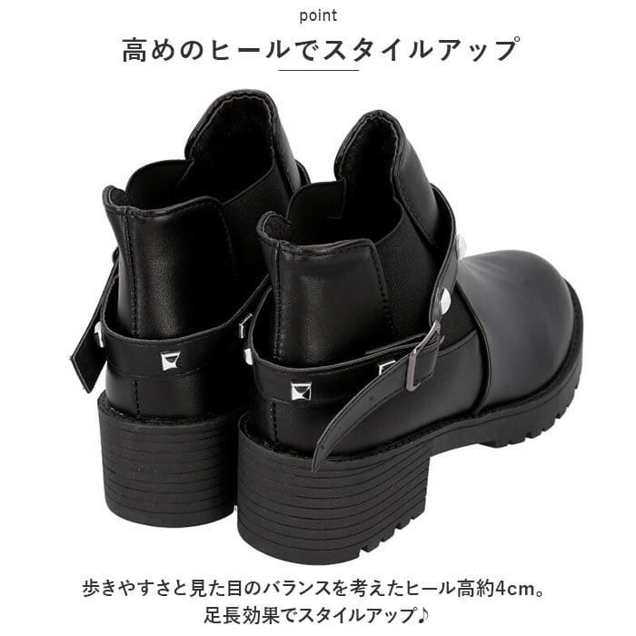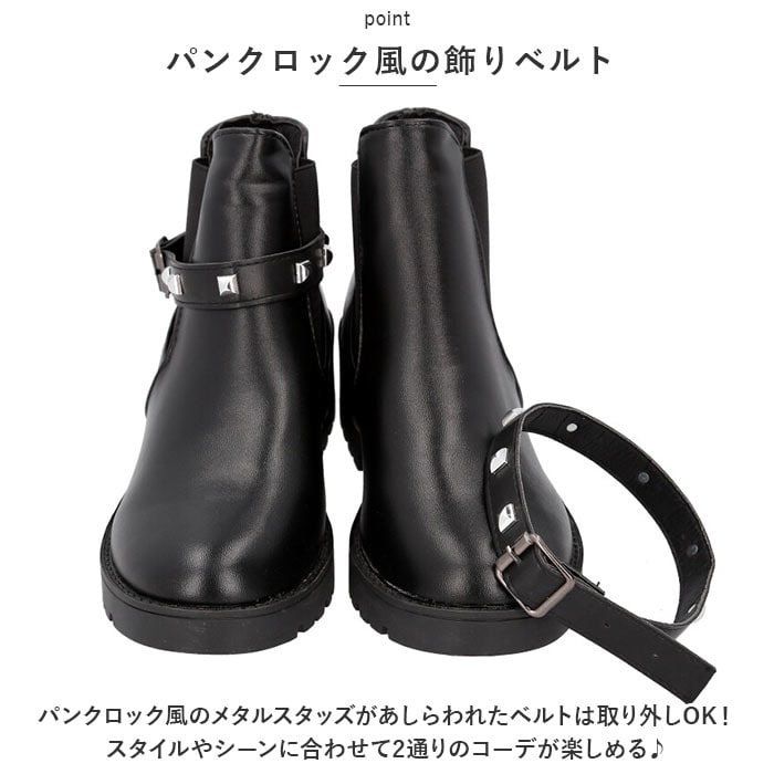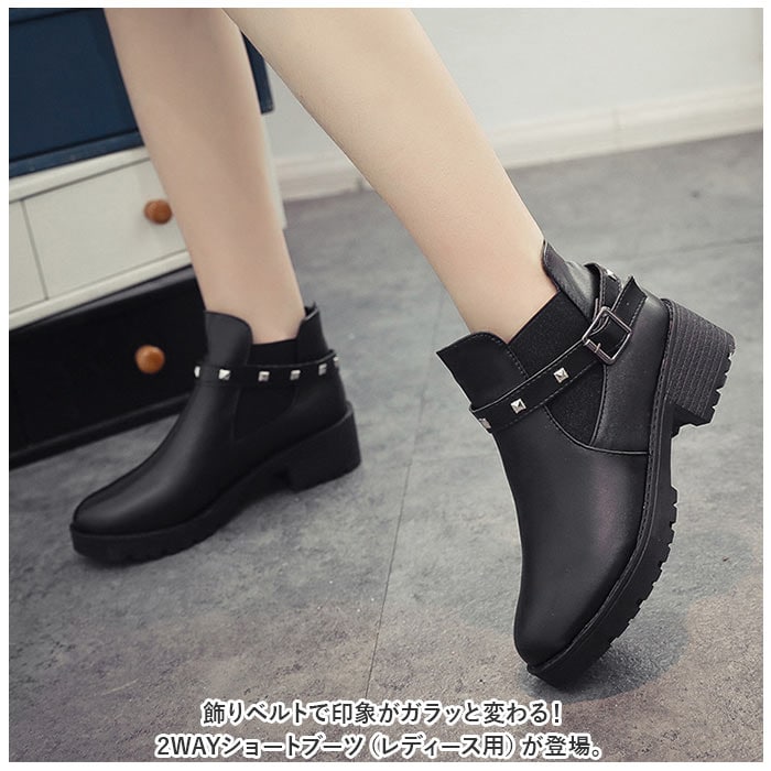 | 商品説明 | 飾りベルトで印象がガラッと変わる!2WAYショートブーツ(レディース用)が登場。【パンクロック風の飾りベルト】パンクロック風のメタルスタッズがあしらわれたベルトは取り外しOK!スタイルやシーンに合わせて2通りのコーデが楽しめる♪【サイドゴアブーツ】履き口にゴム布が縫い込まれたサイドゴアブーツだから、脱ぎ履きしやすい!【高めのヒールでスタイルアップ】歩きやすさと見た目のバランスを考えたヒール高約4cm。足長効果でスタイルアップ♪【軽量】ハードな見た目と違い、軽量で長時間履いても疲れにくい! |