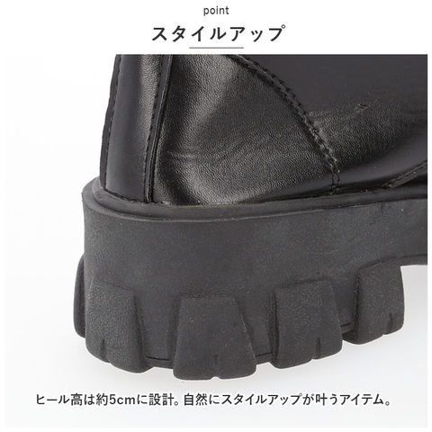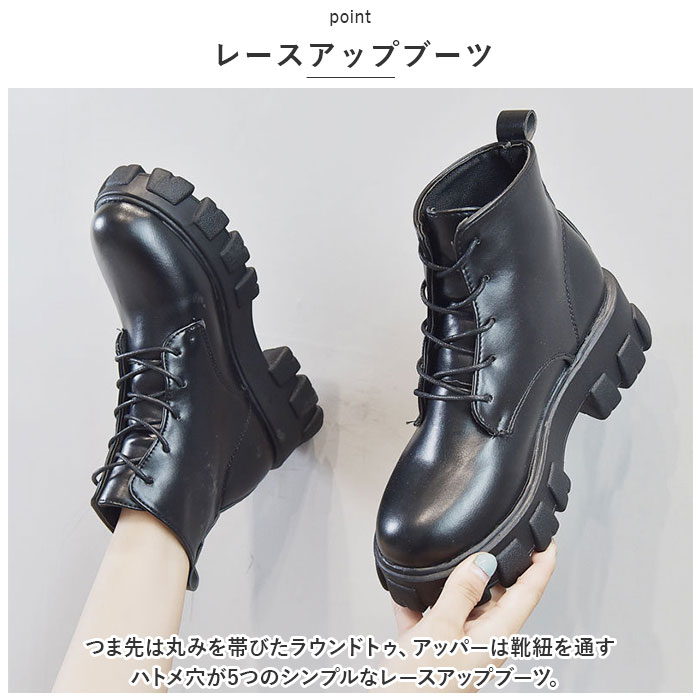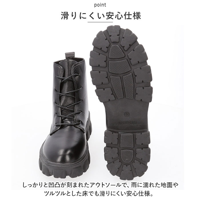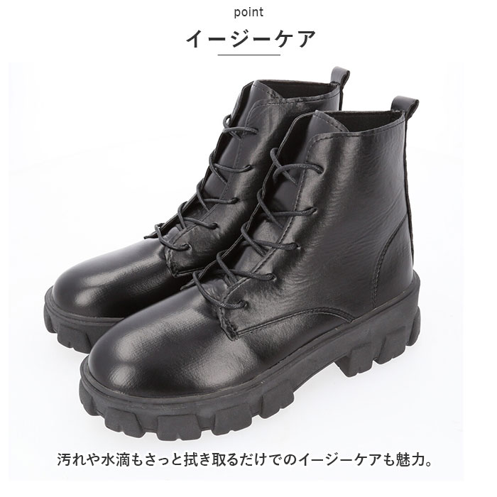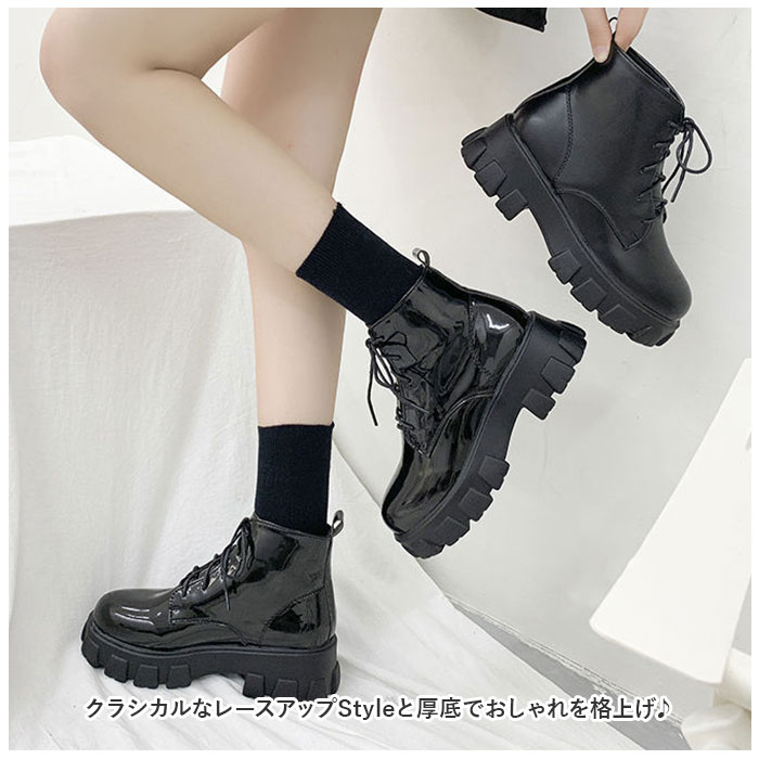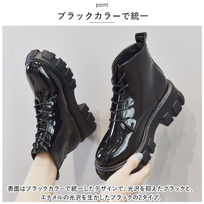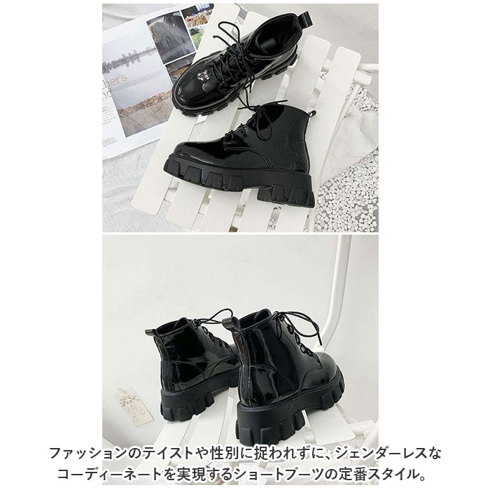 | 商品説明 | クラシカルなレースアップStyleと厚底でおしゃれを格上げ♪【レースアップブーツ】つま先は丸みを帯びたラウンドトゥ、アッパーは靴紐を通すハトメ穴が5つのシンプルなレースアップブーツ。【スタイルアップ】ヒール高は約5cmに設計。自然にスタイルアップが叶うアイテム。【滑りにくい安心仕様】しっかりと凹凸が刻まれたアウトソールで、雨に濡れた地面やツルツルとした床でも滑りにくい安心仕様。【イージーケア】汚れや水滴もさっと拭き取るだけでのイージーケアも魅力。【ブラックカラーで統一】表面はブラックカラーで統一したデザインで、光沢を抑えたブラックと、エナメルの光沢を生かしたブラックの2タイプ。【ショートブーツの定番スタイル】ファッションのテイストや性別に捉われずに、ジェンダーレスなコーディーネートを実現するショートブーツの定番スタイル。 |