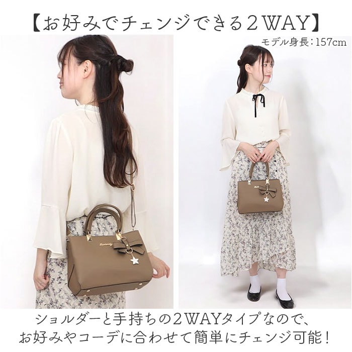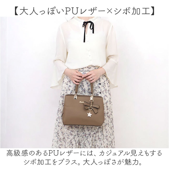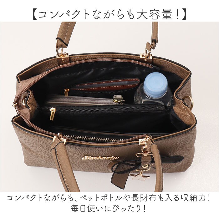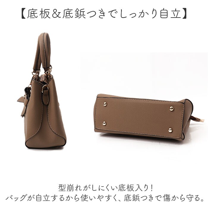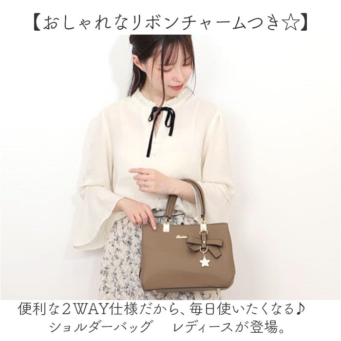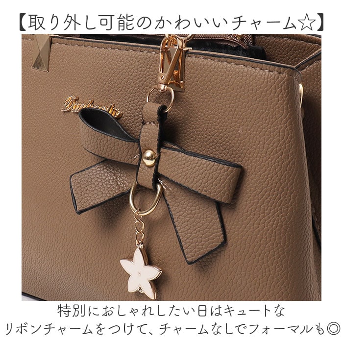 | 商品説明 | 【おしゃれなリボンチャームつき☆】便利な2WAY仕様だから、毎日使いたくなる♪ ショルダーバッグ レディースが登場。【コンパクトながらも大容量!】コンパクトながらも、ペットボトルや長財布も入る収納力!毎日使いにぴったり!【仕切りタイプで荷物を入れやすい】メインの真ん中には仕切りポケットを配置。ファスナーつきなので防犯面も安心。【お好みでチェンジできる2WAY】ショルダーと手持ちの2WAYタイプなので、お好みやコーデに合わせて簡単にチェンジ可能!【底板&底鋲つきでしっかり自立】型崩れがしにくい底板入り!バッグが自立するから使いやすく、底鋲つきで傷から守る。【取り外し可能のかわいいチャーム☆】特別におしゃれしたい日はキュートなリボンチャームをつけて、チャームなしでフォーマルも◎【大人っぽいPUレザー×シボ加工】高級感のあるPUレザーには、カジュアル見えもするシボ加工をプラス。大人っぽさが魅力。【ポケット仕様】メイン収納:オープンポケット×1、仕切りファスナーポケット×1、ファスナーポケット×1背面:ファスナーポケット×1 |