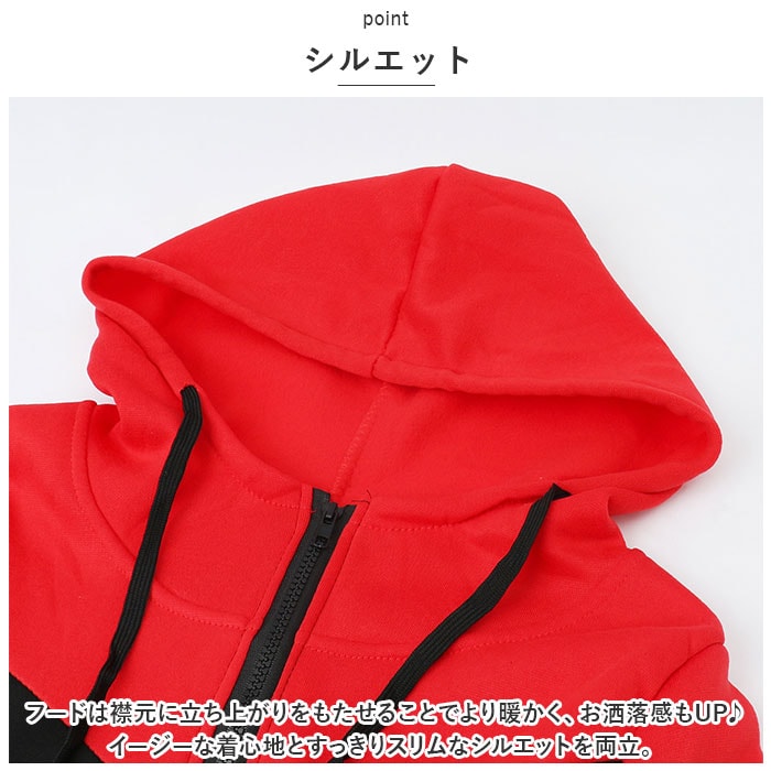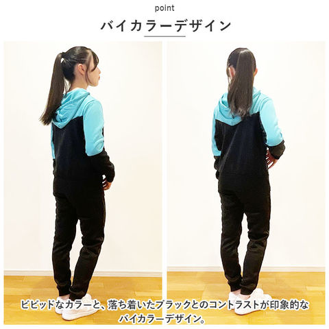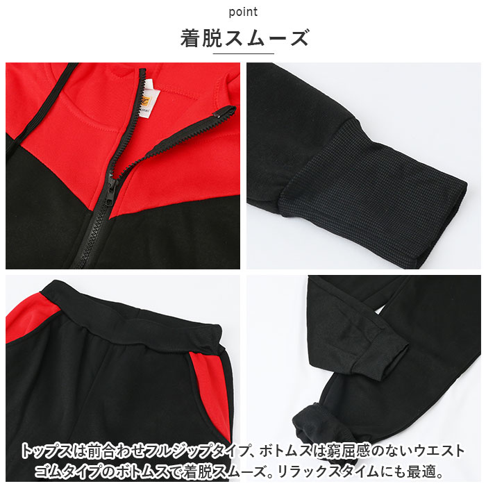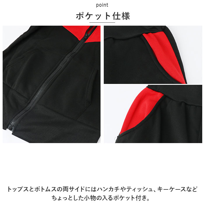 | 商品説明 | バイカラーを楽しむ♪リラックス&クールに着こなせる「ジャージ セットアップ」【バイカラーデザイン】ビビッドなカラーと、落ち着いたブラックとのコントラストが印象的なバイカラーデザイン。【セットアップ】そのまま着るだけでおしゃれなコーディネートを楽しめるセットアップ。【サラッとした着心地】サラッとした肌触りの素材を使用。裏地には裏起毛素材を採用。全体的に薄手ながらも、スポーツ後の冷えを予防。【シルエット】フードは襟元に立ち上がりをもたせることでより暖かく、お洒落感もUP♪イージーな着心地とすっきりスリムなシルエットを両立。【着脱スムーズ】トップスは前合わせフルジップタイプ、ボトムスは窮屈感のないウエストゴムタイプのボトムスで着脱スムーズ。リラックスタイムにも最適。【ポケット仕様】トップスとボトムスの両サイドにはハンカチやティッシュ、キーケースなどちょっとした小物の入るポケット付き。【様々なシーンで活躍】スポーツウェアはモチロン、ルームウェアとしても活躍♪ |