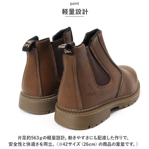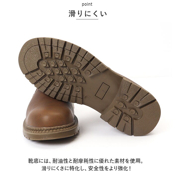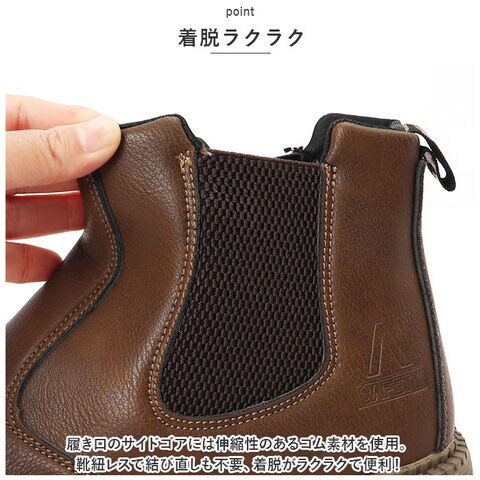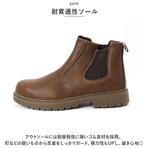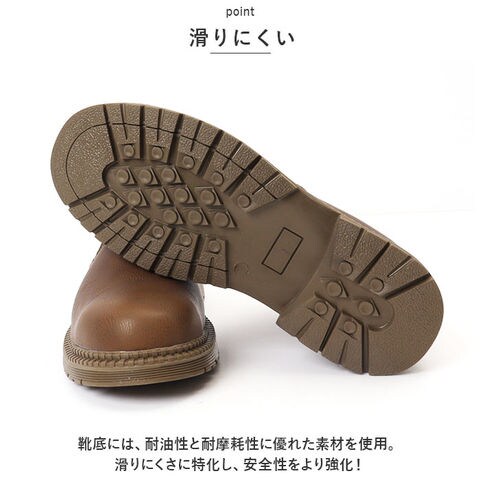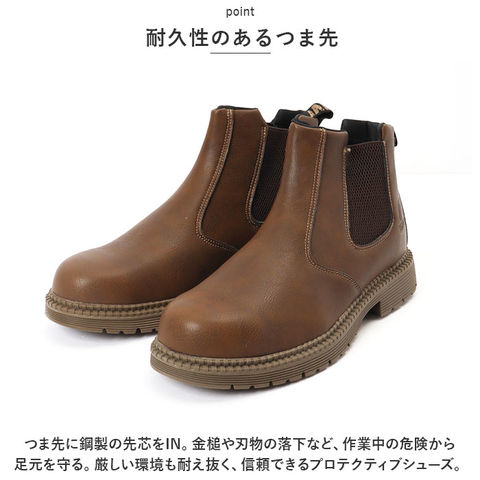 | 商品説明 | つま先保護先芯入り◎軽さとデザイン性を兼ね備えた「作業靴」が登場!【耐久性のあるつま先】つま先に鋼製の先芯をIN。金槌や刃物の落下など、作業中の危険から足元を守る。厳しい環境も耐え抜く、信頼できるプロテクティブシューズ。【耐貫通性ソール】アウトソールには耐摩耗性に強いゴム素材を採用。釘などの鋭いものから足裏をしっかりガード。弾力性もUPし、履き心地◎【軽量設計】片足約563gの軽量設計。動きやすさにも配慮した作りで、安全性と快適さを両立。(※42サイズ(26cm)の商品の重量です。)【着脱ラクラク】履き口のサイドゴアには伸縮性のあるゴム素材を使用。靴紐レスで結び直しも不要、着脱がラクラクで便利!【滑りにくい】靴底には、耐油性と耐摩耗性に優れた素材を使用。滑りにくさに特化し、安全性をより強化!【外せるインソール】インソール部分は取り外し可能。洗濯しやすく清潔に保てるのも嬉しいポイント。【デザイン性】くるぶしまで覆う、ショートブーツのようなデザイン性の高いアイテム。作業靴には見えないオシャレさなので、作業時はもちろん普段使いもOK! |