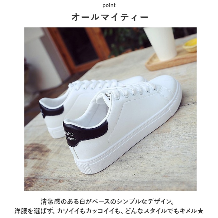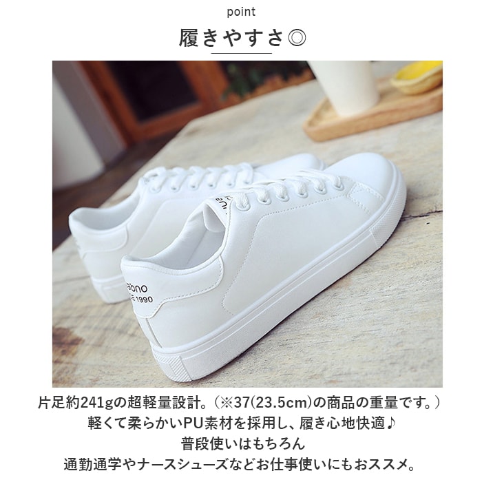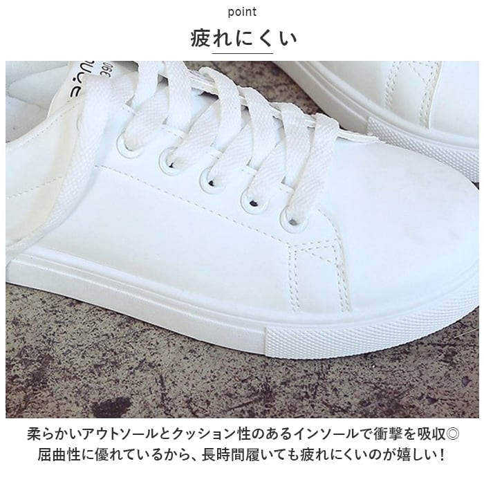 | 商品説明 | 洋服を選ばないオールマイティーな「スニーカー レディース」の登場。【オールマイティー】清潔感のある白がベースのシンプルなデザイン。洋服を選ばず、カワイイもカッコイイも、どんなスタイルでもキメル★【履きやすさ◎】片足約241gの超軽量設計。(※37(23.5cm)の商品の重量です。)軽くて柔らかいPU素材を採用し、履き心地快適♪普段使いはもちろん、通勤通学やナースシューズなどお仕事使いにもおススメ。【疲れにくい】柔らかいアウトソールとクッション性のあるインソールで衝撃を吸収◎屈曲性に優れているから、長時間履いても疲れにくいのが嬉しい!【いつでも清潔に】インソールは取り外し可能なので、いつでも気軽に洗える!清潔さをキープできるのも嬉しいポイント。【雨の日も安心】雨が染み込みにくく、汚れが落ちやすいのも嬉しいポイント。(※耐防水ではありません。)アウトソールは滑り止め加工を施していて雨の日も安心。 |