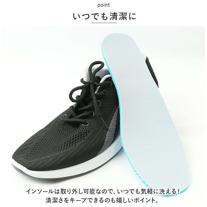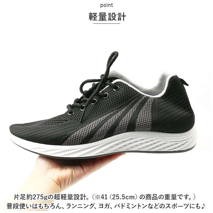 | 商品説明 | 蒸れにくく快適!軽快な履き心地の「スニーカー メンズ」の登場!【通気性の良さ◎】アッパーには通気性に優れた、目の細かいメッシュ素材を採用。蒸れにくく靴内がいつも快適。【スリッポンデザイン】かかとを踏んで、スリッポンスタイルも◎サッと履きたい時、脱ぎ履きの手間、一切なし。【軽量設計】片足約275gの超軽量設計。(※41(25.5cm)の商品の重量です。)普段使いはもちろん、ランニング、ヨガ、バドミントンなどのスポーツにも♪【疲れにくい】柔らかいアウトソールとクッション性のあるインソールで衝撃を吸収◎屈曲性に優れているから、長時間履いても疲れにくいのが嬉しい!【いつでも清潔に】インソールは取り外し可能なので、いつでも気軽に洗える!清潔さをキープできるのも嬉しいポイント。【シンプルなデザイン】シンプルなシルエットで足元がスッキリとまとまる。ブラックベースの2色展開でお洋服を選ばないので、デイリーユースにはもちろん、スポーツ時にも活躍。【雨の日も安心】アウトソールは滑り止め加工を施していて雨の日も安心。 |