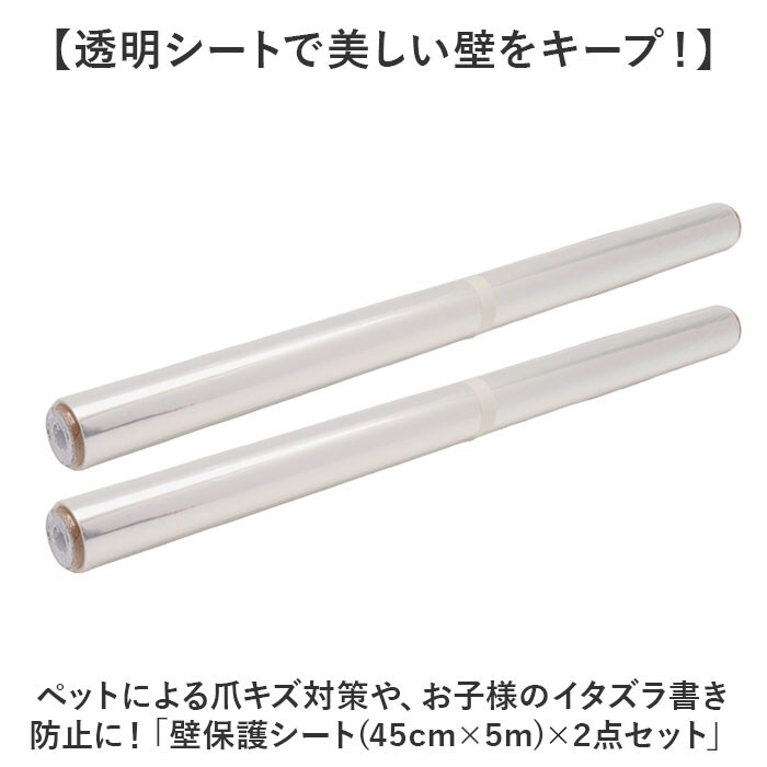 | 商品説明 | 【透明シートで美しい壁をキープ!】ペットによる爪キズ対策や、お子様のイタズラ書き防止に!「壁保護シート(45cm×5m)×2点セット」【ボロボロになる前にメンテナンス】ワンちゃんや猫ちゃんが壁紙でカリカリ爪とぎ・・・。ペットを叱る前に透明シートでしっかり保護!【つるつるだから、キズが付かない】お部屋の壁の下部にペタっと貼るだけ!表面のつるつるとした質感で引っかき傷や汚れを防止。【貼ってはがせてのり残りしない】ペタっと貼って、サッとはがせる静電吸着タイプ。接着剤なしで壁を傷めないから賃貸住宅でもOK!【繰り返し使えて、とってもECO】貼り付け場所の面積が大きいほど静電吸着力が大きくなり、何度も繰り返し貼って使えるエコ仕様。【防水防汚仕様でお手入れ簡単】シートに水が染みこまない表面防水仕様。マジックのイタズラ書きもサッとひと拭きで簡単キレイ!【大きさもカタチも自由にカット】薄手のポリプロピレンシートなので、貼りたい壁の広さに合わせてカッターで自由にカット可能。【目立たないクリアタイプ】壁紙や壁面の素材を生かして目立たない透明タイプ。インテリアの雰囲気を損ねたくない方に最適。【選べる2種類の素材感】ツヤツヤの輝きで清潔感を演出する「つやあり」と、しっとり落ち着きのある「つや消し」の2タイプ。【広範囲に貼れる幅広シート】壁面の広い範囲や、家具やドアの表面にも自由にたっぷり貼れる、高さ45cm×5mの大きめサイズ。【小型犬、子猫ちゃんに最適サイズ】高さ45cmまでの程よい範囲をカバーするので、小型犬・子猫ちゃんのいるご家庭に最適。【さまざまなシーンに活用可能】ベビーベッド回りや子ども部屋、システムキッチン周りの油汚れ防止用シートとしても大活躍! |