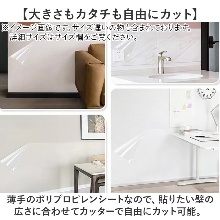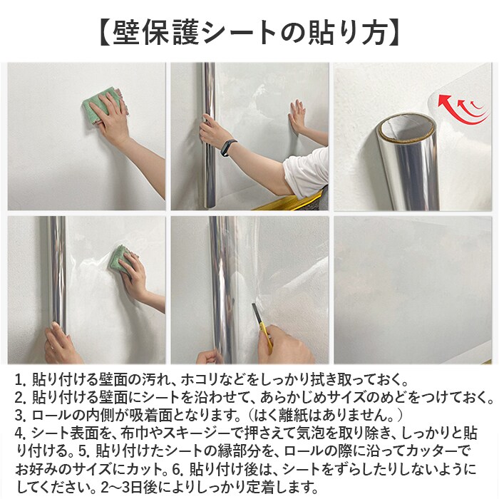 | 注意点 | 【壁保護シートの貼り方】1.貼り付ける壁面の汚れ、ホコリなどをしっかり拭き取っておく。2.貼り付ける壁面にシートを沿わせて、あらかじめサイズのめどをつけておく。3.ロールの内側が吸着面となります。(はく離紙はありません。)4.シート表面を、布巾やスキージーで押さえて気泡を取り除き、しっかりと貼り付ける。5.貼り付けたシートの縁部分を、ロールの際に沿ってカッターでお好みのサイズにカット。6.貼り付け後は、シートをずらしたりしないようにしてください。2~3日後によりしっかり定着します。海外輸入品のため、商品によってはパッケージや説明書が、英語や中国語表記となっている場合があります。商品を安価でご提供させていただくため、輸入時のパッケージのままでのお届けとなります。予めご了承くださいませ。海外輸入品のため、パッケージに破れ、傷やへこみがある場合がございます。本体には問題ございませんので、予めご了承くださいませ。商品の写真はできる限り実物のお色に近づけるように加工しておりますが、お使いのモニター設定、お部屋の照明などにより、実際の商品と異なる場合がございます。商品や個体差などにより、表記と若干異なる場合がございますが、予めご了承くださいませ。採寸方法の違いにより、多少の誤差がある場合がございます。こちらの商品本体、及び商品についている印字やタグに関しては、海外メーカー独自のサイズ情報や表記になります。実際には、当社にて日本向けに正しい情報をページに掲載させて頂いております。 |