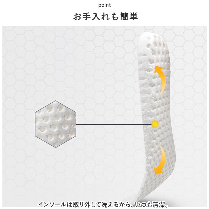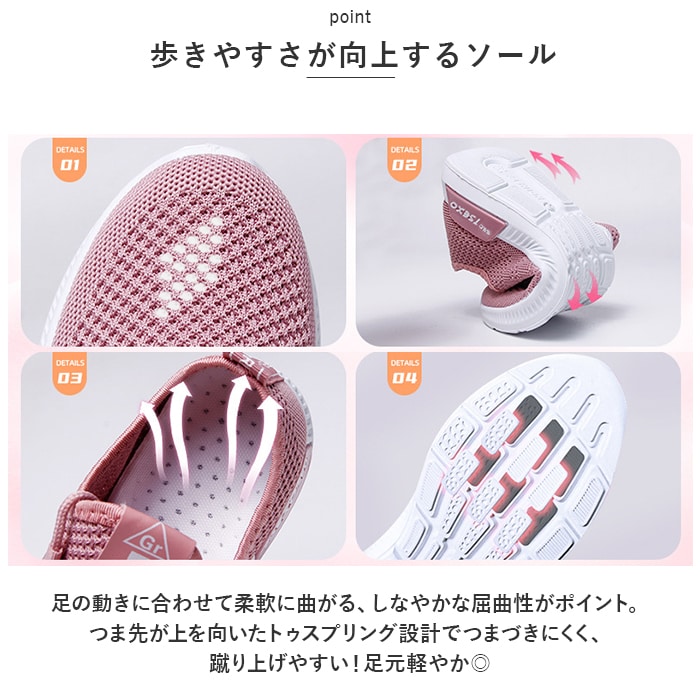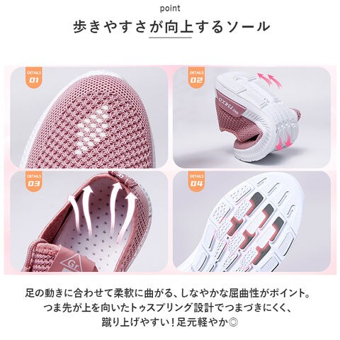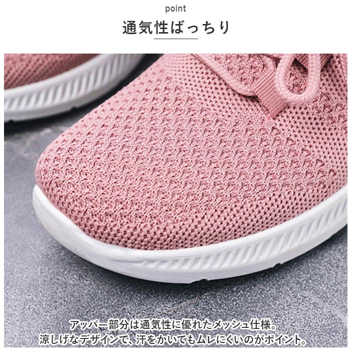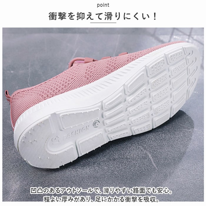 | 商品説明 | うれしい軽量設計!アクティブに動けてデイリー使いにぴったりな、レディーススニーカーが新登場。【ストレスフリーな履き心地】足に負担がかかりにくい、軽量なつくり。長時間歩いたり移動の多い日も疲れを軽減◎【通気性ばっちり】アッパー部分は通気性に優れたメッシュ仕様。涼しげなデザインで、汗をかいてもムレにくいのがポイント。【足入れがスムーズ】柔らかな素材&かかとにはプルタブ付き。紐を結んだ状態でも足入れラクラク。【歩きやすさが向上するソール】足の動きに合わせて柔軟に曲がる、しなやかな屈曲性がポイント。つま先が上を向いたトゥスプリング設計でつまづきにくく、蹴り上げやすい!足元軽やか◎【お手入れも簡単】インソールは取り外して洗えるから、いつも清潔。【衝撃を抑えて滑りにくい!】凹凸のあるアウトソールで、滑りやすい路面でも安心。程よい厚みがあり、足にかかる衝撃を吸収。【色々なシーンで活躍】お出かけや通勤・通学、ウォーキングやちょっとした運動にも最適。気軽に履きやすいデザインと機能性が魅力。 |