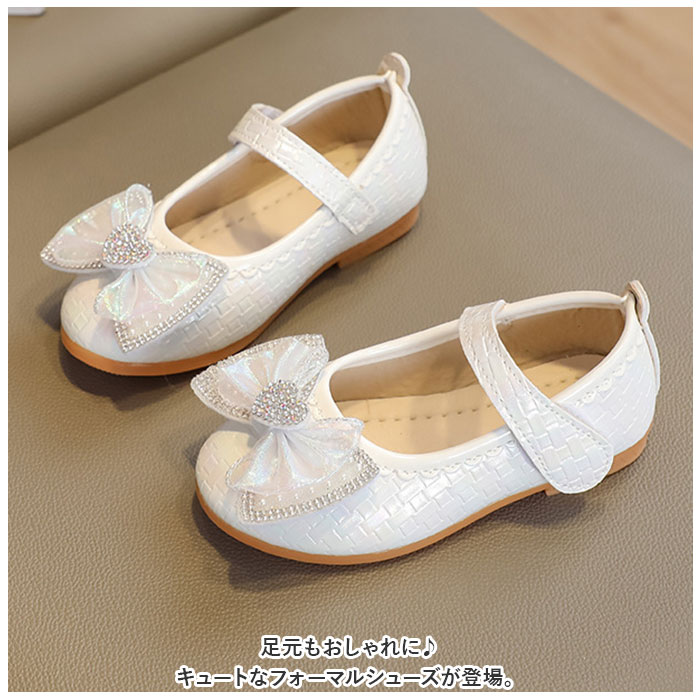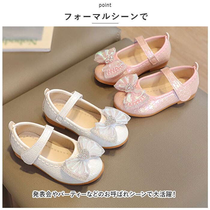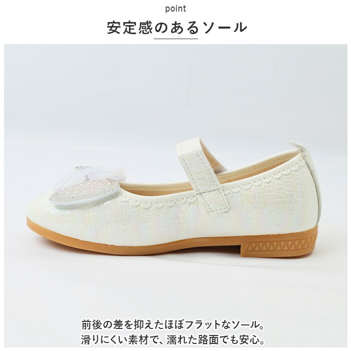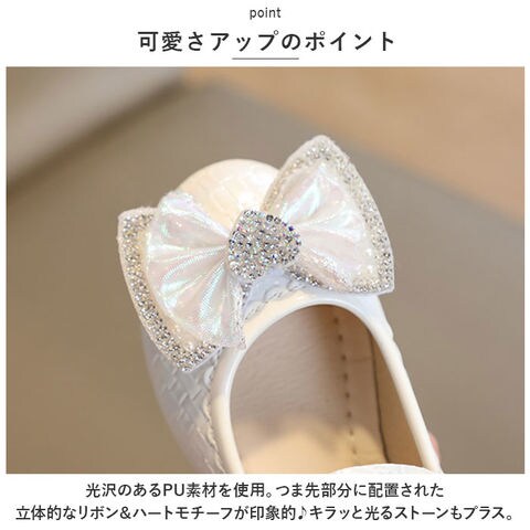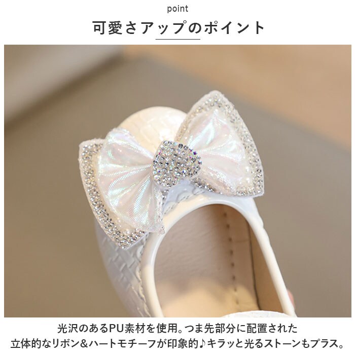 | 商品説明 | 足元もおしゃれに♪キュートなフォーマルシューズが登場。【可愛さアップのポイント】光沢のあるPU素材を使用。つま先部分に配置された立体的なリボン&ハートモチーフが印象的♪キラッと光るストーンもプラス。【面ファスナーで着脱カンタン】ストラップは面ファスナー式なので、お子さま1人でも脱ぎ履きラクラク。【歩きやすさが向上】屈曲性があり、つま先にかけてやや上を向いた形状。つまづきにくく、蹴り上げやすい!【安定感のあるソール】前後の差を抑えたほぼフラットなソール。滑りにくい素材で、濡れた路面でも安心。【フォーマルシーンで】発表会やパーティーなどのお呼ばれシーンで大活躍! |