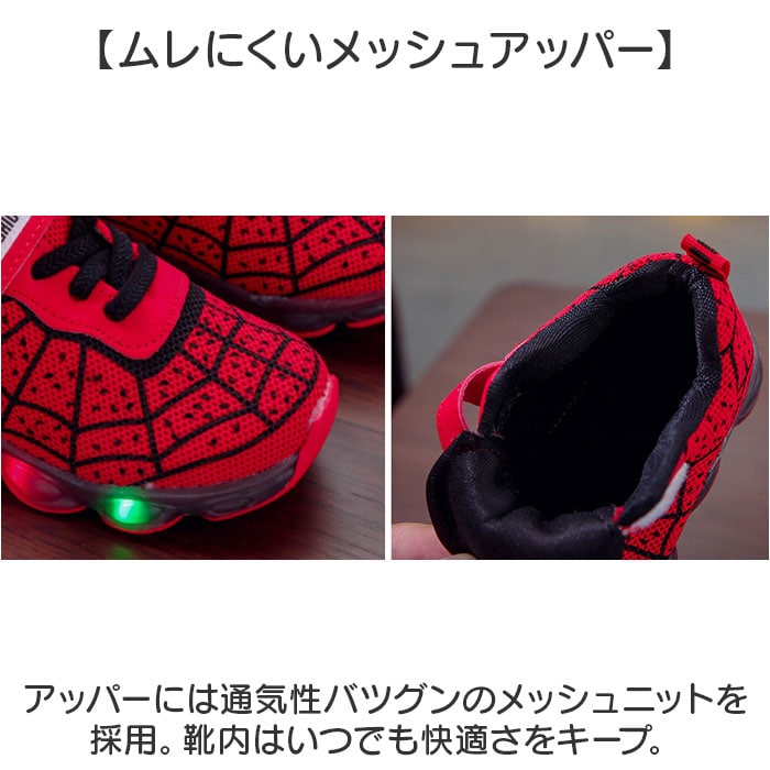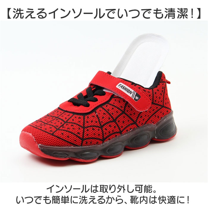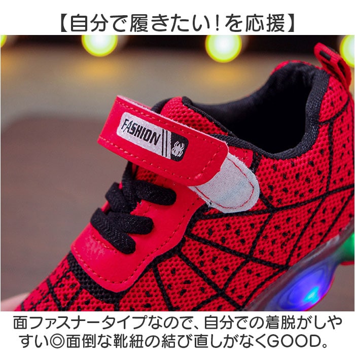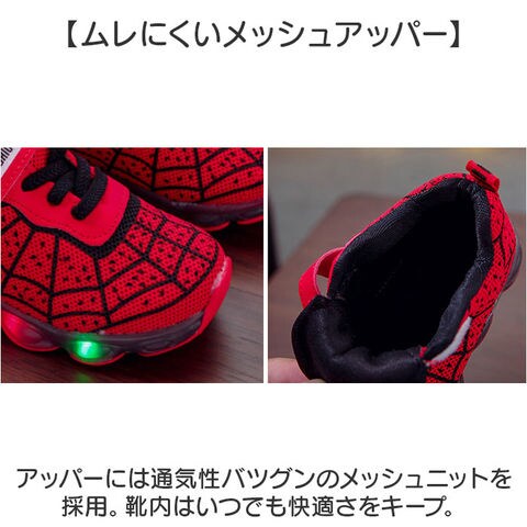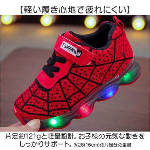 | 商品説明 | 【ピカピカ光る靴でテンションUP☆】柔らか素材でお子様の足を優しく包み込む「光るシューズ 子供用」が登場。【カラフルライトで楽しくお出かけ☆】歩く度にピカピカ光るライトが、楽しい気分をグーンとUPさせる!たくさん歩くのが楽しい♪【しっかりラバーで滑りにくい】アウトソールにはラバーを配置。滑りにくさはもちろん、足への衝撃を分散させる作り◎【軽い履き心地で疲れにくい】片足約121gと軽量設計。お子様の元気な動きをしっかりサポート。※28(16cm)の片足分の重量【ムレにくいメッシュアッパー】アッパーには通気性バツグンのメッシュニットを採用。靴内はいつでも快適さをキープ。【自分で履きたい!を応援】面ファスナータイプなので、自分での着脱がしやすい◎面倒な靴紐の結び直しがなくGOOD。【洗えるインソールでいつでも清潔!】インソールは取り外し可能。いつでも簡単に洗えるから、靴内は快適に! |