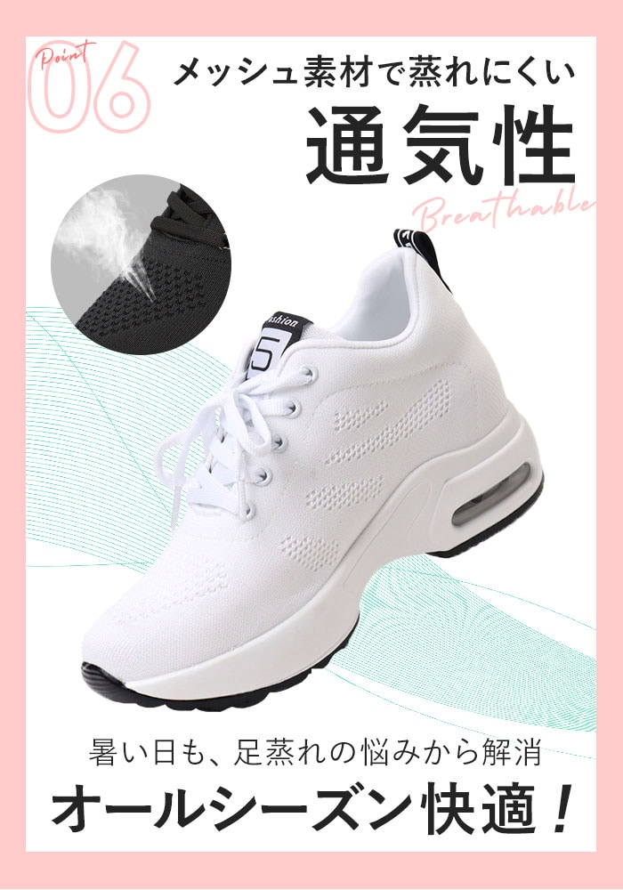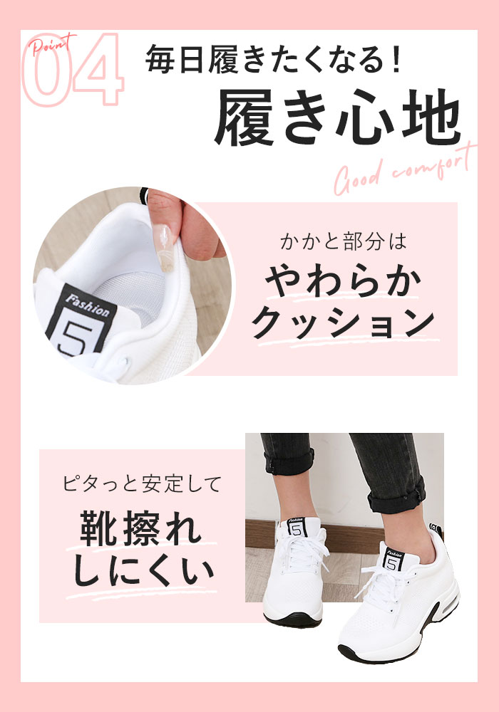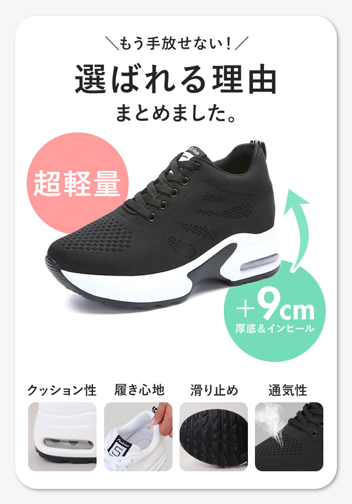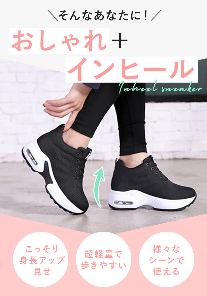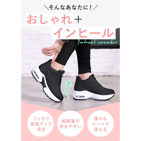 | 商品説明 | こっそりスタイルアップするインヒールスニーカーが登場!厚底のソールとインヒール合わせて約8cmの高さで脚長効果抜群◎通気性のあるニット生地を使用し、蒸れにくい作りに♪夏でも快適な履き心地が嬉しいオールシーズン仕様。踏み込む時の衝撃を吸収し歩行をサポートしてくれるエアクッションをかかとに内蔵。靴底には凹凸加工があり、お店や駅構内のタイル張り床でも滑りにくく安心。歩きやすい軽量タイプだから、疲れにくいのも嬉しいポイント。ベーシックなカラーバリエーション、どんなコーデにも合わせやすいアイテム。 |
