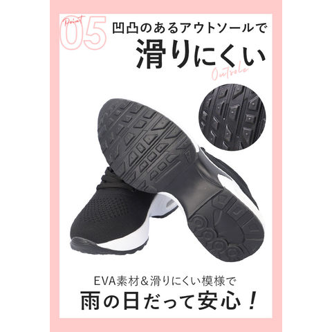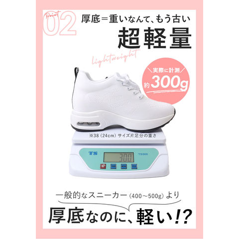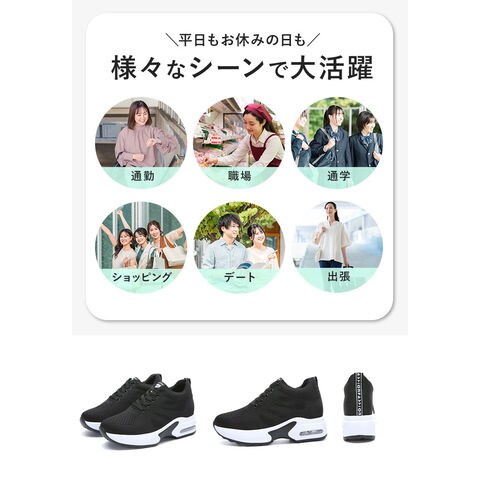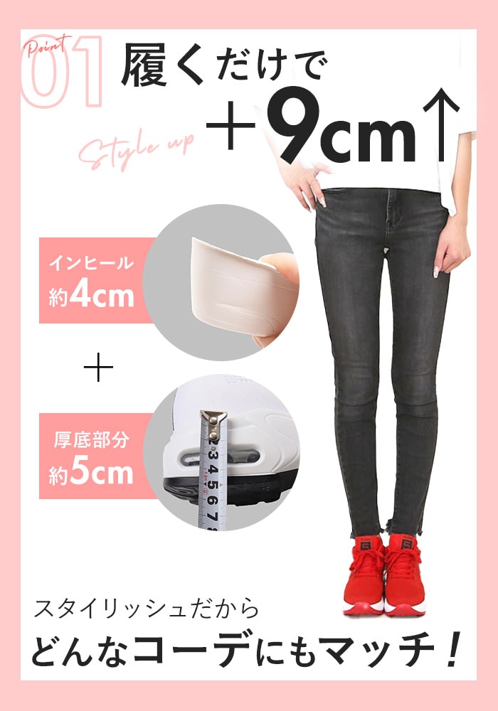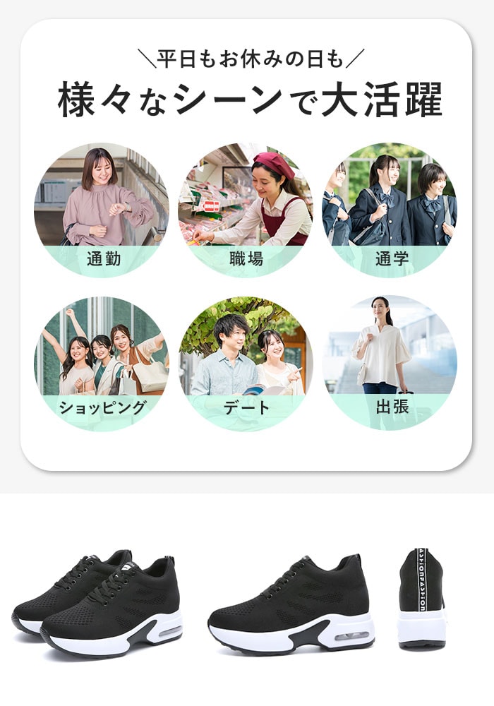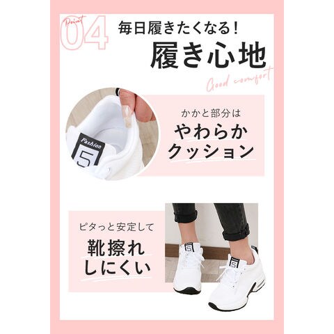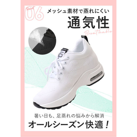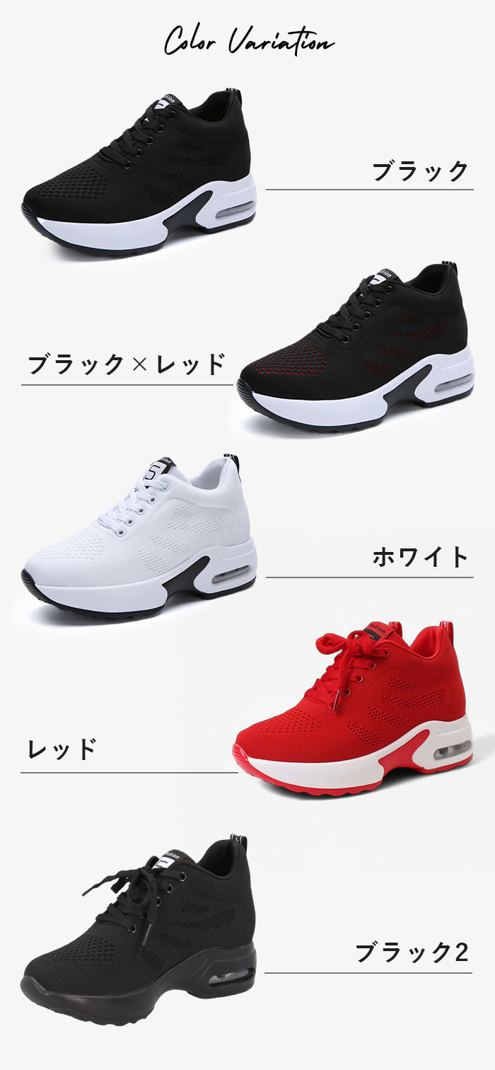| 商品説明 | こっそりスタイルアップするインヒールスニーカーが登場!厚底のソールとインヒール合わせて約8cmの高さで脚長効果抜群◎通気性のあるニット生地を使用し、蒸れにくい作りに♪夏でも快適な履き心地が嬉しいオールシーズン仕様。踏み込む時の衝撃を吸収し歩行をサポートしてくれるエアクッションをかかとに内蔵。靴底には凹凸加工があり、お店や駅構内のタイル張り床でも滑りにくく安心。歩きやすい軽量タイプだから、疲れにくいのも嬉しいポイント。ベーシックなカラーバリエーション、どんなコーデにも合わせやすいアイテム。 |
