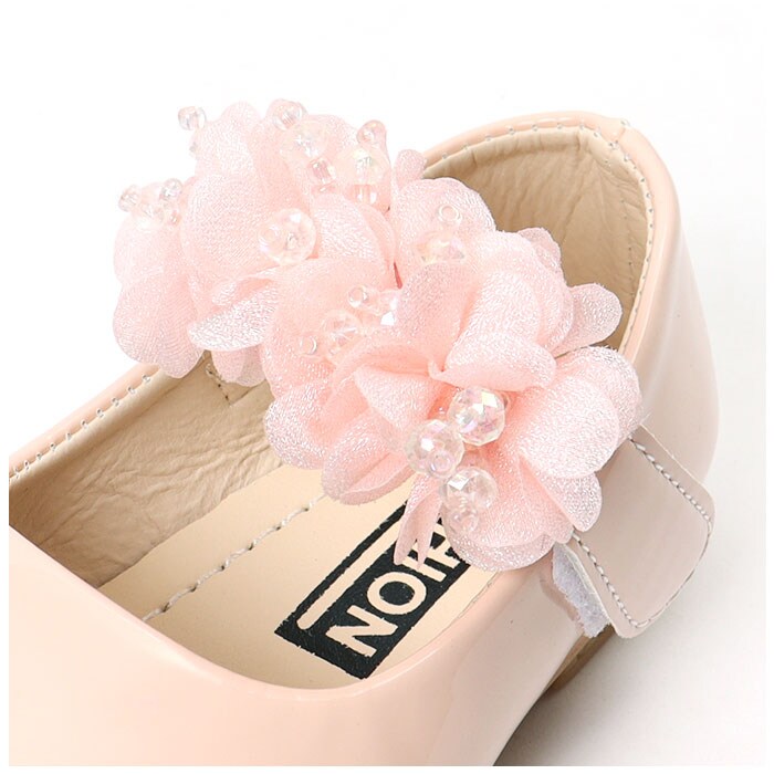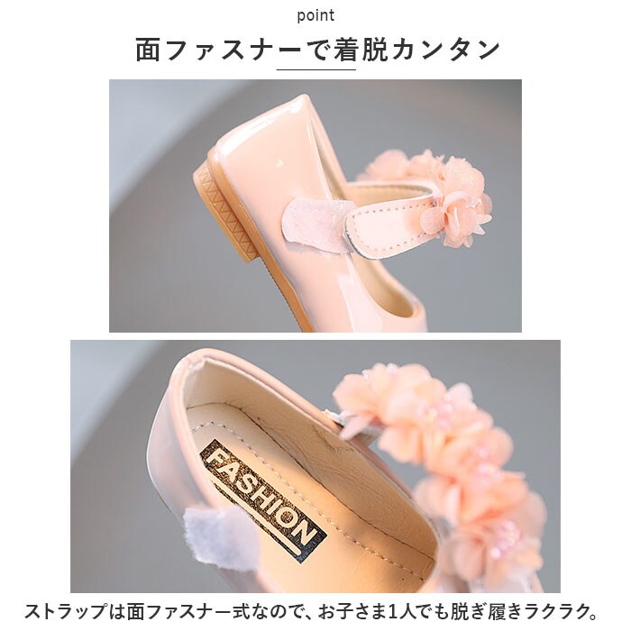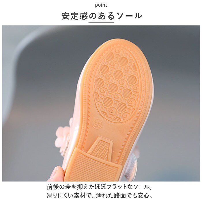 | 商品説明 | 足元もおしゃれに♪キュートなフォーマルシューズが登場。【可愛さアップのポイント】ツヤのあるシンプルなボディ。ストラップ部分に配置された、立体的なフラワーモチーフがアクセント♪キラッと感のあるビーズもプラス。【面ファスナーで着脱カンタン】ストラップは面ファスナー式なので、お子さま1人でも脱ぎ履きラクラク。【歩きやすさが向上】屈曲性があり、つま先にかけてやや上を向いた形状。つまづきにくく、蹴り上げやすい!【安定感のあるソール】前後の差を抑えたほぼフラットなソール。滑りにくい素材で、濡れた路面でも安心。【フォーマルシーンで】発表会やパーティーなどのお呼ばれシーンで大活躍! |