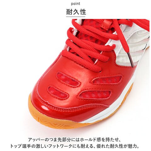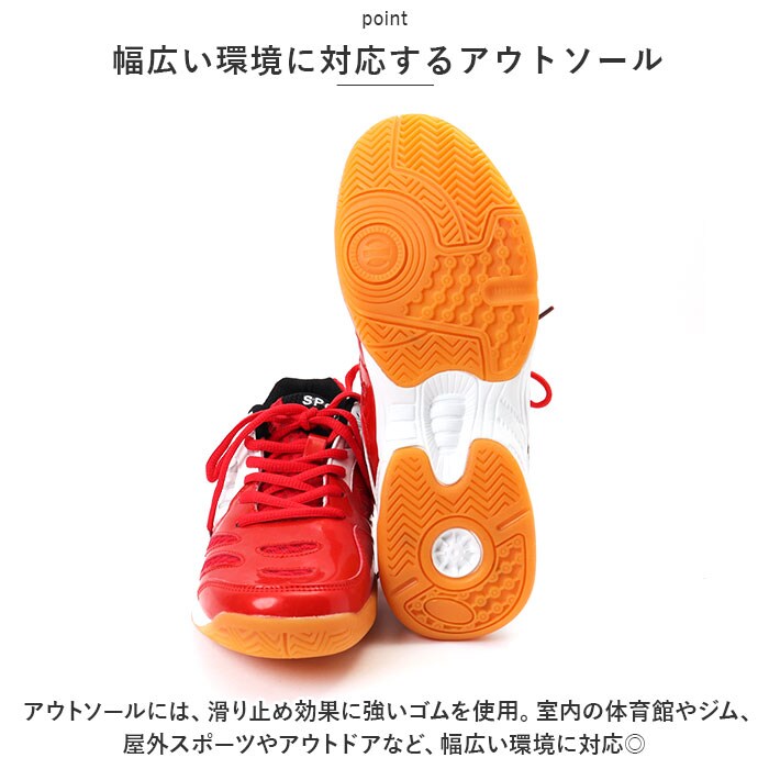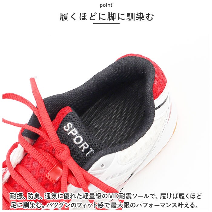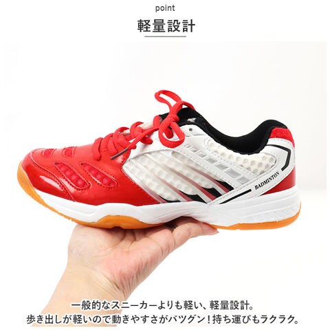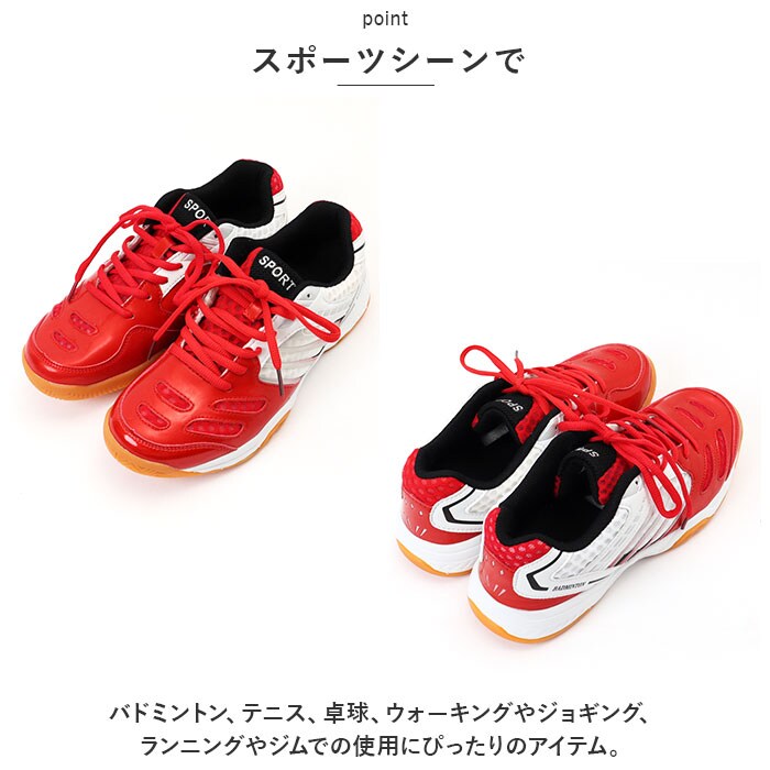 | 商品説明 | 高機能シューズで、最大限のパフォーマンスを!スポーツシューズが登場。【スポーツシーンで】バドミントン、テニス、卓球、ウォーキングやジョギング、ランニングやジムでの使用にぴったりのアイテム。【耐久性】アッパーのつま先部分にはホールド感を持たせ、トップ選手の激しいフットワークにも耐える、優れた耐久性が魅力。【幅広い環境に対応するアウトソール】アウトソールには、滑り止め効果に強いゴムを使用。室内の体育館やジム、屋外スポーツやアウトドアなど、幅広い環境に対応◎【履くほどに脚に馴染む】耐振、防臭、通気に優れた軽量級のMD耐震ソールで、履けば履くほど足に馴染む。バツグンのフィット感で最大限のパフォーマンス叶える。【軽量設計】一般的なスニーカーよりも軽い、軽量設計。歩き出しが軽いので動きやすさがバツグン!持ち運びもラクラク。【スタイリッシュデザイン】学生も大人も、男性も女性も履けるスタイリッシュなデザイン。部活動から趣味のスポーツまで幅広く使える。友達や家族、カップルでお揃いにするのもGOOD。【タウンユースも】デザイン性が高いので、もちろんタウンユースでも使える!滑りにくいので雨の日にも最適。ファッションのアクセントにも☆ |