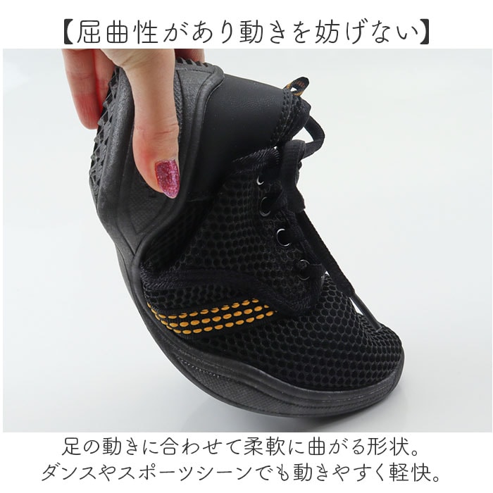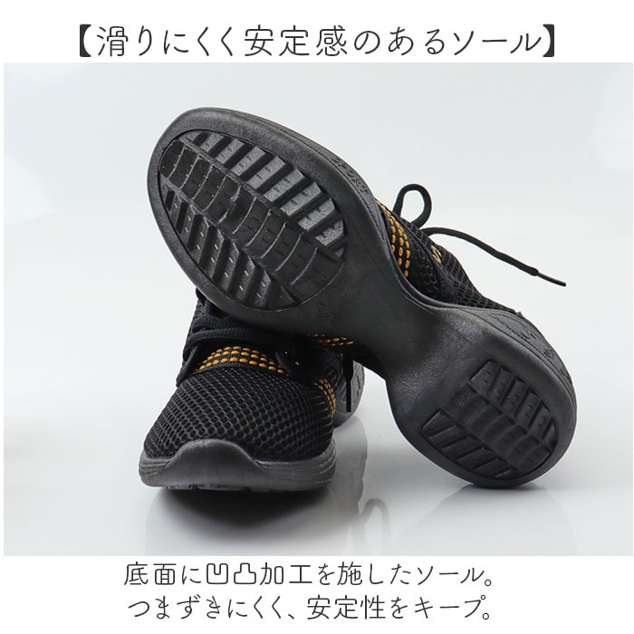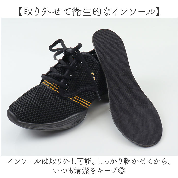 | 商品説明 | 【足に優しく馴染む軽やかシューズ】ダンスはもちろん!ジムなどでのエクササイズのお供にも使える「ダンスシューズ」。【通気性があり爽やかな履き心地】表面アッパーやサイドはメッシュ素材。シューズ内がムレにくく、汗ばむ季節も快適。【かかとまわりは優しくホールド】かかと部分には異素材を使い、脱げにくいつくり。激しいダンスにも対応。【フィット感を高めるシューレース】紐の結び具合で多少のサイズ調節が可能。シューズと足が一体化するような着用感。(※)バックにプルタブ付きです。【屈曲性があり動きを妨げない】足の動きに合わせて柔軟に曲がる形状。ダンスやスポーツシーンでも動きやすく軽快。【滑りにくく安定感のあるソール】底面に凹凸加工を施したソール。つまずきにくく、安定性をキープ。【取り外せて衛生的なインソール】インソールは取り外し可能。しっかり乾かせるから、いつも清潔をキープ◎【お気に入りを選べるカラー】ベーシックや差し色をラインナップ。色味を変えた刺繍やラインデザインがアクセント。 |