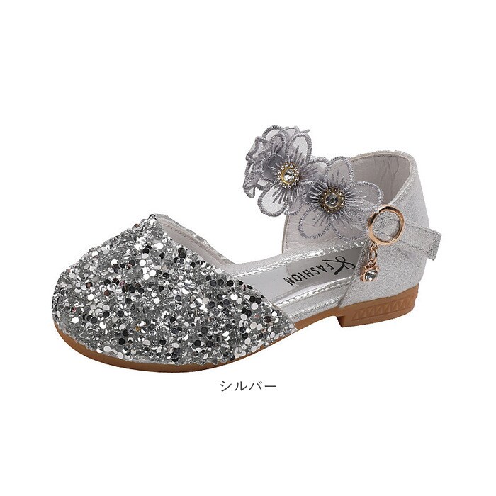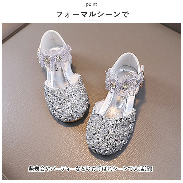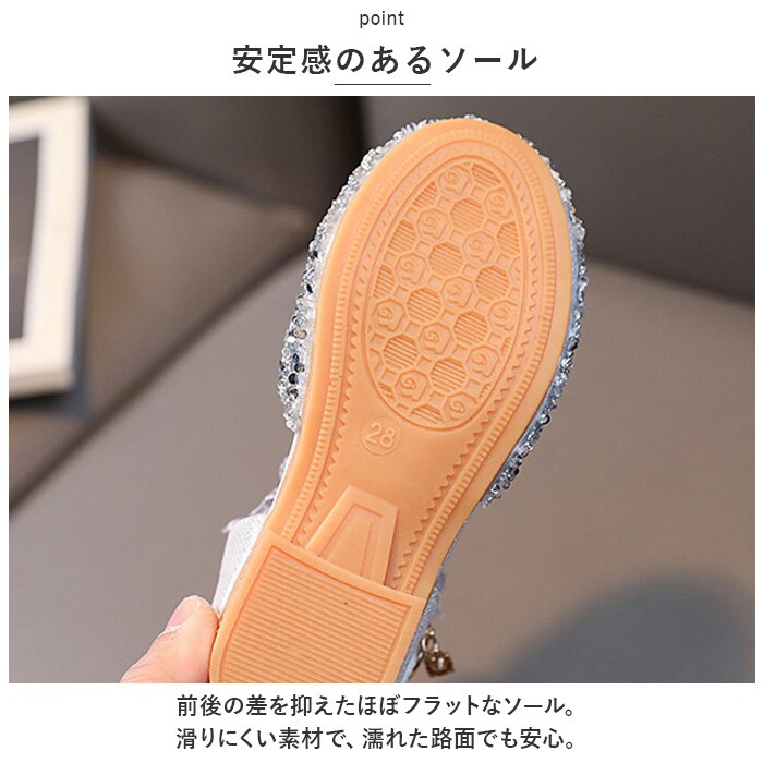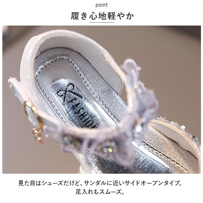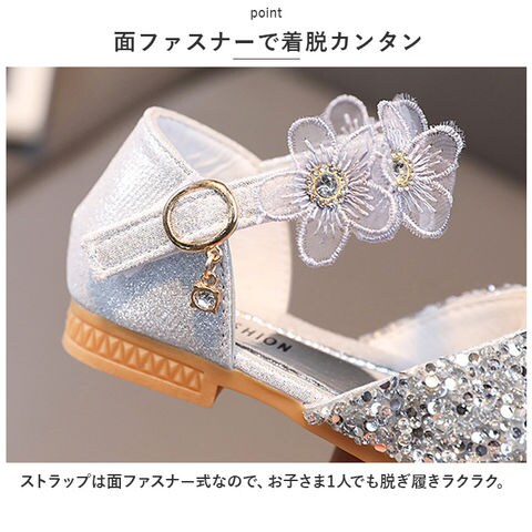 | 商品説明 | 足元もおしゃれに♪キュートなフォーマルシューズが登場。【存在感のある1足】キラキラ輝いて、お姫様気分になれるシューズ☆アッパーにはストーンを散りばめ、かかとにも程よい光沢感◎ストラップ部分のフラワーモチーフやチャームもアクセント。【面ファスナーで着脱カンタン】ストラップは面ファスナー式なので、お子さま1人でも脱ぎ履きラクラク。【歩きやすさが向上】屈曲性があり、つま先がやや上を向いた形状。つまづきにくく、蹴り上げやすい!【履き心地軽やか】見た目はシューズだけど、サンダルに近いサイドオープンタイプ。足入れもスムーズ。【安定感のあるソール】前後の差を抑えたほぼフラットなソール。滑りにくい素材で、濡れた路面でも安心。【フォーマルシーンで】発表会やパーティーなどのお呼ばれシーンで大活躍! |