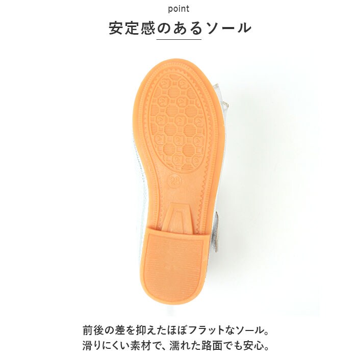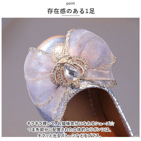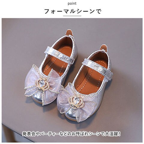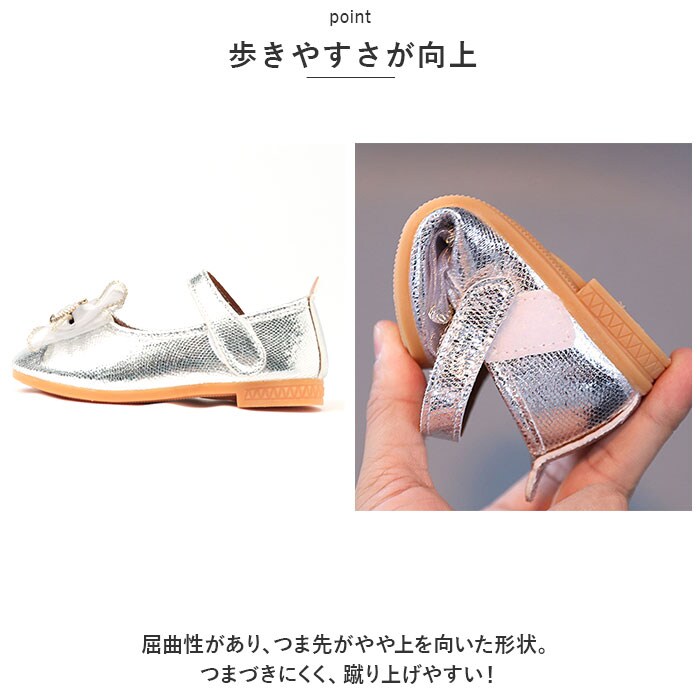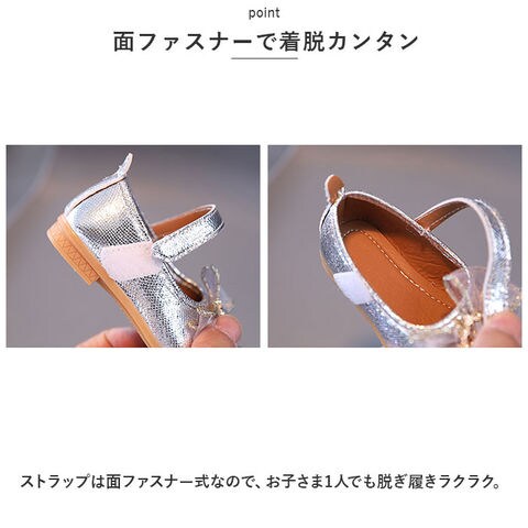 | 商品説明 | 足元もおしゃれに♪キュートなフォーマルシューズが登場。【存在感のある1足】キラキラ輝いて、お姫様気分になれるシューズ☆つま先部分に配置された立体的なリボンには、キラッと光るストーンなどをプラス。【面ファスナーで着脱カンタン】ストラップは面ファスナー式なので、お子さま1人でも脱ぎ履きラクラク。【歩きやすさが向上】屈曲性があり、つま先がやや上を向いた形状。つまづきにくく、蹴り上げやすい!【安定感のあるソール】前後の差を抑えたほぼフラットなソール。滑りにくい素材で、濡れた路面でも安心。【フォーマルシーンで】発表会やパーティーなどのお呼ばれシーンで大活躍! |