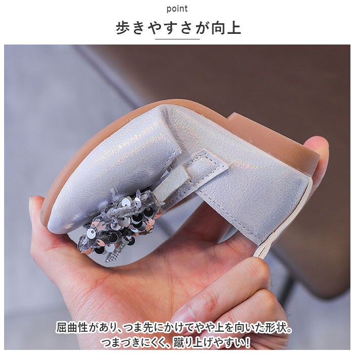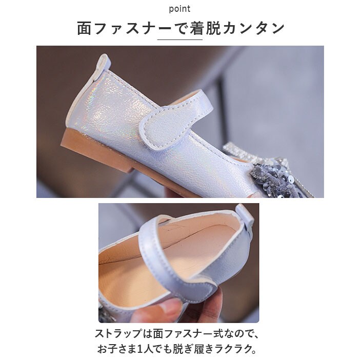 | 商品説明 | 足元もおしゃれに♪キュートなフォーマルシューズが登場。【可愛さアップのポイント】上品な光沢のある仕上がり。つま先部分に配置された立体的なリボンが印象的で、キラッと光るストーンやスパンコールもプラス。【面ファスナーで着脱カンタン】ストラップは面ファスナー式なので、お子さま1人でも脱ぎ履きラクラク。【歩きやすさが向上】屈曲性があり、つま先にかけてやや上を向いた形状。つまづきにくく、蹴り上げやすい!【安定感のあるソール】前後の差を抑えたほぼフラットなソール。滑りにくい素材で、濡れた路面でも安心。【フォーマルシーンで】発表会やパーティーなどのお呼ばれシーンで大活躍! |