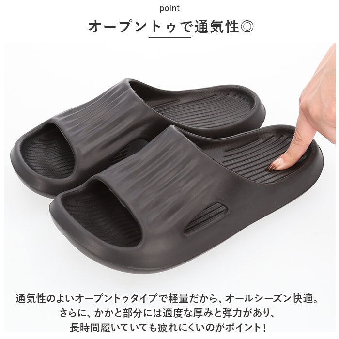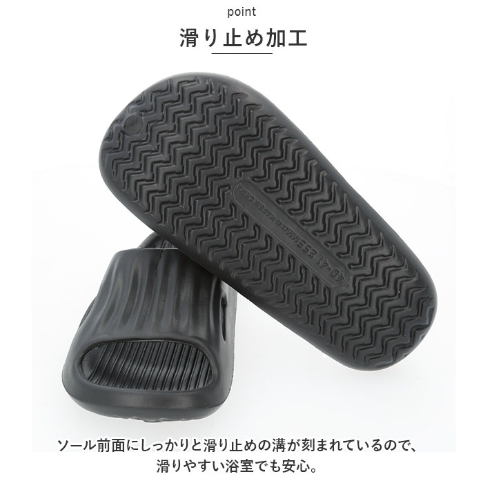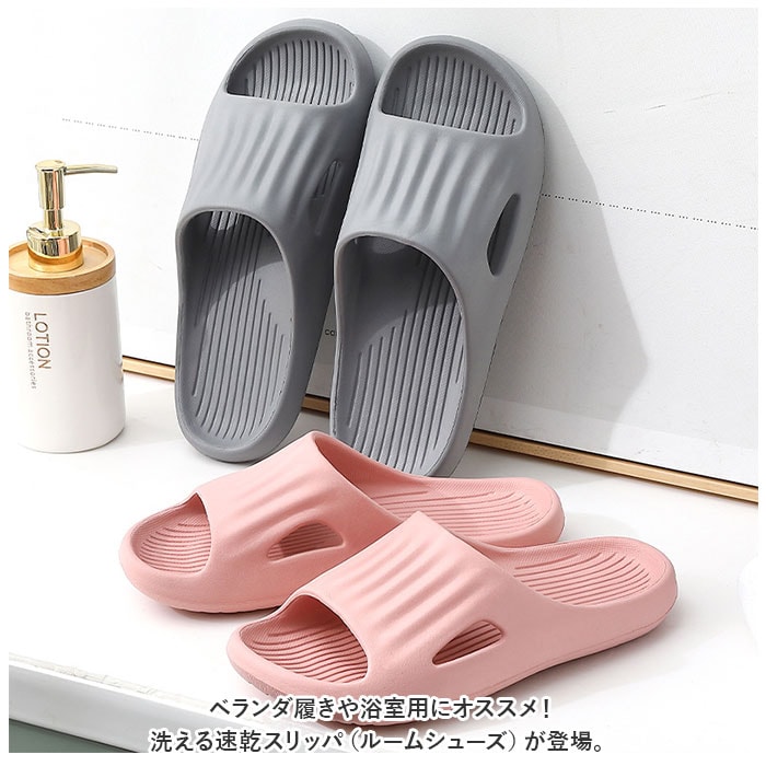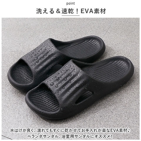 | 商品説明 | ベランダ履きや浴室用にオススメ!洗える速乾スリッパ(ルームシューズ)が登場。【洗える&速乾!EVA素材】水はけが良く、濡れてもすぐに乾かせてお手入れが楽なEVA素材♪ベランダサンダル、浴室用サンダルにオススメ!【滑り止め加工】ソール前面にしっかりと滑り止めの溝が刻まれているので、滑りやすい浴室でも安心。【オープントゥで通気性◎】通気性のよいオープントゥタイプで軽量だから、オールシーズン快適。さらに、かかと部分には適度な厚みと弾力があり、長時間履いていても疲れにくいのがポイント!【サイズとカラーが豊富】サイズとカラーが豊富なので自分サイズのお気に入りの色がチョイスできる◎ |