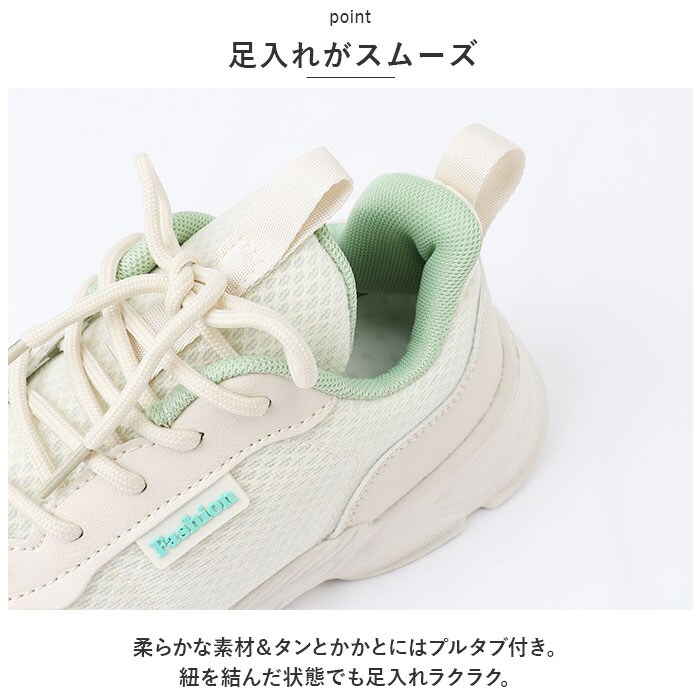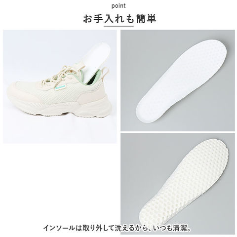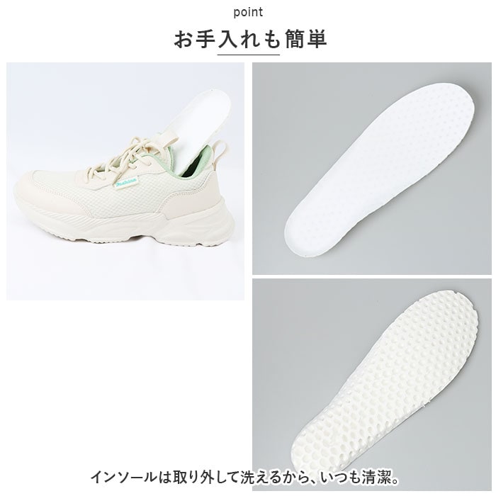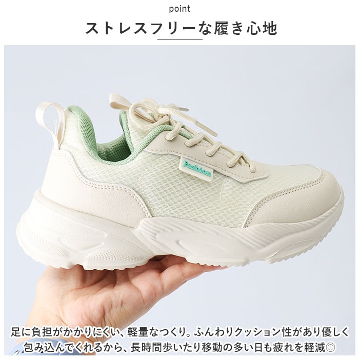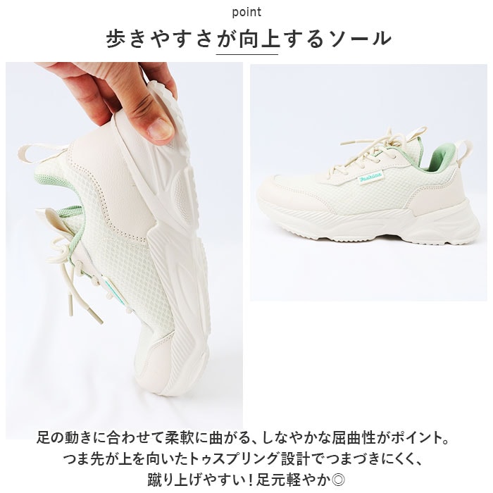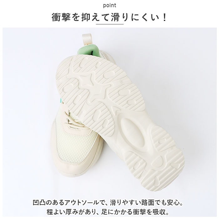| 商品説明 | うれしい軽量設計!アクティブに動けてデイリー使いにぴったりな、レディーススニーカーが新登場。【ストレスフリーな履き心地】足に負担がかかりにくい、軽量なつくり。ふんわりクッション性があり優しく包み込んでくれるから、長時間歩いたり移動の多い日も疲れを軽減◎【通気性ばっちり】アッパー部分は通気性に優れたメッシュ仕様。涼しげなデザインで、汗をかいてもムレにくいのがポイント。【足入れがスムーズ】柔らかな素材&タンとかかとにはプルタブ付き。紐を結んだ状態でも足入れラクラク。【歩きやすさが向上するソール】足の動きに合わせて柔軟に曲がる、しなやかな屈曲性がポイント。つま先が上を向いたトゥスプリング設計でつまづきにくく、蹴り上げやすい!足元軽やか◎【お手入れも簡単】インソールは取り外して洗えるから、いつも清潔。【衝撃を抑えて滑りにくい!】凹凸のあるアウトソールで、滑りやすい路面でも安心。程よい厚みがあり、足にかかる衝撃を吸収。【色々なシーンで活躍】お出かけや通勤・通学、ウォーキングやちょっとした運動にも最適。気軽に履きやすいデザインと機能性が魅力。 |
