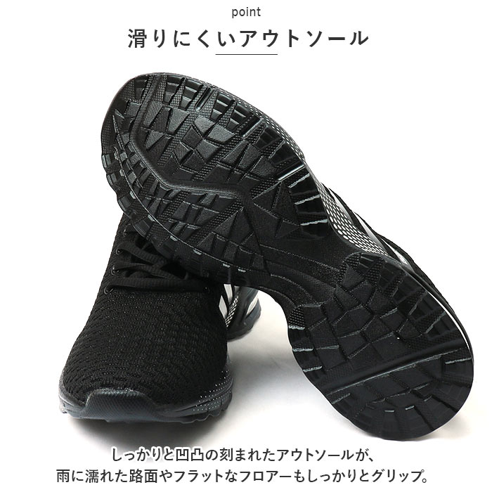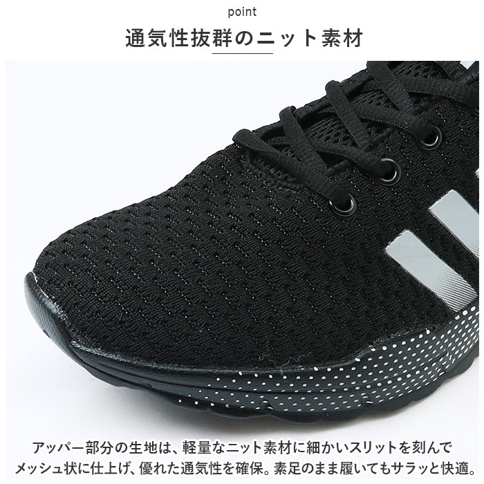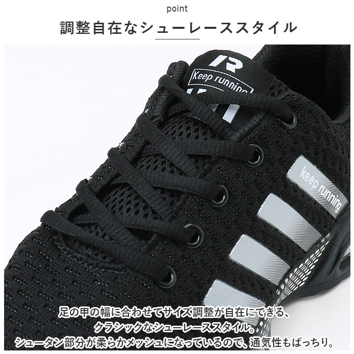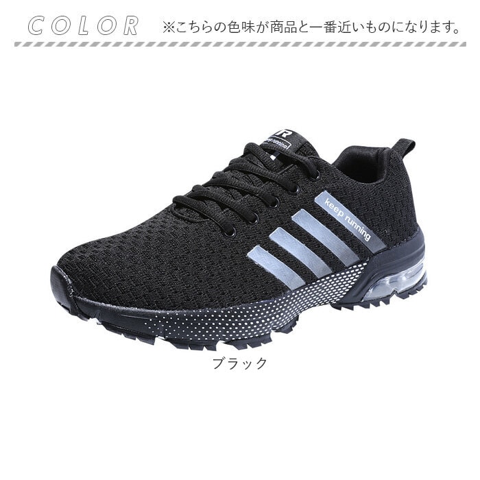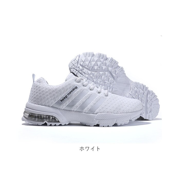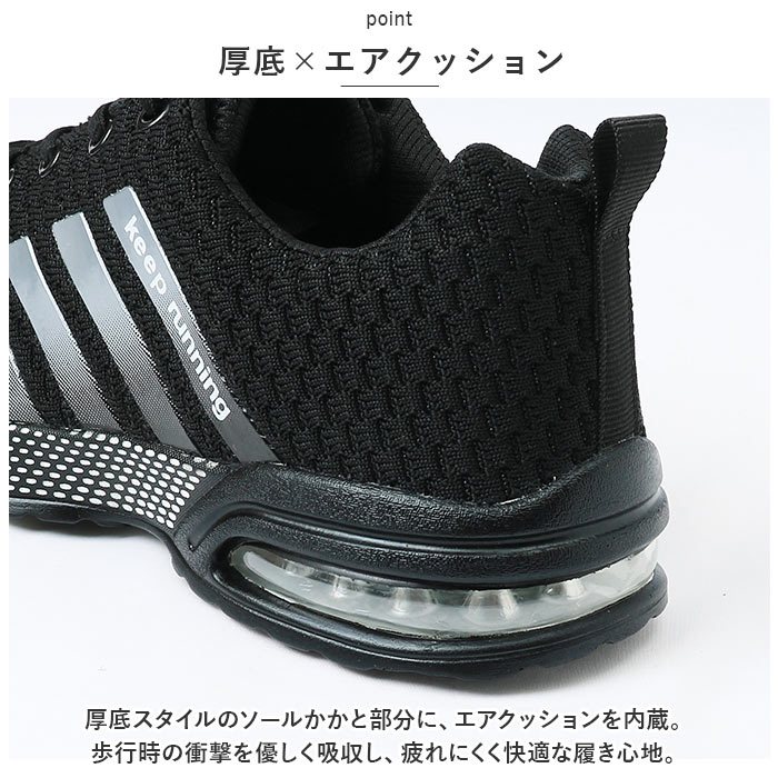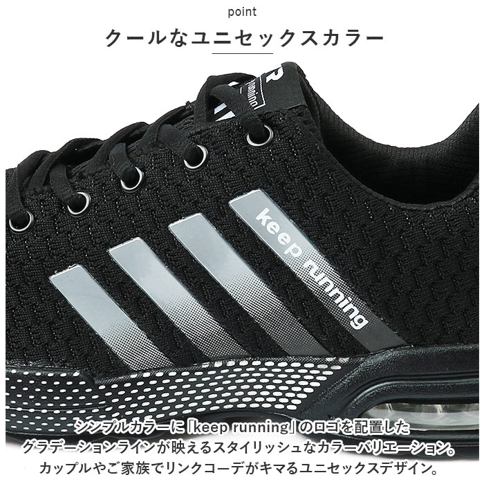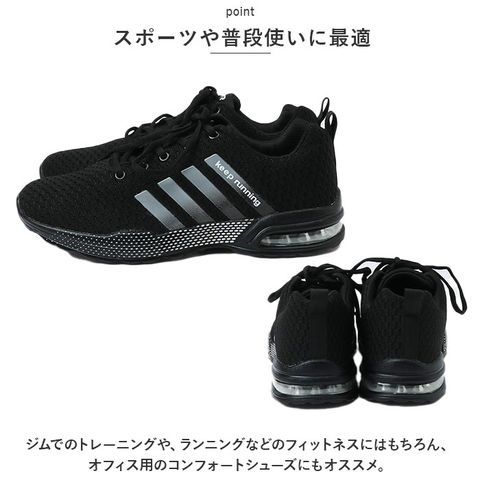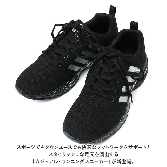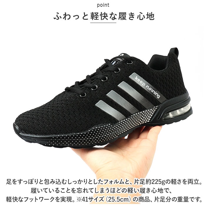 | 商品説明 | スポーツでもタウンユースでも快適なフットワークをサポート!スタイリッシュな足元を演出する「カジュアル・ランニングスニーカー」が新登場。【通気性抜群のニット素材】アッパー部分の生地は、軽量なニット素材に細かいスリットを刻んでメッシュ状に仕上げ、優れた通気性を確保。素足のまま履いてもサラッと快適。【厚底×エアクッション】厚底スタイルのソールかかと部分に、エアクッションを内蔵。歩行時の衝撃を優しく吸収し、疲れにくく快適な履き心地。【ふわっと軽快な履き心地】足をすっぽりと包み込むしっかりとしたフォルムと、片足約225gの軽さを両立。履いていることを忘れてしまうほどの軽い履き心地で、軽快なフットワークを実現。(※41サイズ(25.5cm)の商品、片足分の重量です。)【柔らかな履き口がフィット】履き口周りも厚みのあるクッション生地で仕上げ、足首やかかとを靴ズレから優しく保護。かかとのプルタブで着脱もスムーズ。【調整自在なシューレーススタイル】足の甲の幅に合わせてサイズ調整が自在にできる、クラシックなシューレーススタイル。シュータン部分が柔らかメッシュになっているので、通気性もばっちり。【滑りにくいアウトソール】しっかりと凹凸の刻まれたアウトソールが、雨に濡れた路面やフラットなフロアーもしっかりとグリップ。【いつでも清潔インソール】足裏のカーブにフィットするスポンジインソールは取り外しが可能。こまめにお手入れができて、いつでも清潔さをキープ。【スポーツや普段使いに最適】ジムでのトレーニングや、ランニングなどのフィットネスにはもちろん、ちょっとそこまでのお出掛けやオフィス用のコンフォートシューズにもオススメ。【クールなユニセックスカラー】シンプルカラーに「keep running」のロゴを配置したグラデーションラインが映えるスタイリッシュなカラーバリエーション。カップルやご家族でリンクコーデがキマるユニセックスデザイン。 |